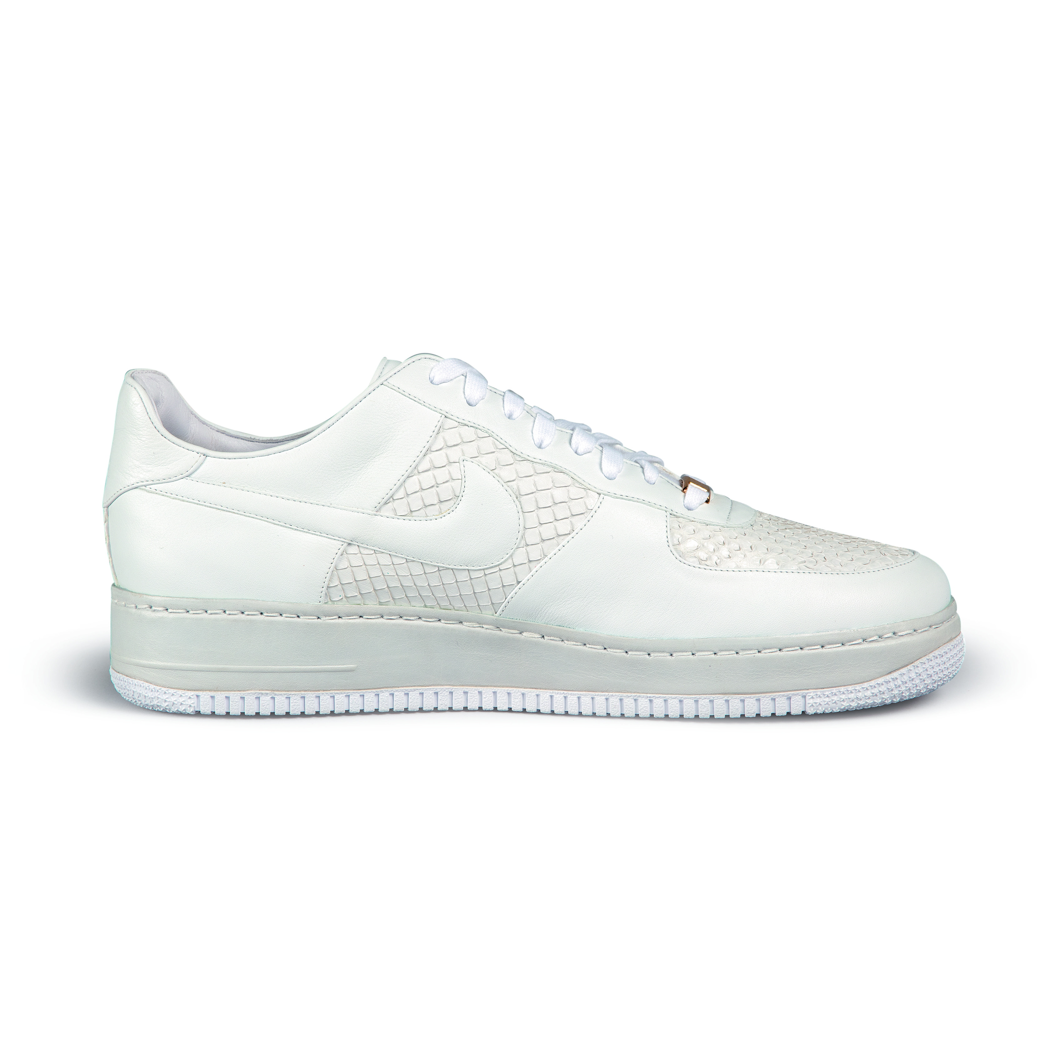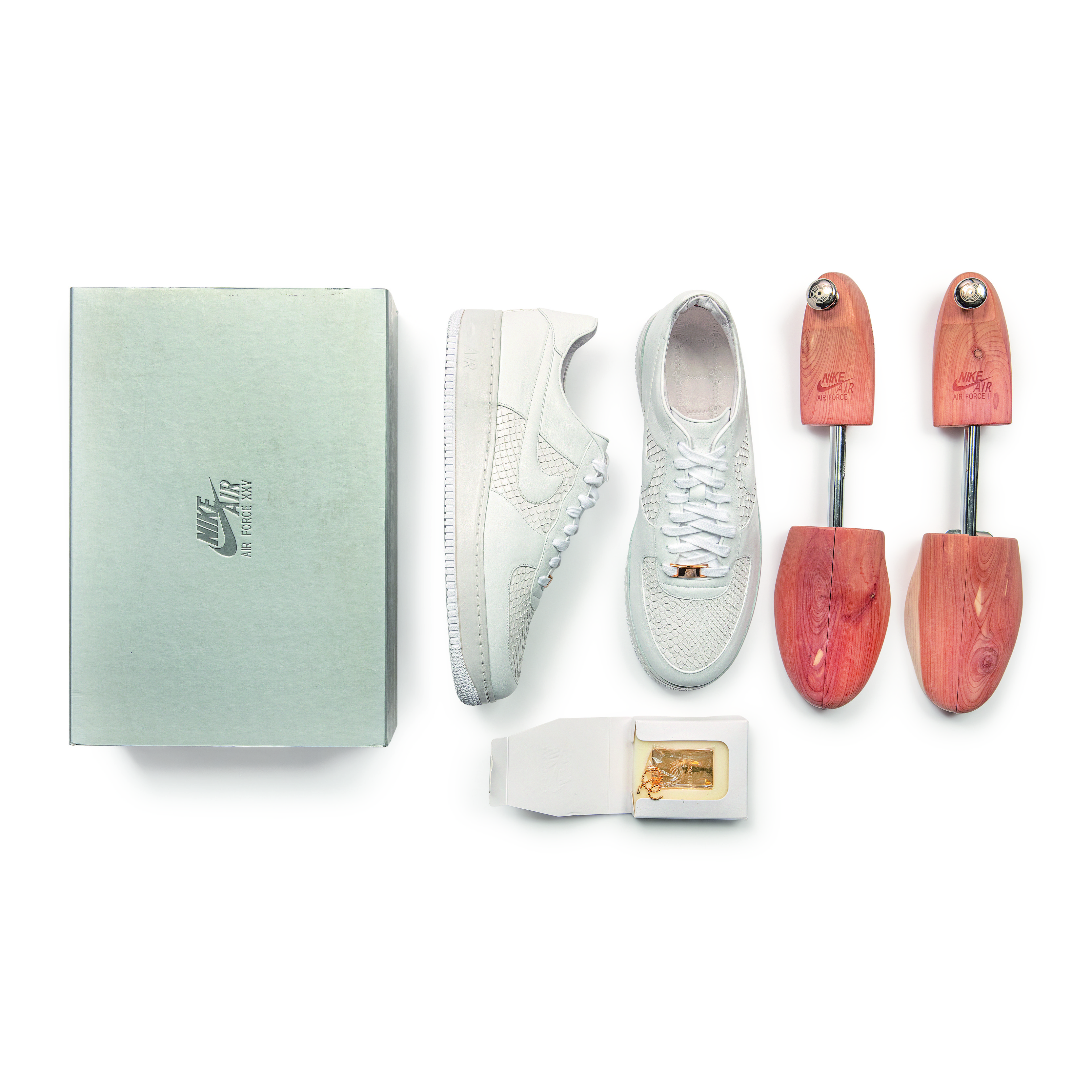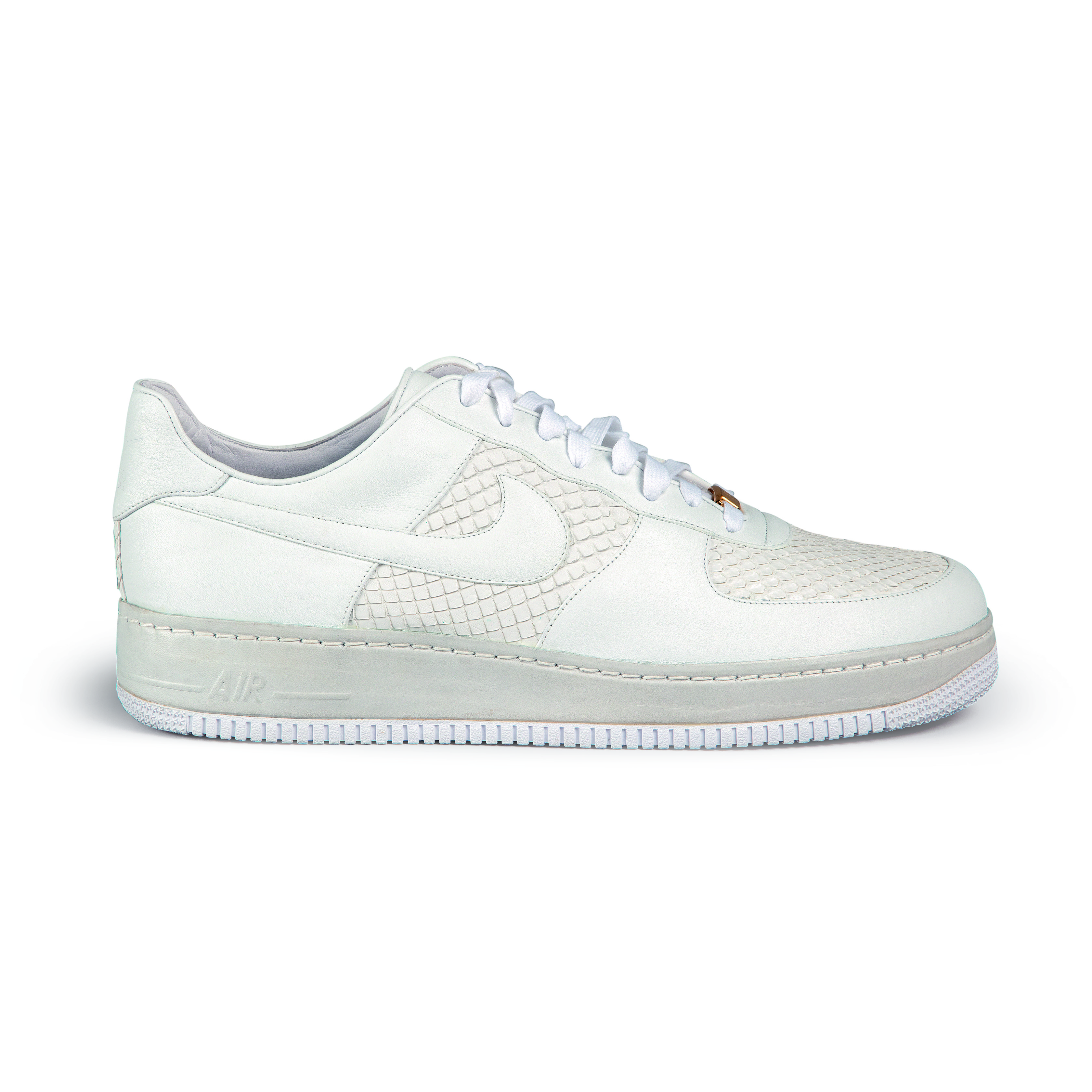 The celebrated and sought-after Low Lux 07 Anaconda was created in celebration of the 25th anniversary of the first Air Force 1. In 2007, this rare model was released in extremely limited numbers and marked the first time Nike released a four-digit retail price point to the public, alongside the Lux Crocodile model. Handcrafted in Italy with premium materials, the style features 24K gold-plated lace tip aglets and deubré. Originally released in 1982, the Air Force 1 is named after the presidential aircraft. Designed by Bruce Kilgore, it was the first basketball shoe to feature revolutionary air pocket technology. Today it is one of Nike’s most iconic, bestselling sneakers.This pair of Lux edition Air Force 1 sneakers is 1 of only 2500 released to commemorate the 25th anniversary of the original Air Force 1.Premium Italian supple white leather build features white anaconda snakeskin toe, quarter panel and heel accent. Air midsoles are lined with leather and outsoles feature textured detailing.24K gold-plated removable lace tips aglets and Air Force 1 deubré.Includes 24K gold-plated keychain and hangtag engraved with Brad Kilgore’s signature, cedar shoe trees and dust bag.Made in Italy.Style Number: 315583Color Code: 111This item is final sale and not eligible for return.