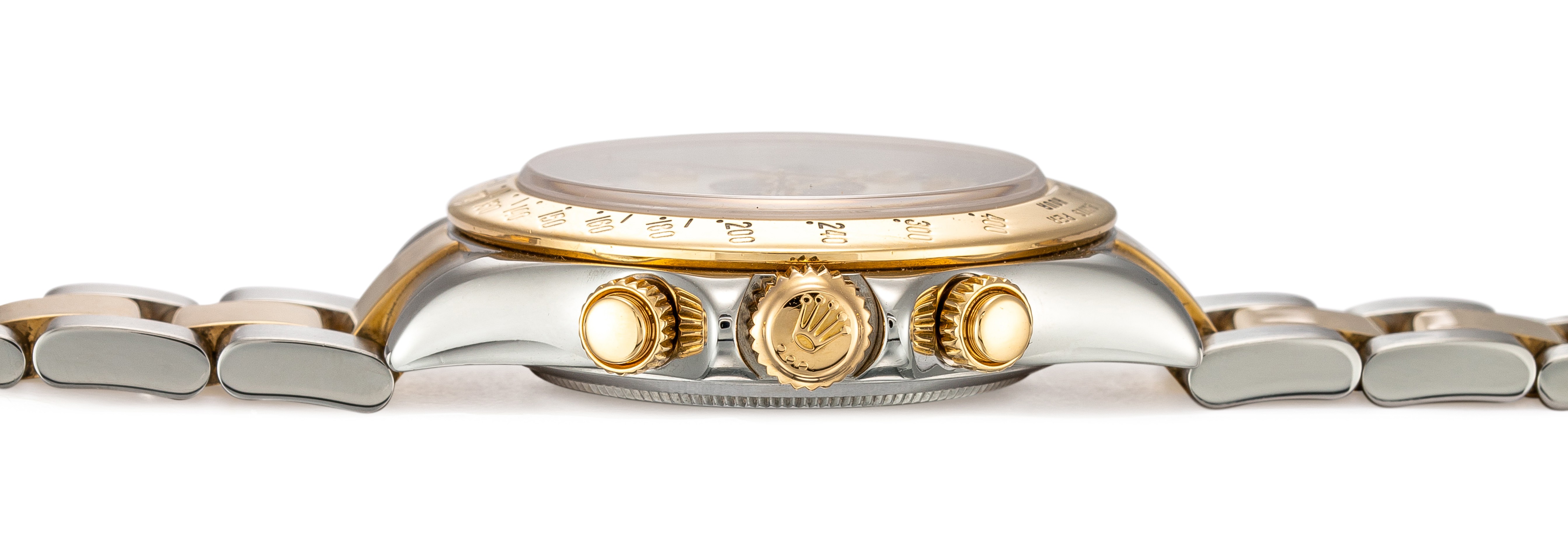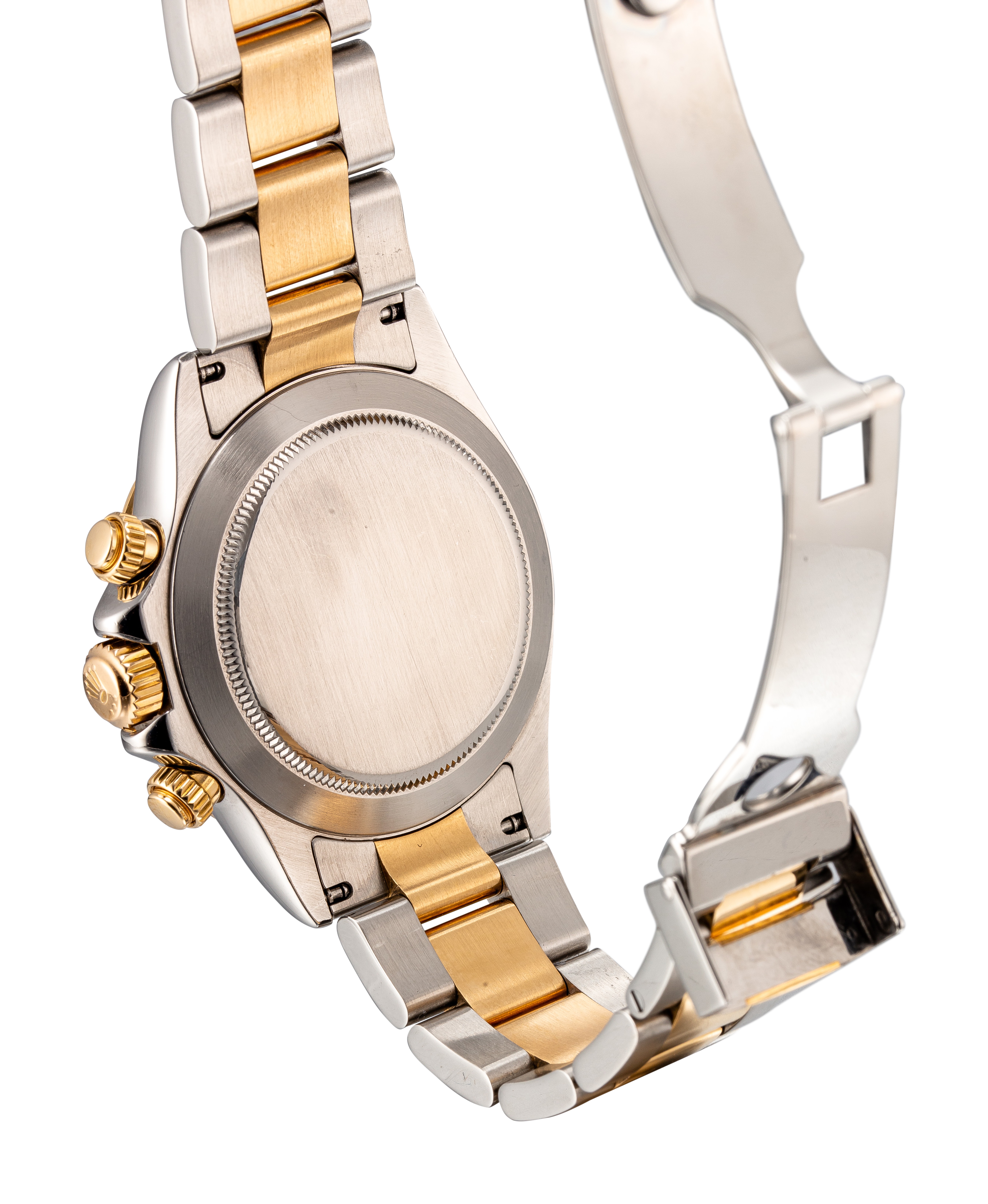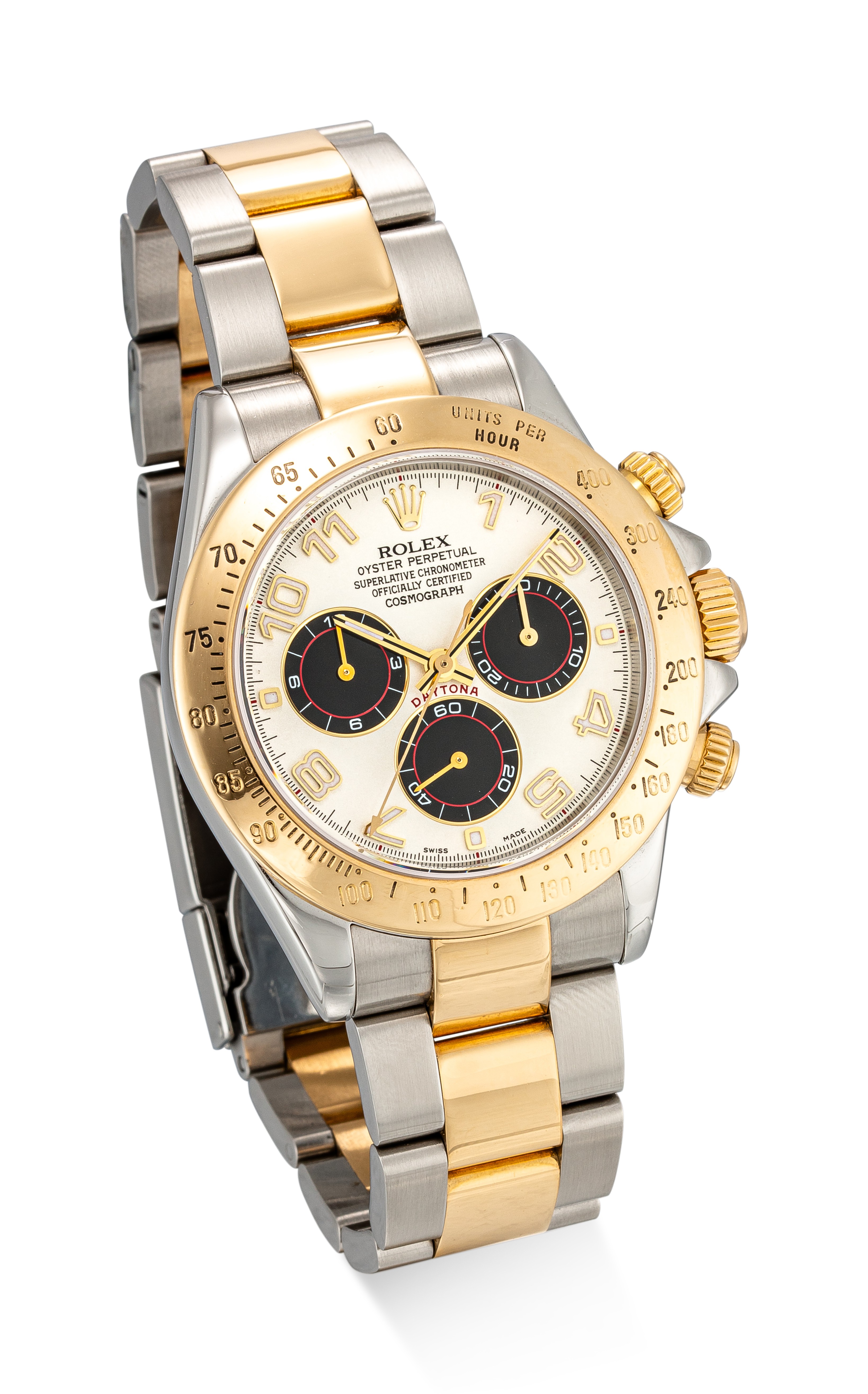 Reference 116523 Cosmograph DaytonaA stainless steel and yellow gold chronograph wristwatch with bracelet, Circa 2003Dial: white Caliber: cal. 4130 automatic, 44 jewelsCase: stainless steel and 18k yellow gold, screw down case backCase number: F'314'478Closure: stainless steel and 18k yellow gold Rolex Oyster bracelet and folding claspSize: 40 mm diameter, bracelet circumference approximately 180 mmSigned: case, dial and movementAccessories: Rolex presentation box, product literature, service paperwork