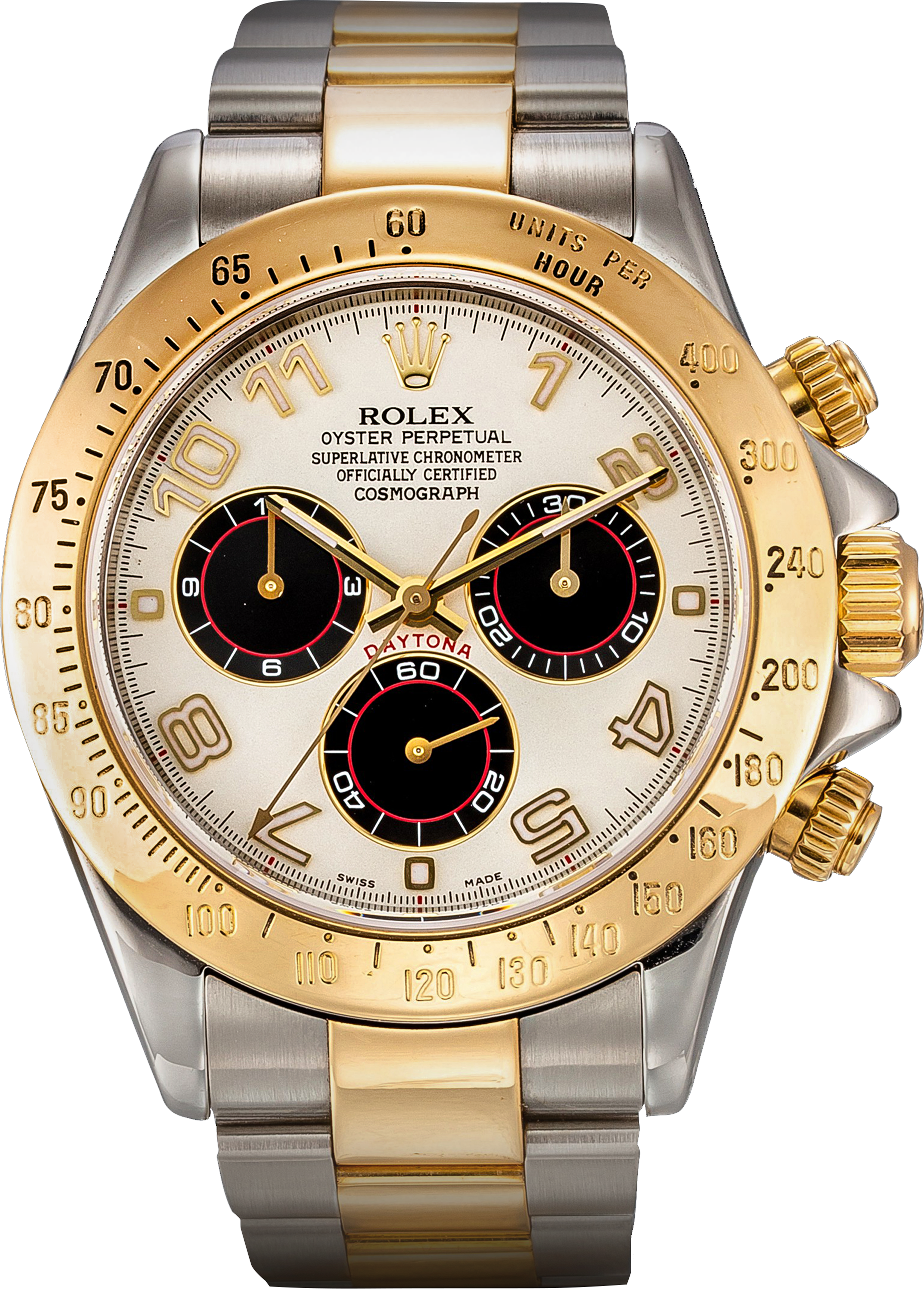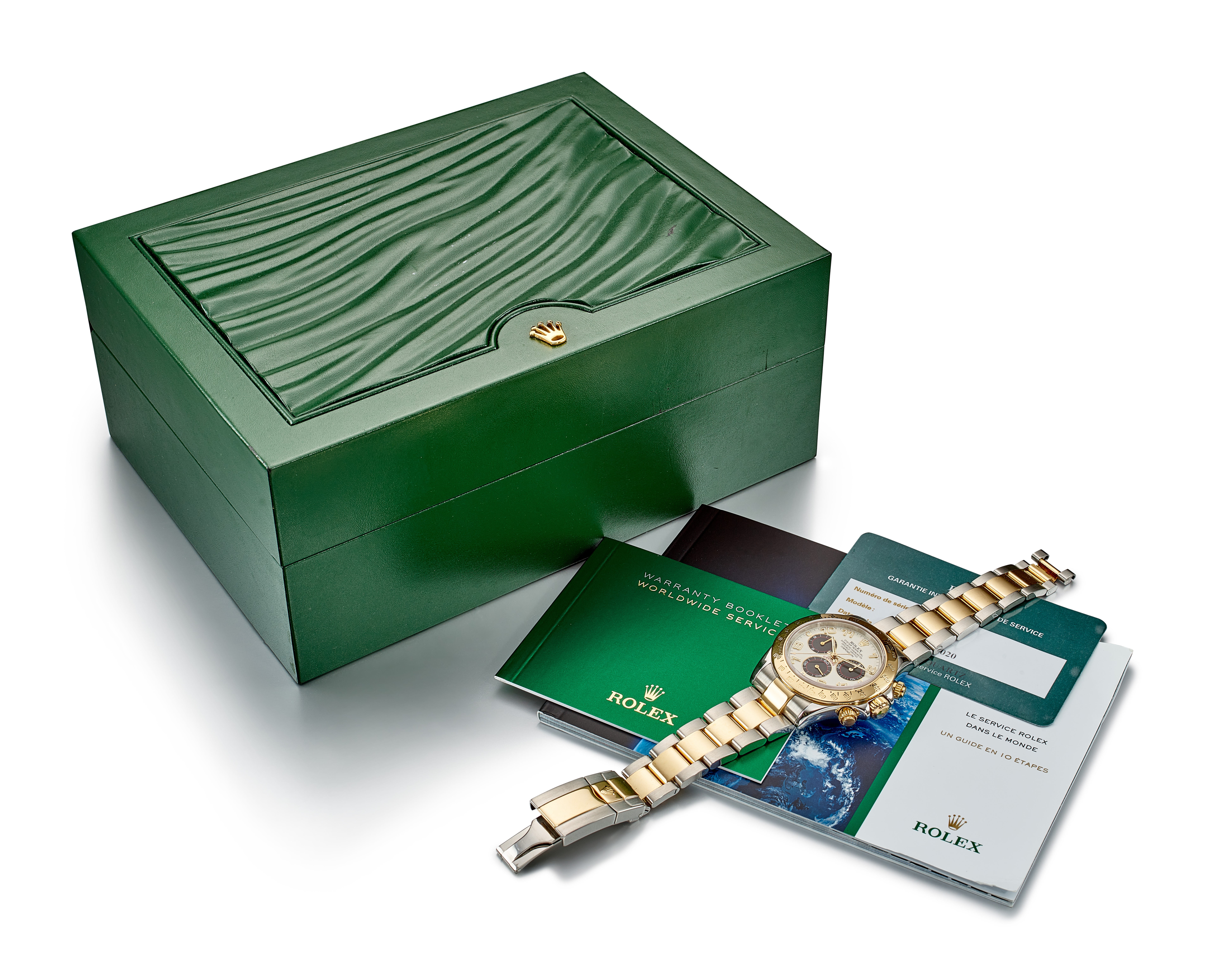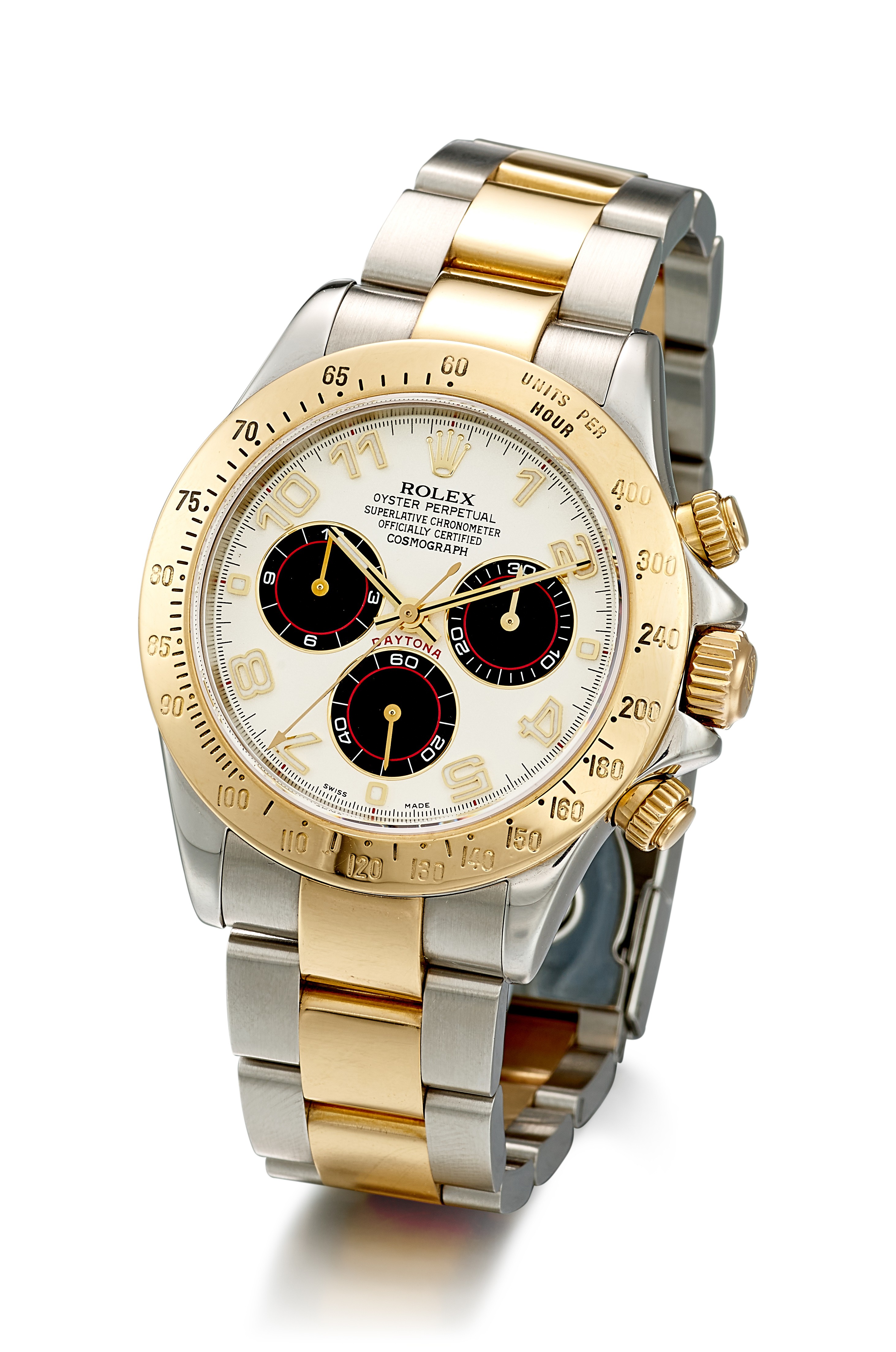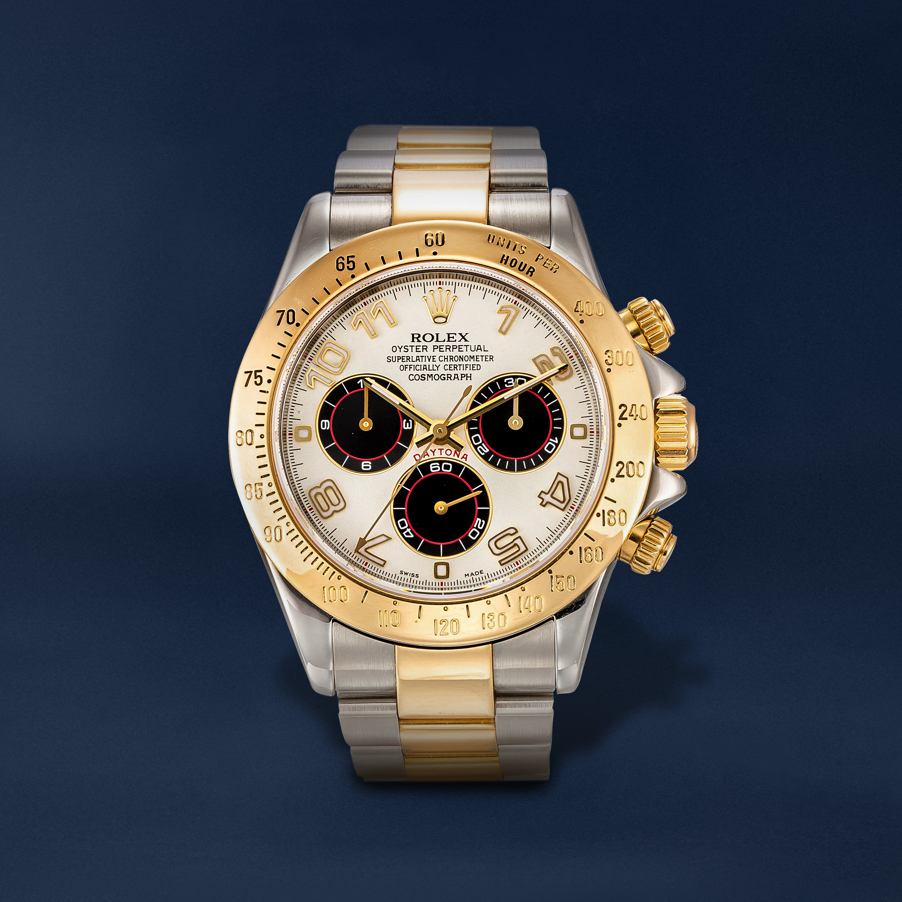 Reference 116523 Cosmograph DaytonaA stainless steel and yellow gold chronograph wristwatch with bracelet, Circa 2003Dial: white Caliber: cal. 4130 automatic, 44 jewelsCase: stainless steel and 18k yellow gold, screw down case backCase number: F'314'478Closure: stainless steel and 18k yellow gold Rolex Oyster bracelet and folding claspSize: 40 mm diameter, bracelet circumference approximately 180 mmSigned: case, dial and movementAccessories: Rolex presentation box, product literature, service paperwork