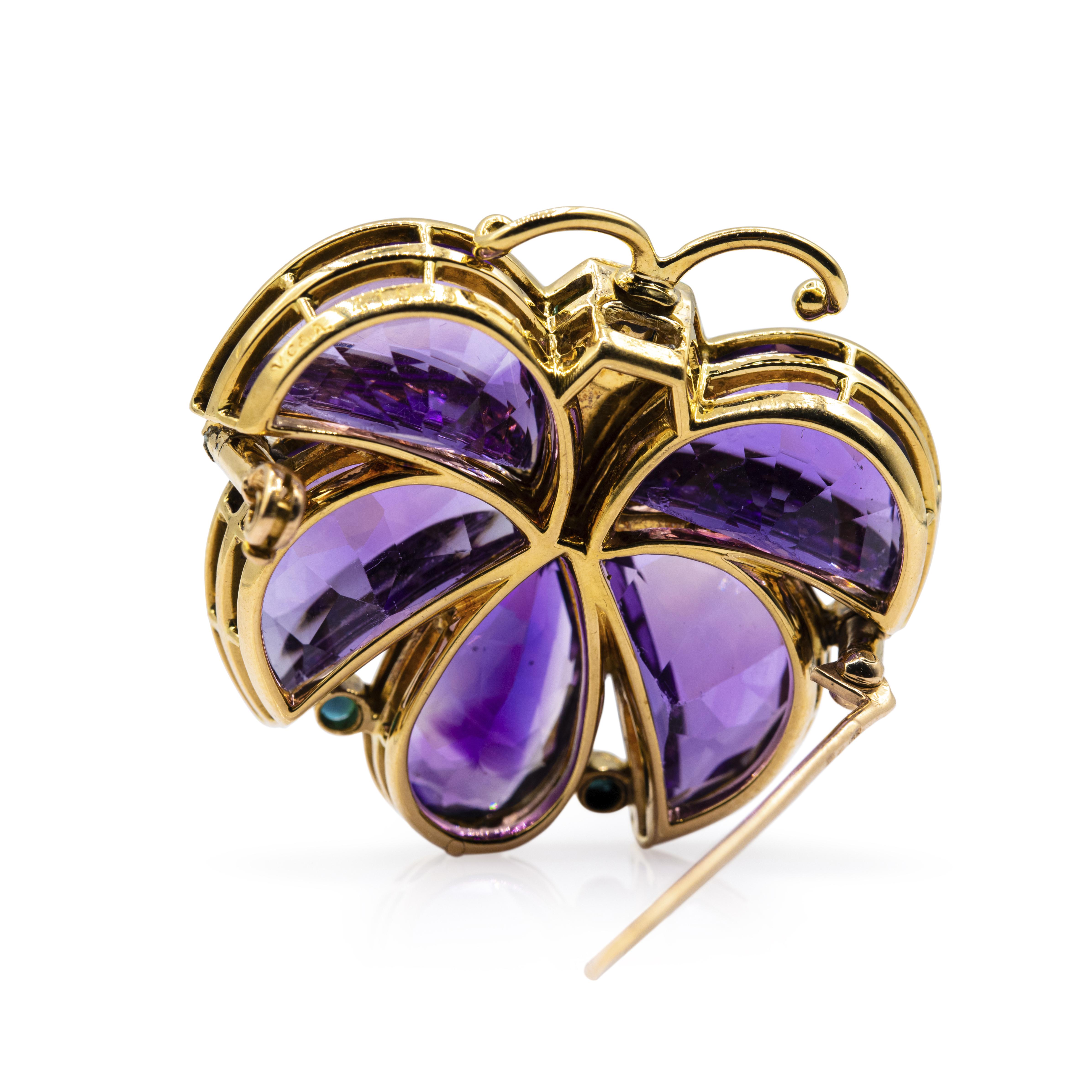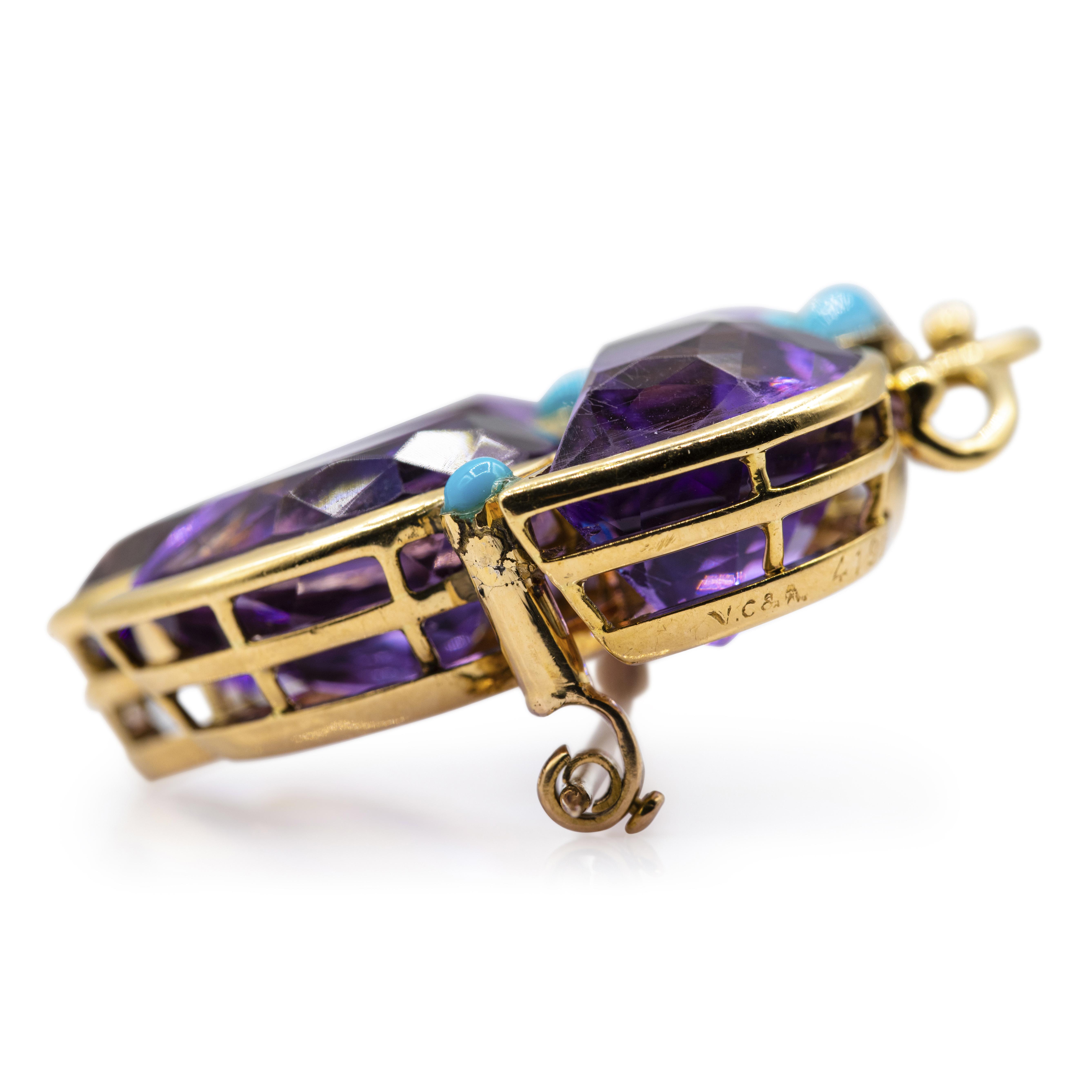 Designed as a butterfly, the wings set with half-moon and pear-shaped amethysts, accented by turquoise cabochons.Amethysts weighing a total of approximately 35.00 caratsLength approximately 1½ inchesSigned V.C. & A., numbered 41900.2.118 karat goldAccompanied by a certificate of authenticity