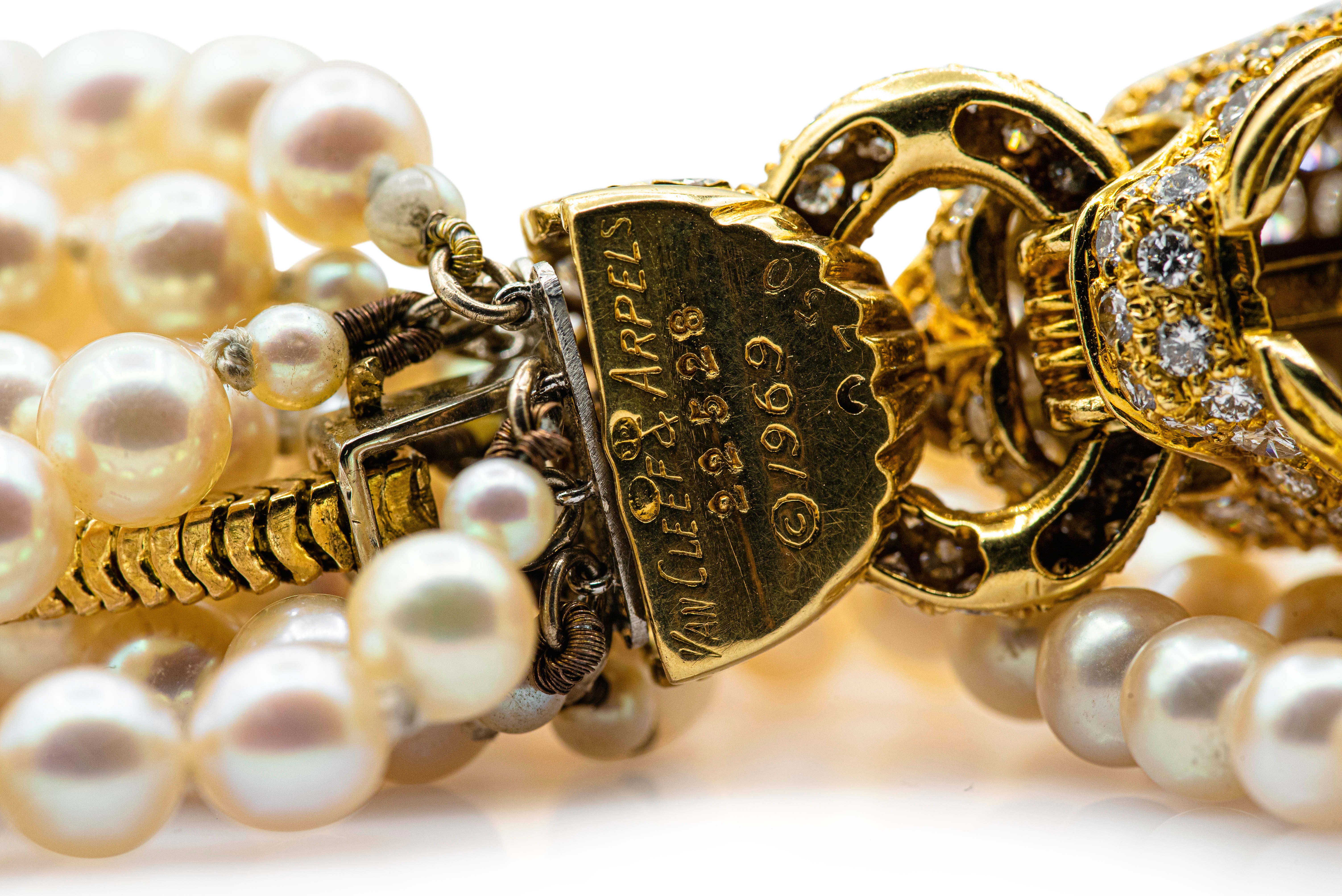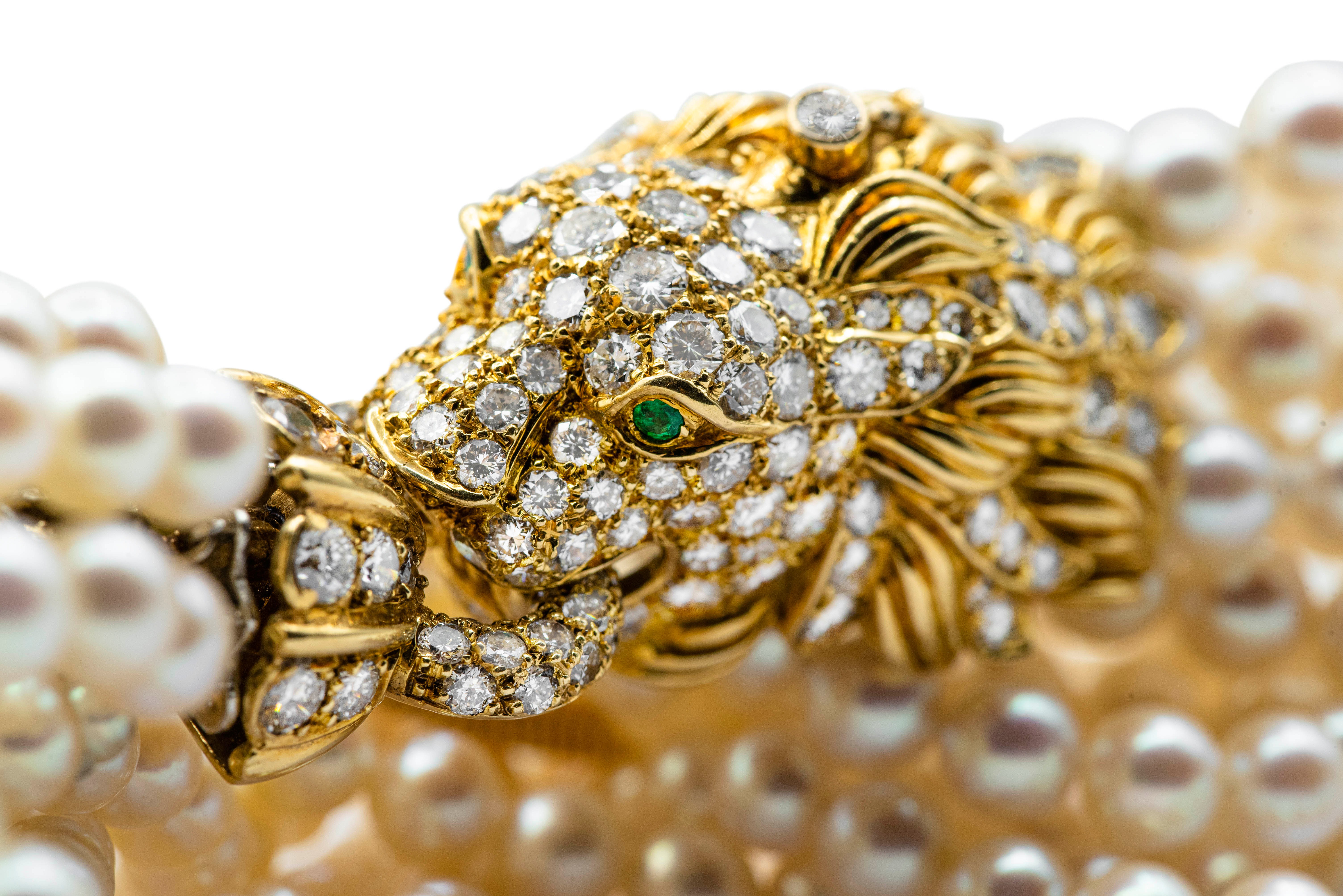 Composed of a torsade of cultured pearls intertwined with a gold snake chain, the clasp designed as a lion set with round diamonds, the eyes accented with round emeralds.Length 9 inches, untwistedSigned Van Cleef & Arpels, numbered 2252818 karat goldDated 1969