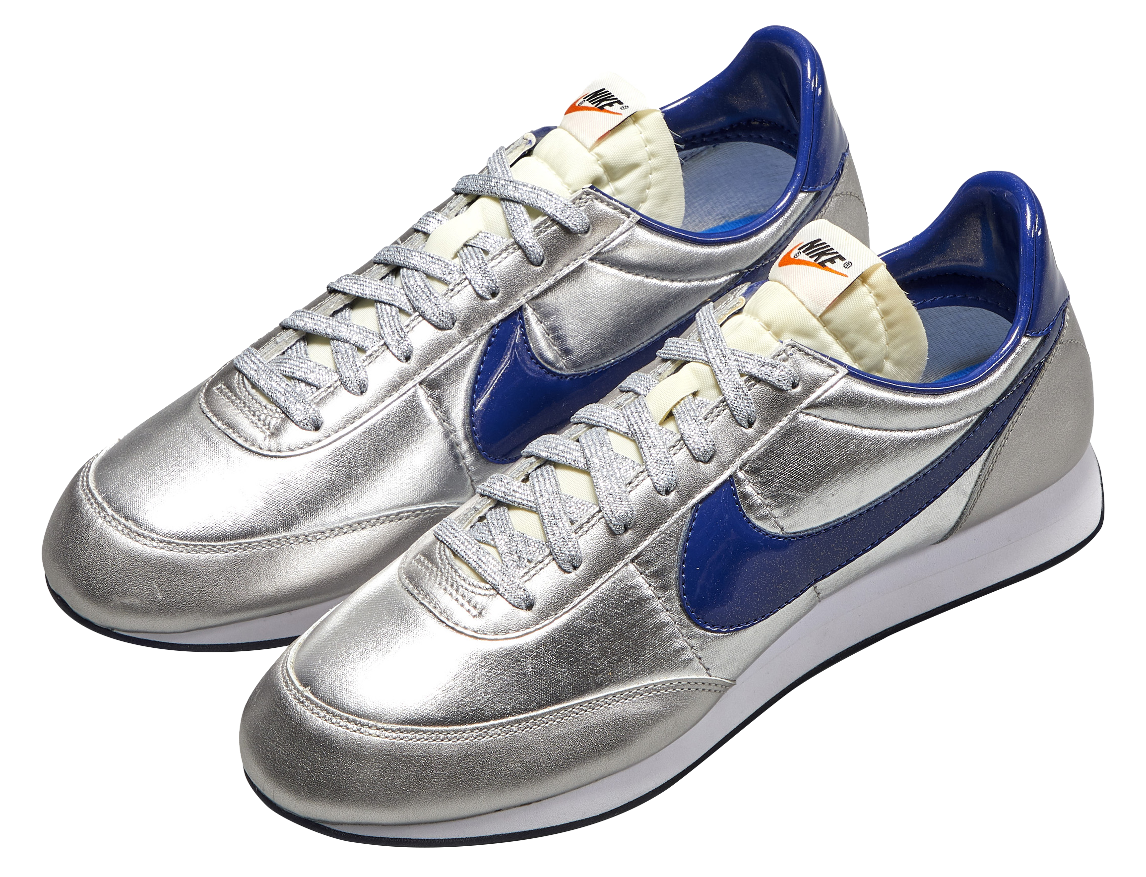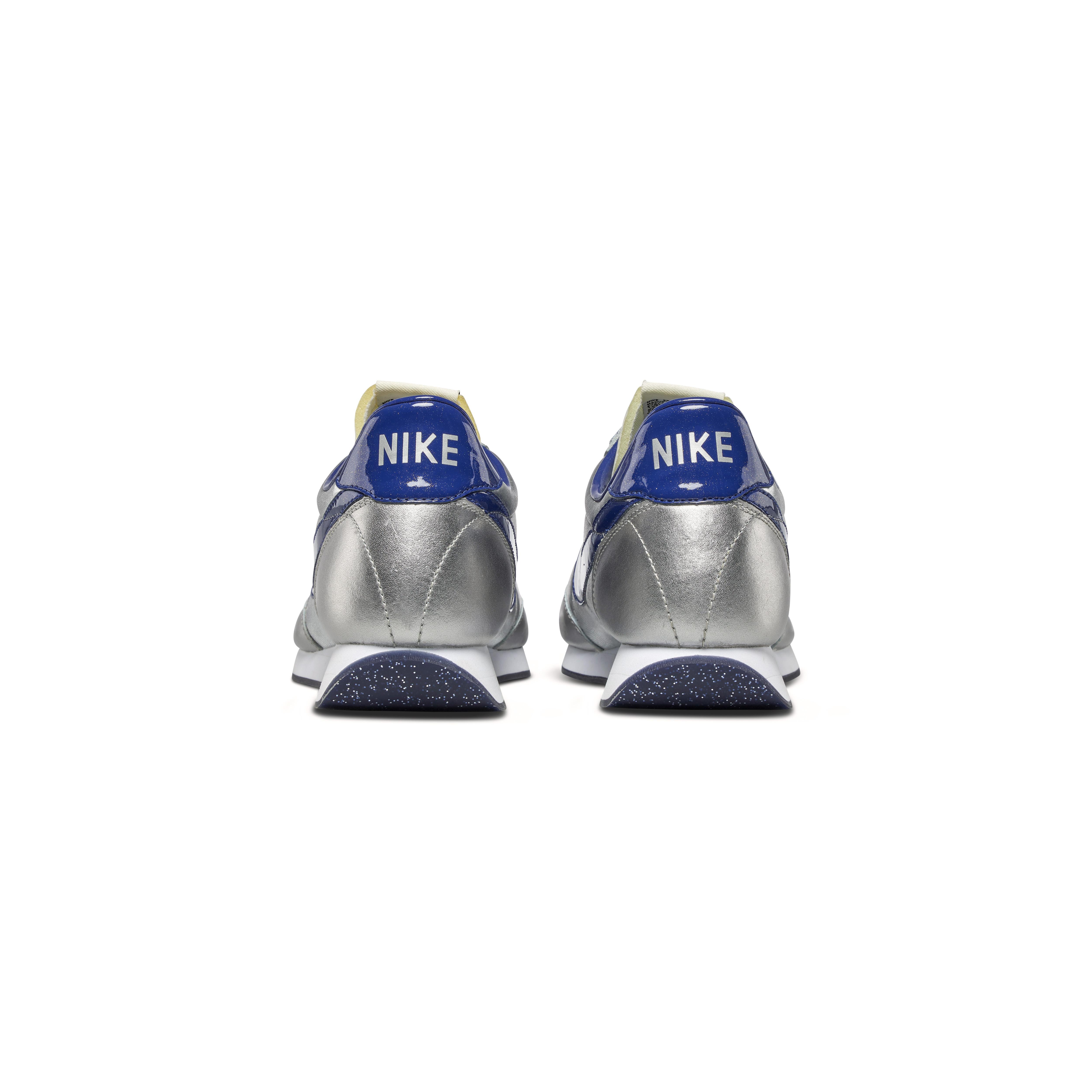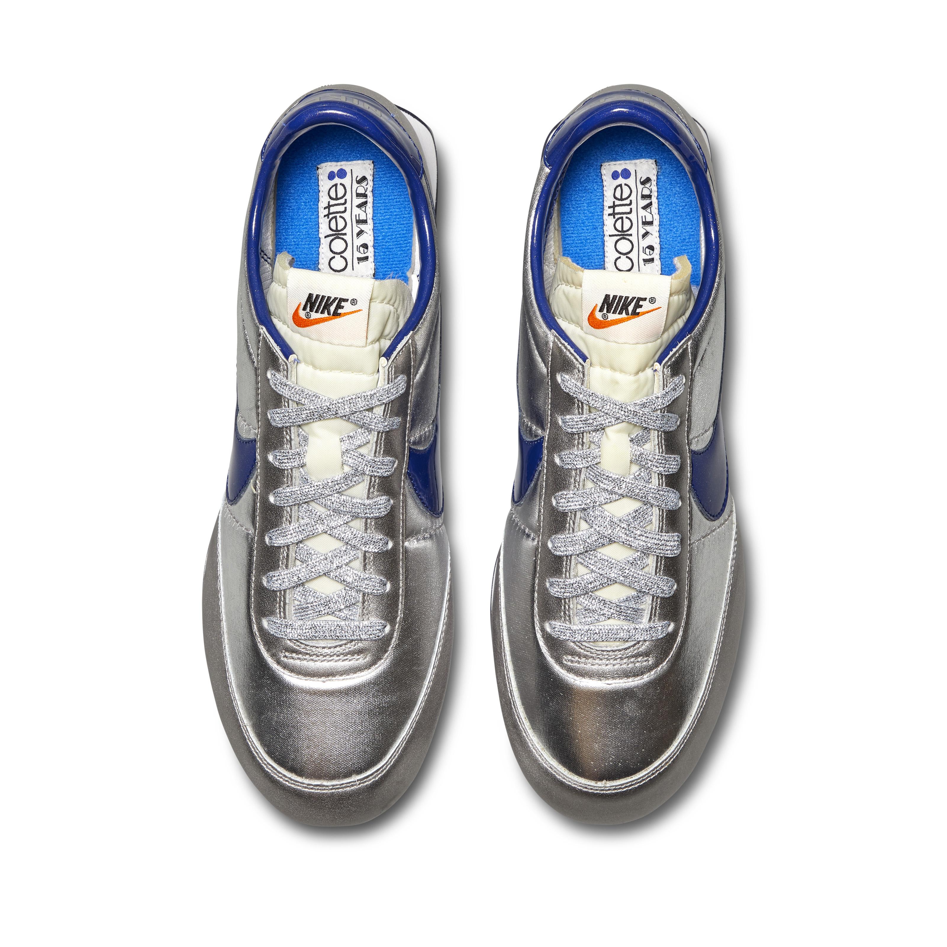 At the height of Disco’s reign, the story goes that a Nike sales rep and frequent patron of Studio 54 made an agreement to create shoes for the infamous nightclub’s employees. With sleek outsoles, vibrant silver, and lots of glitter, the first Night Track was created for dancing. Originally released in 1978, this is an extremely rare 2012 retro version that was released during fashion week by the famous retailer Colette to celebrate their 15th anniversary. Exclusively designed in celebration of the fifteen-year anniversary of the legendary Parisian boutique, Colette with a limited-edition release in 2012. Inspired by the 1978 metallic silver and red glitter colorway, the style was updated with blue glitter outsoles, Swoosh and heel tabs, big bold metallic Nike lettering and thick white midsoles, and metallic silver glitter laces.Bright blue insoles read “Colette 15 years.”Bold Nike logo and orange Swoosh tongue tags.Style Number: 518481Color Code: 040This piece is final sale and not eligible for return.