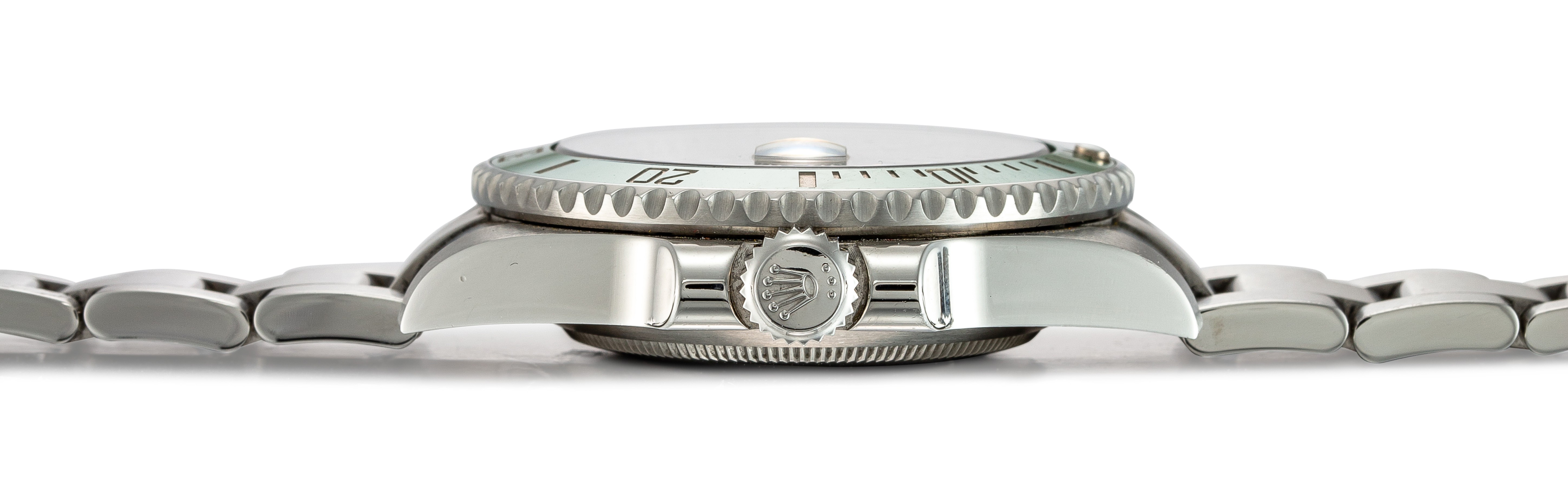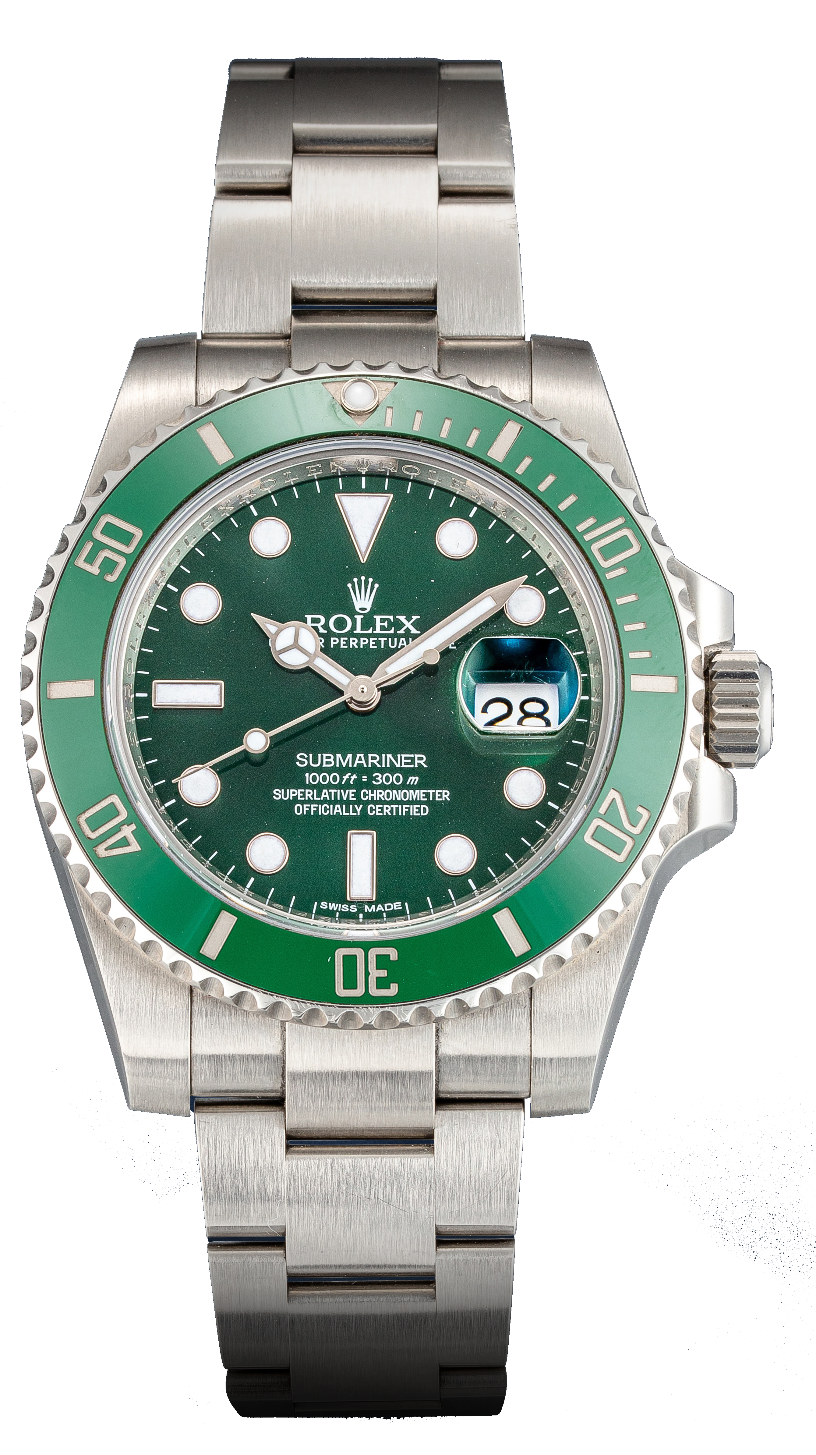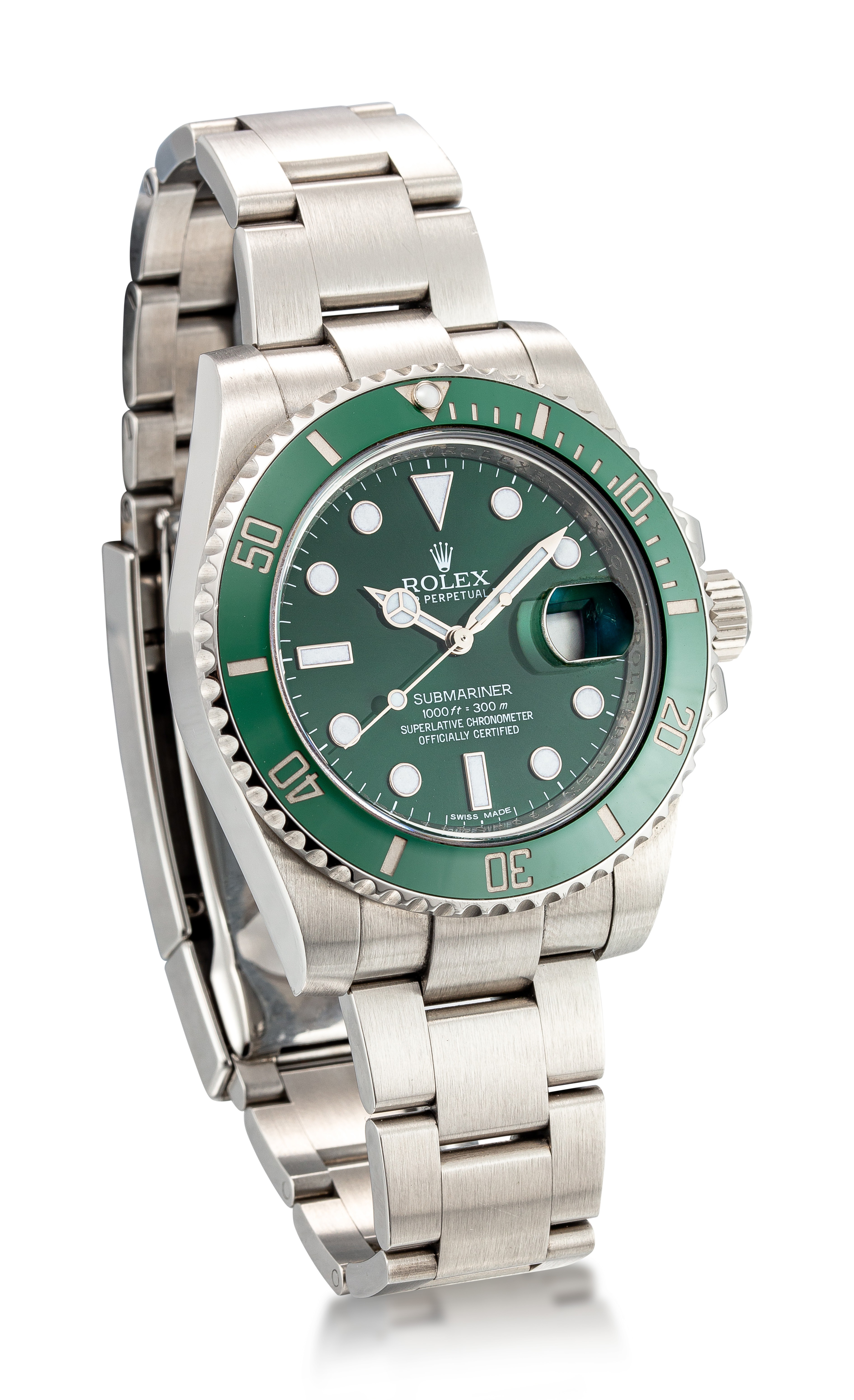 Reference 116610LV Submariner "Hulk"A stainless steel wristwatch with date and bracelet, Circa 2015Dial: greenCaliber: cal. 3135 automatic, 31 jewelsCase: stainless steel, screw down case backCase number: 460408F9Closure: stainless steel Rolex Oyster bracelet and folding clasp Size: 40 mm diameter, bracelet circumference approximately 185 mmSigned: case, dial and movementAccessories: Rolex Guarantee Card