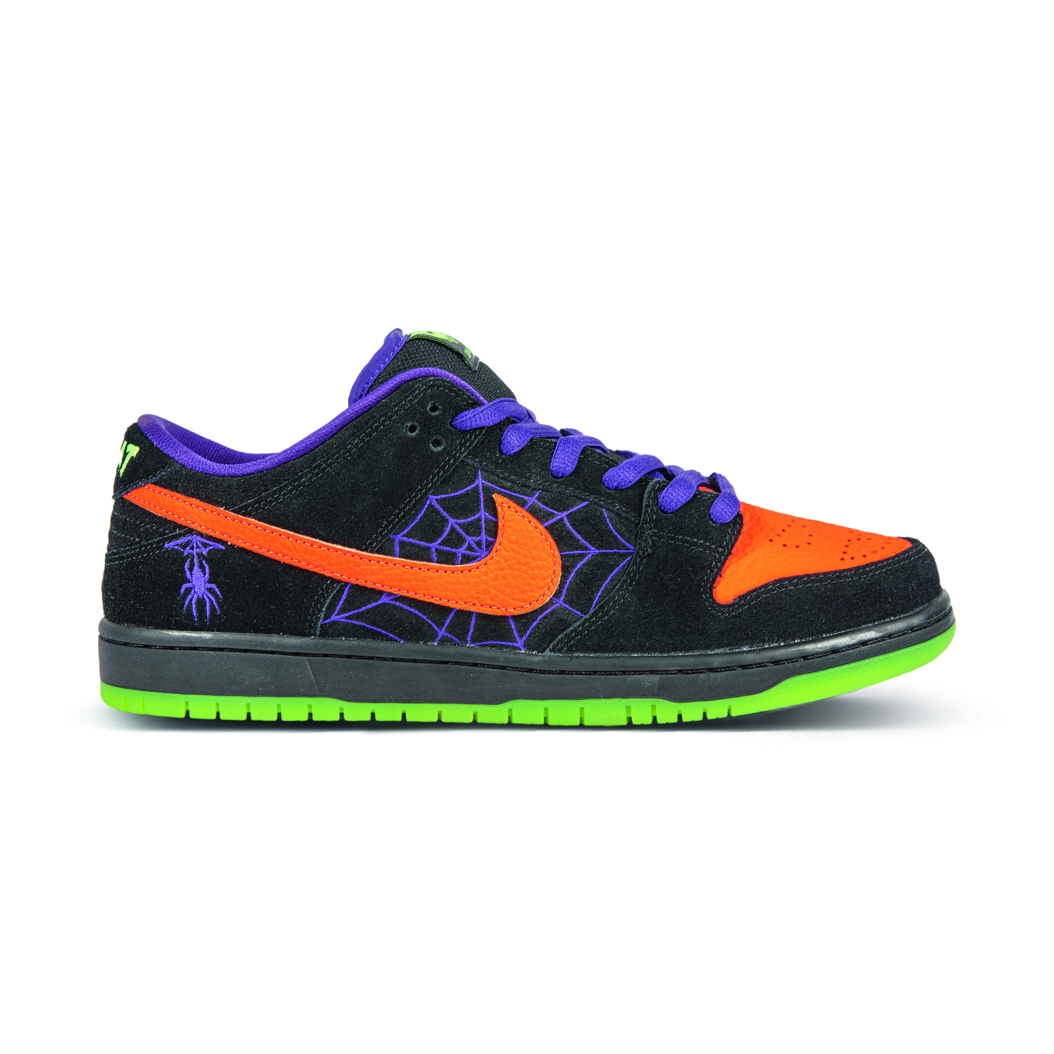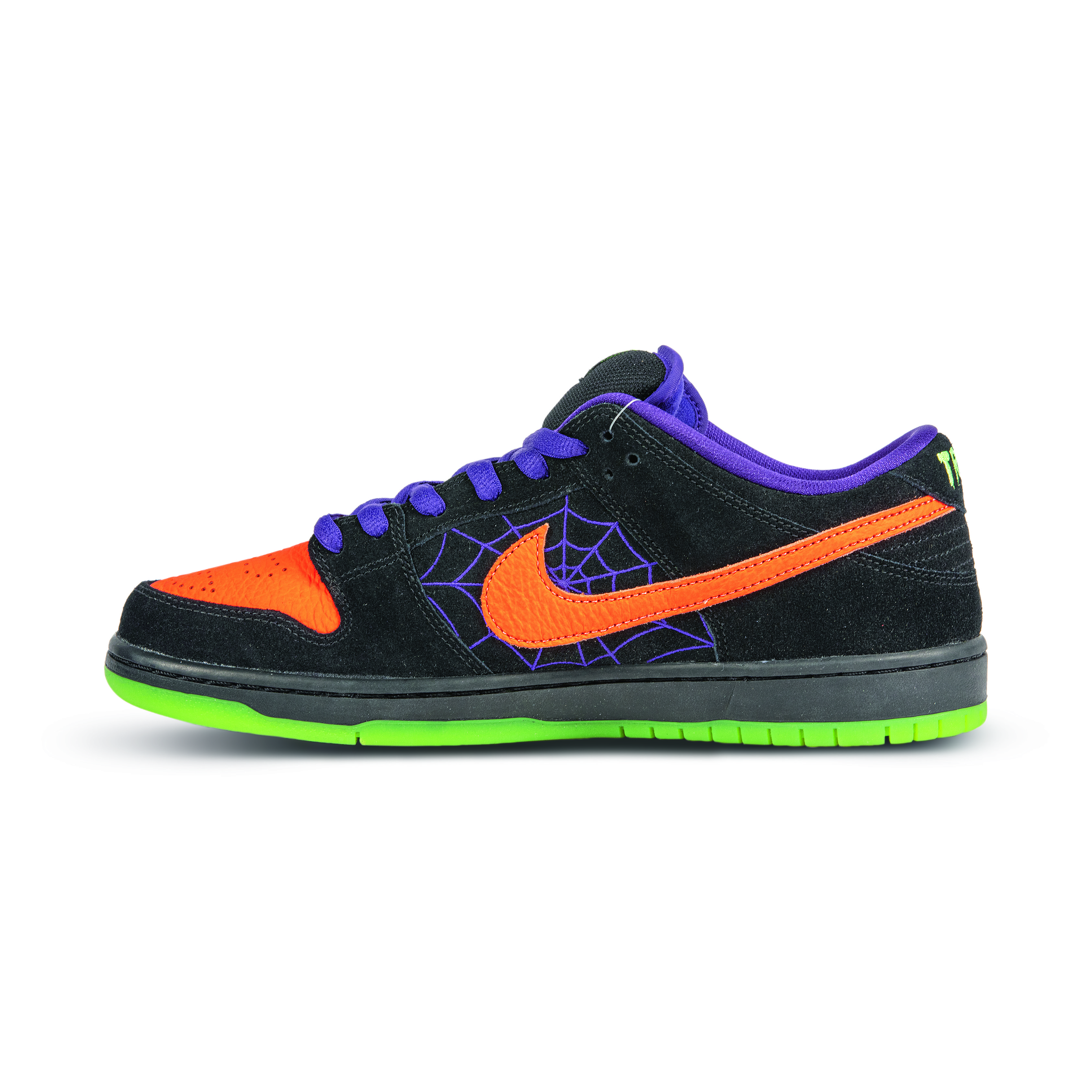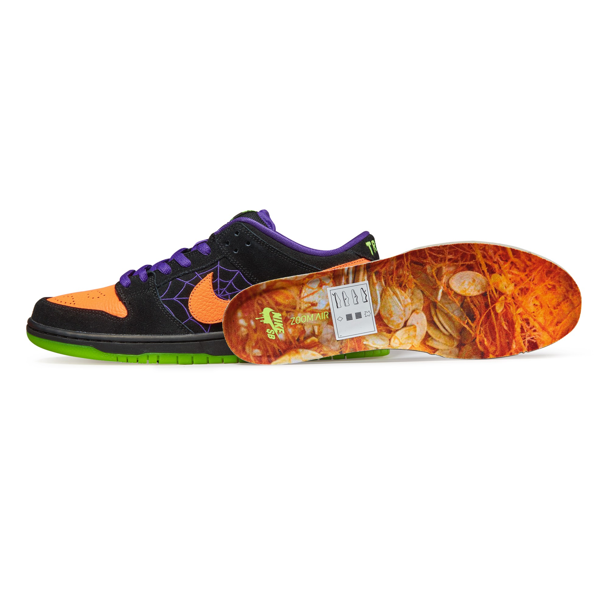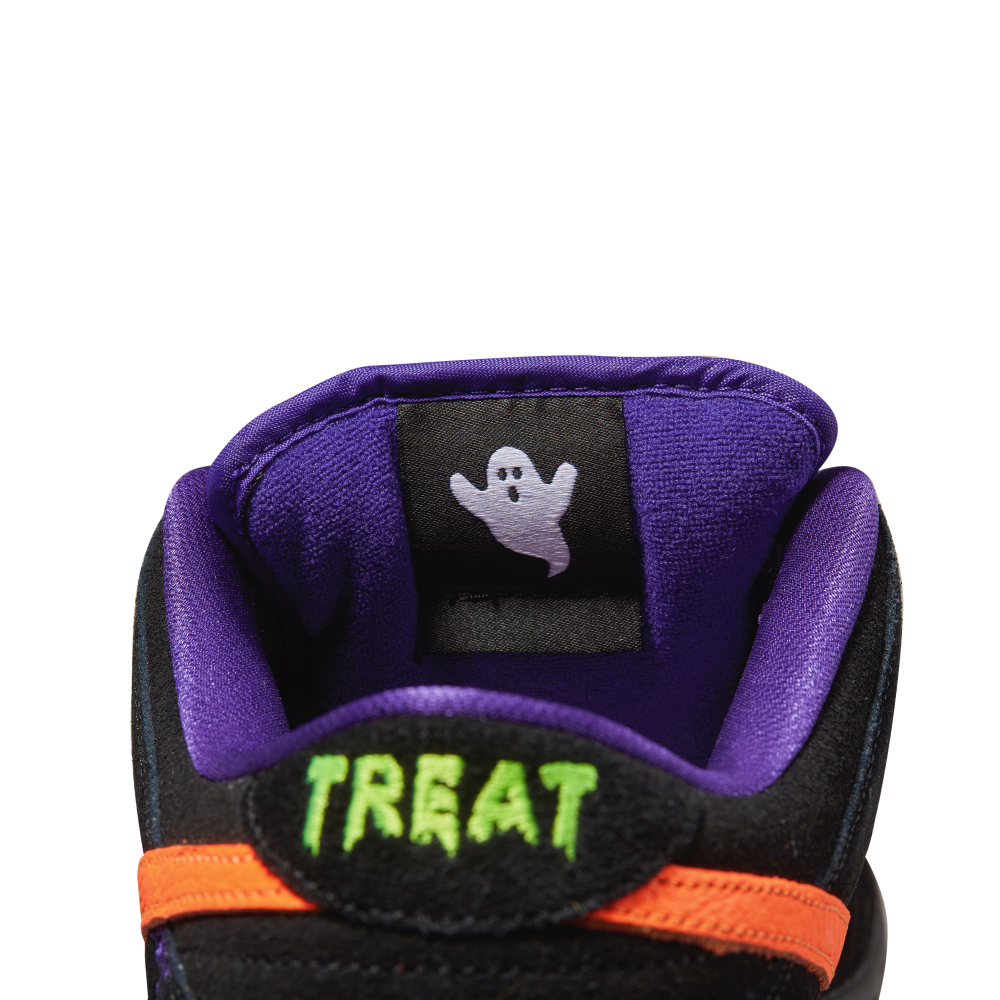 A unique misprinted version of the limited-edition Night of Mischief style. Both heel tabs read ‘Treat’ instead of ‘Trick’ and ‘Treat.’ Originally released in 1985 for basketball, Dunks popularity with skateboarders led to the launch of the SB line in 2002, featuring additional padding and Zoom air soles.Halloween-themed design details include jack-o’-lantern perforations at toe, exterior embroidered spider motifs and ghosts on inner tongue label.Black suede upper, total orange toe and Swoosh, vivid purple accents and bright green outsole. Insoles feature a printed image of pumpkin innards.Three sets of laces included.Style Number: BQ6817 Color Code: 006This piece is final sale and not eligible for return.