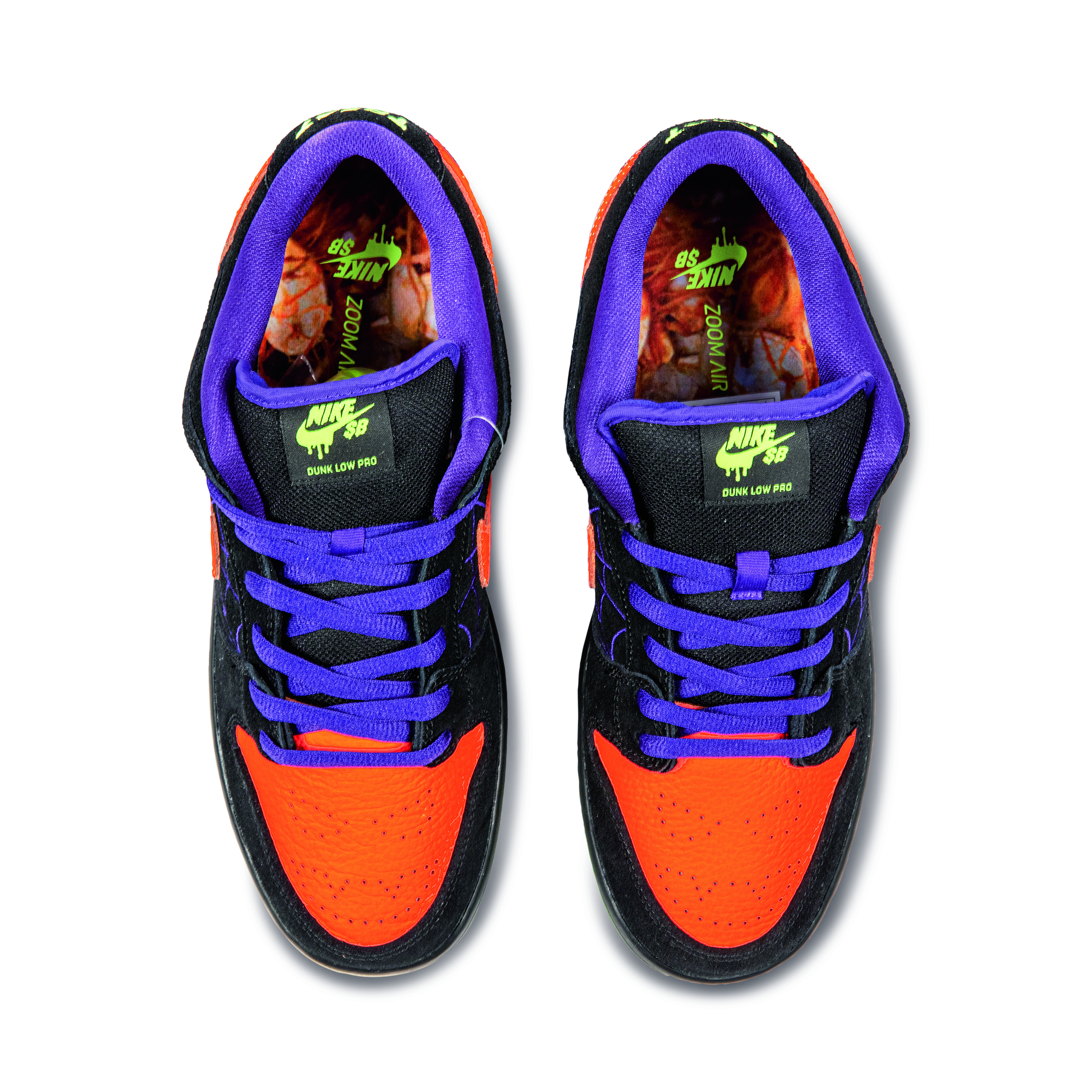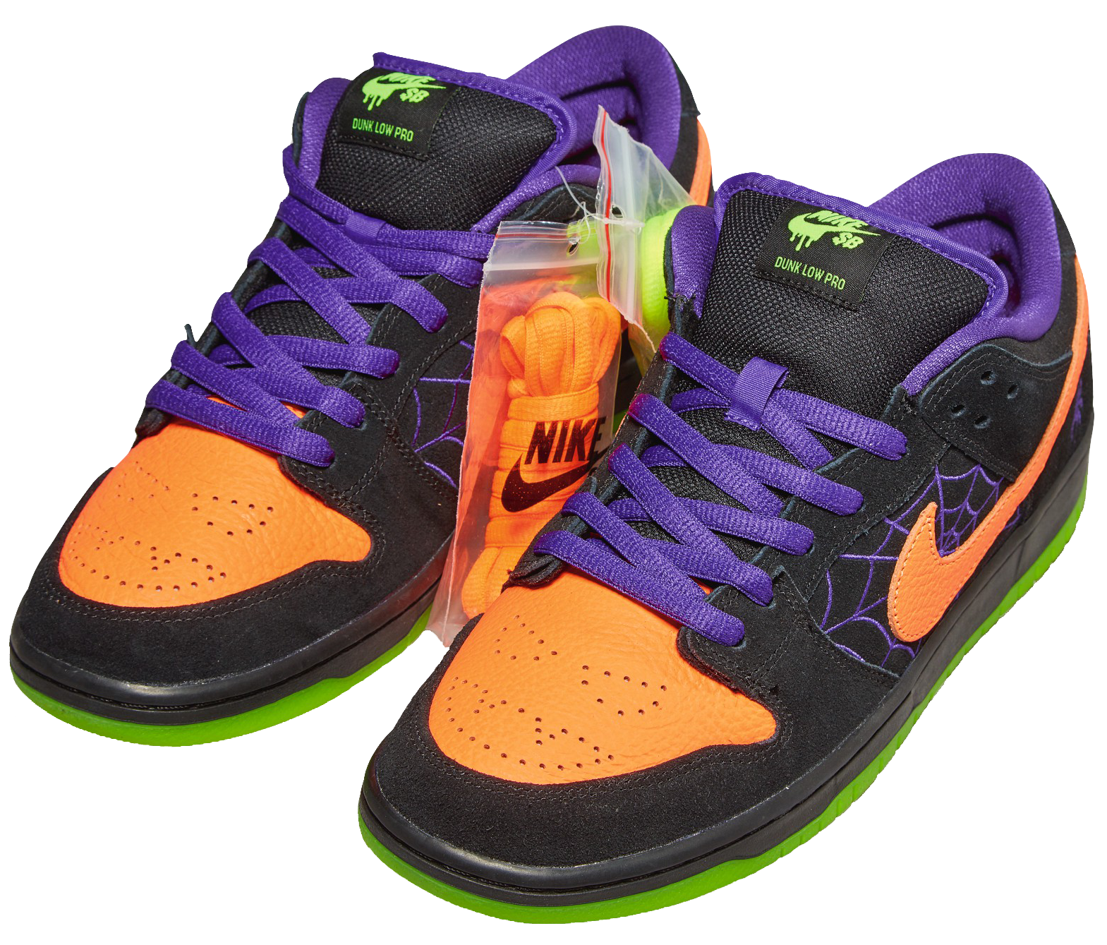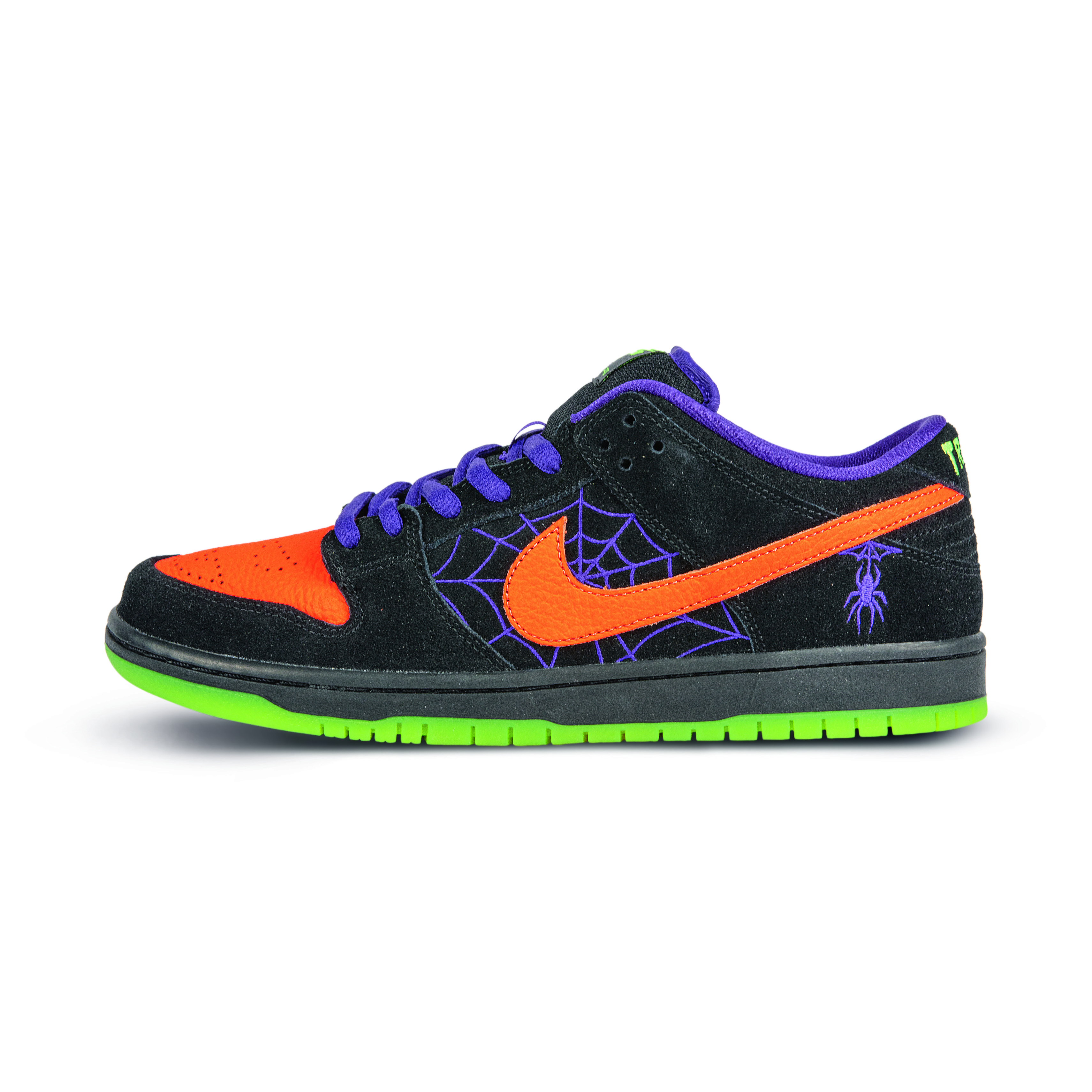 A unique misprinted version of the limited-edition Night of Mischief style. Both heel tabs read ‘Treat’ instead of ‘Trick’ and ‘Treat.’ Originally released in 1985 for basketball, Dunks popularity with skateboarders led to the launch of the SB line in 2002, featuring additional padding and Zoom air soles.Halloween-themed design details include jack-o’-lantern perforations at toe, exterior embroidered spider motifs and ghosts on inner tongue label.Black suede upper, total orange toe and Swoosh, vivid purple accents and bright green outsole. Insoles feature a printed image of pumpkin innards.Three sets of laces included.Style Number: BQ6817 Color Code: 006This piece is final sale and not eligible for return.