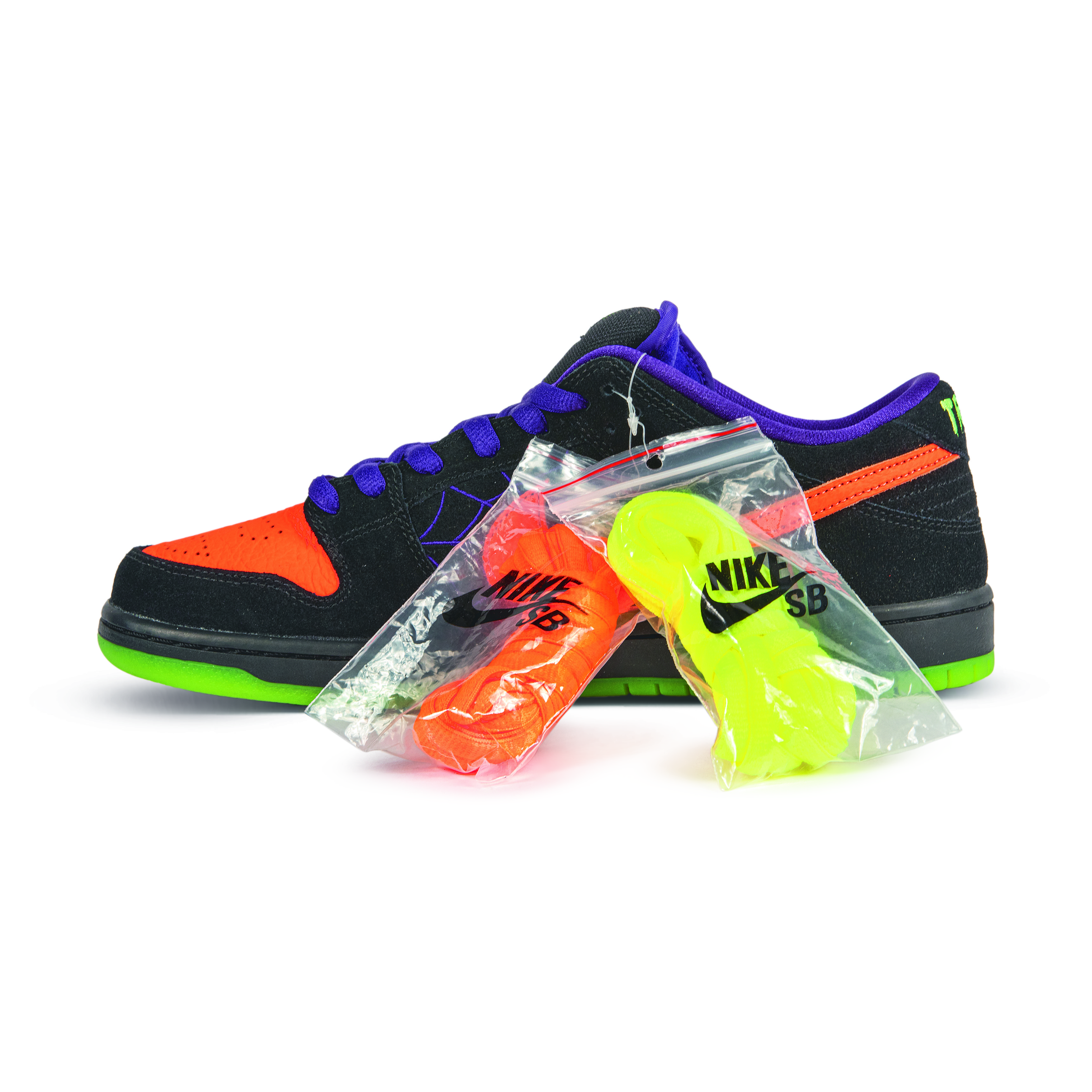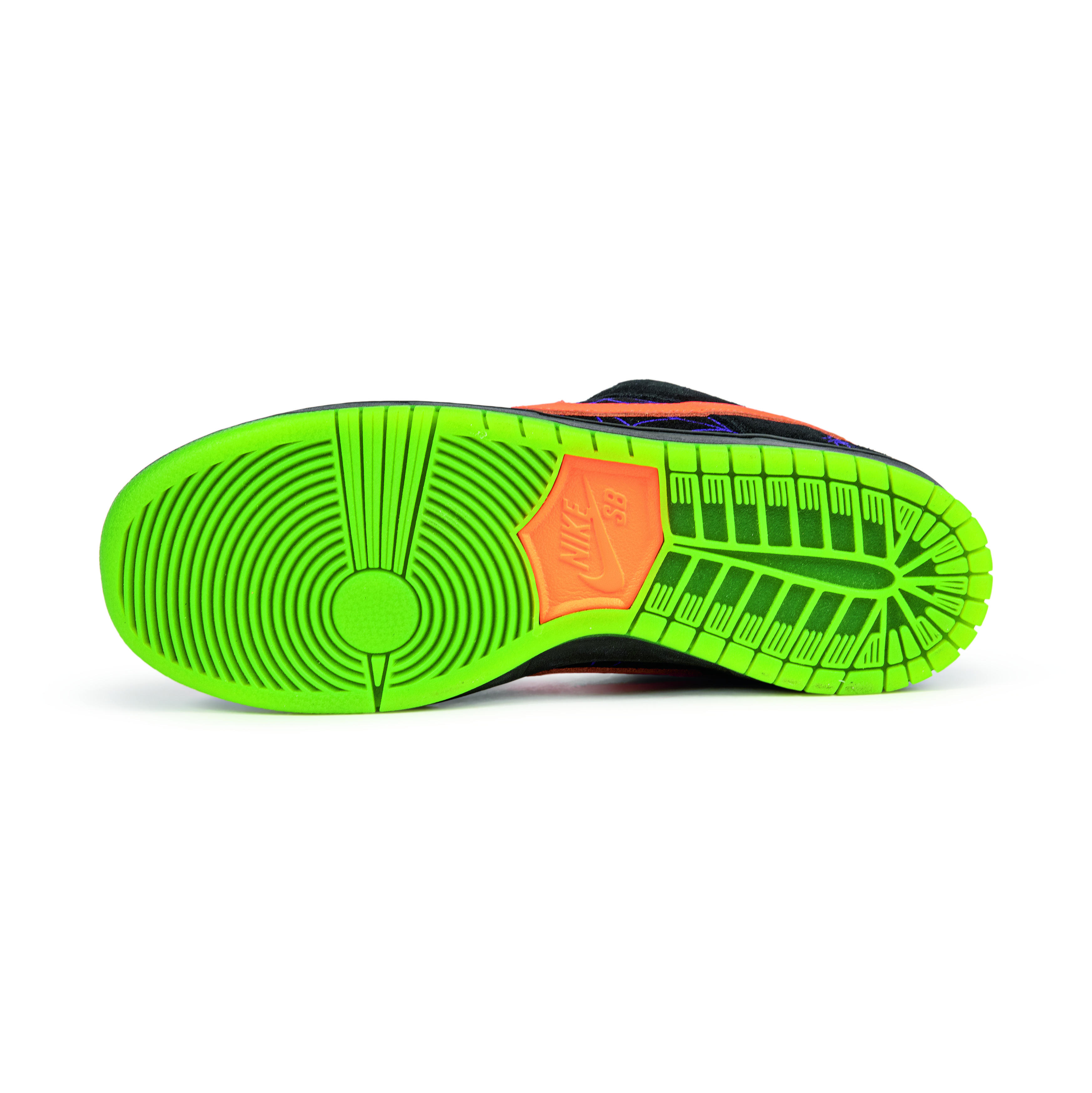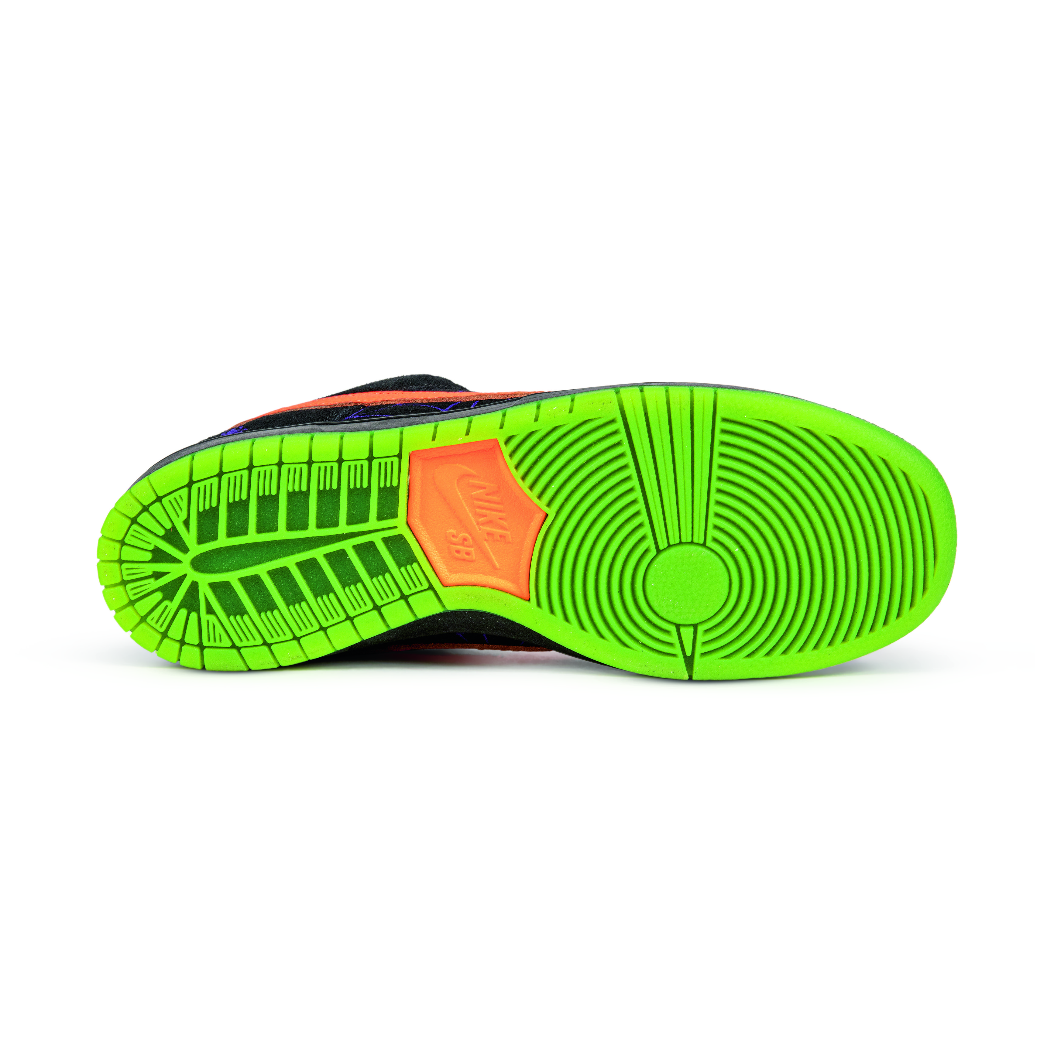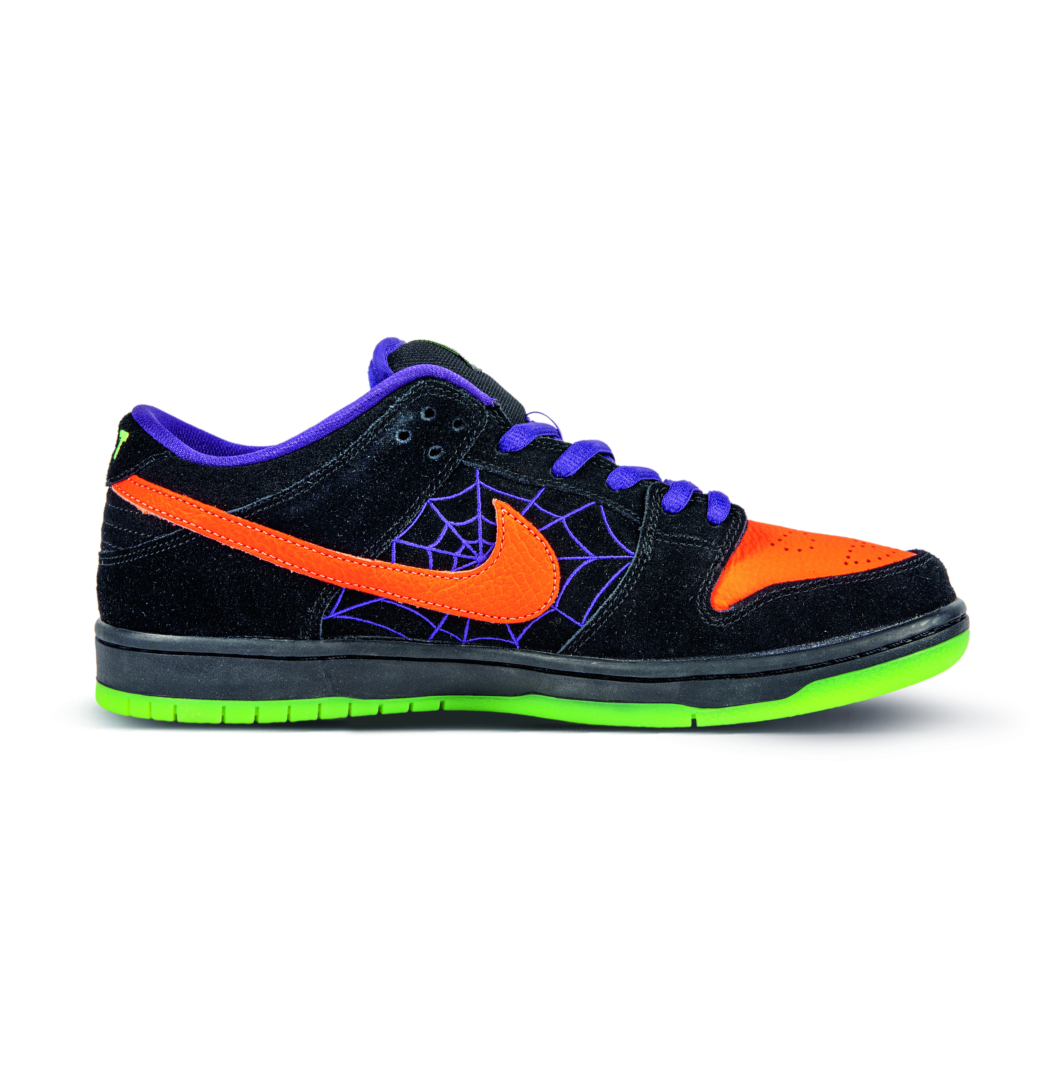 A unique misprinted version of the limited-edition Night of Mischief style. Both heel tabs read ‘Treat’ instead of ‘Trick’ and ‘Treat.’ Originally released in 1985 for basketball, Dunks popularity with skateboarders led to the launch of the SB line in 2002, featuring additional padding and Zoom air soles.Halloween-themed design details include jack-o’-lantern perforations at toe, exterior embroidered spider motifs and ghosts on inner tongue label.Black suede upper, total orange toe and Swoosh, vivid purple accents and bright green outsole. Insoles feature a printed image of pumpkin innards.Three sets of laces included.Style Number: BQ6817 Color Code: 006This piece is final sale and not eligible for return.