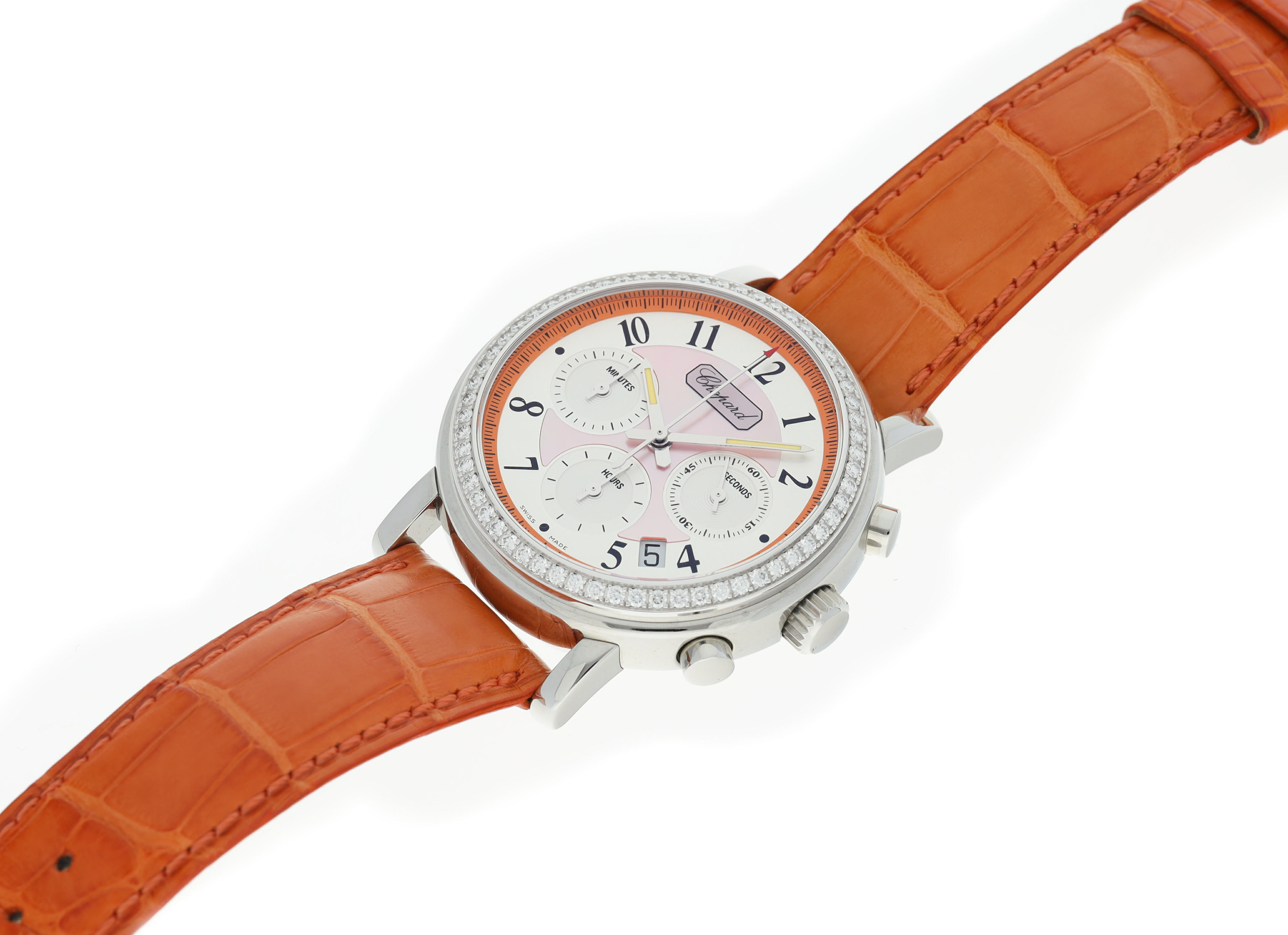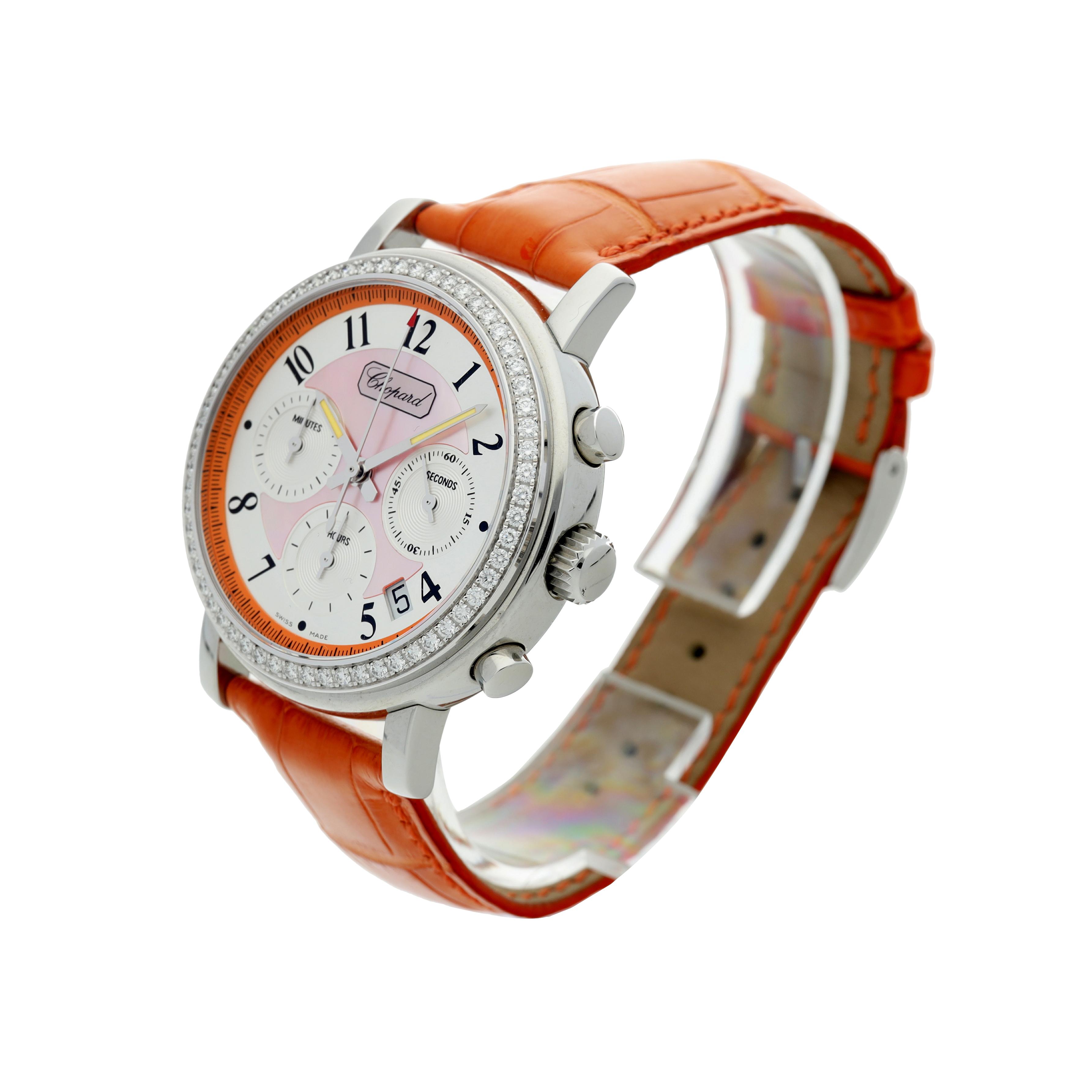 Reference 178331-2003 Mille Miglia Elton JohnA limited edition stainless-steel automatic wristwatch with chronograph and date with diamond-set bezel, Circa 2008Dial: pink mother-of-pearlCaliber: cal. ETA 2894 automatic, 37 jewelsCase: stainless-steel with 18k white gold diamond-set bezel, sapphire display back secured by 8 screwsCase number: 1'096'947, limited edition of 248 / 2000Closure: orange alligator Chopard strap with stainless steel Chopard buckleSize: 39 mm diameterSigned: case, dial and movementAccessories: Chopard box and papers