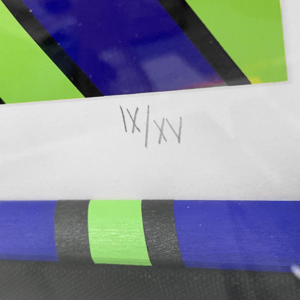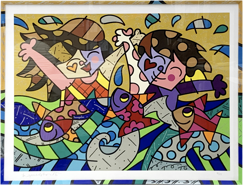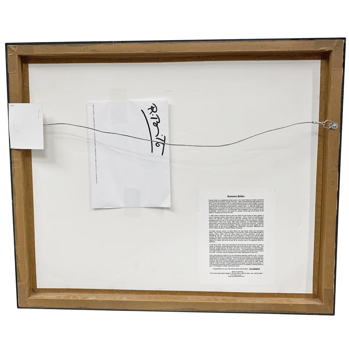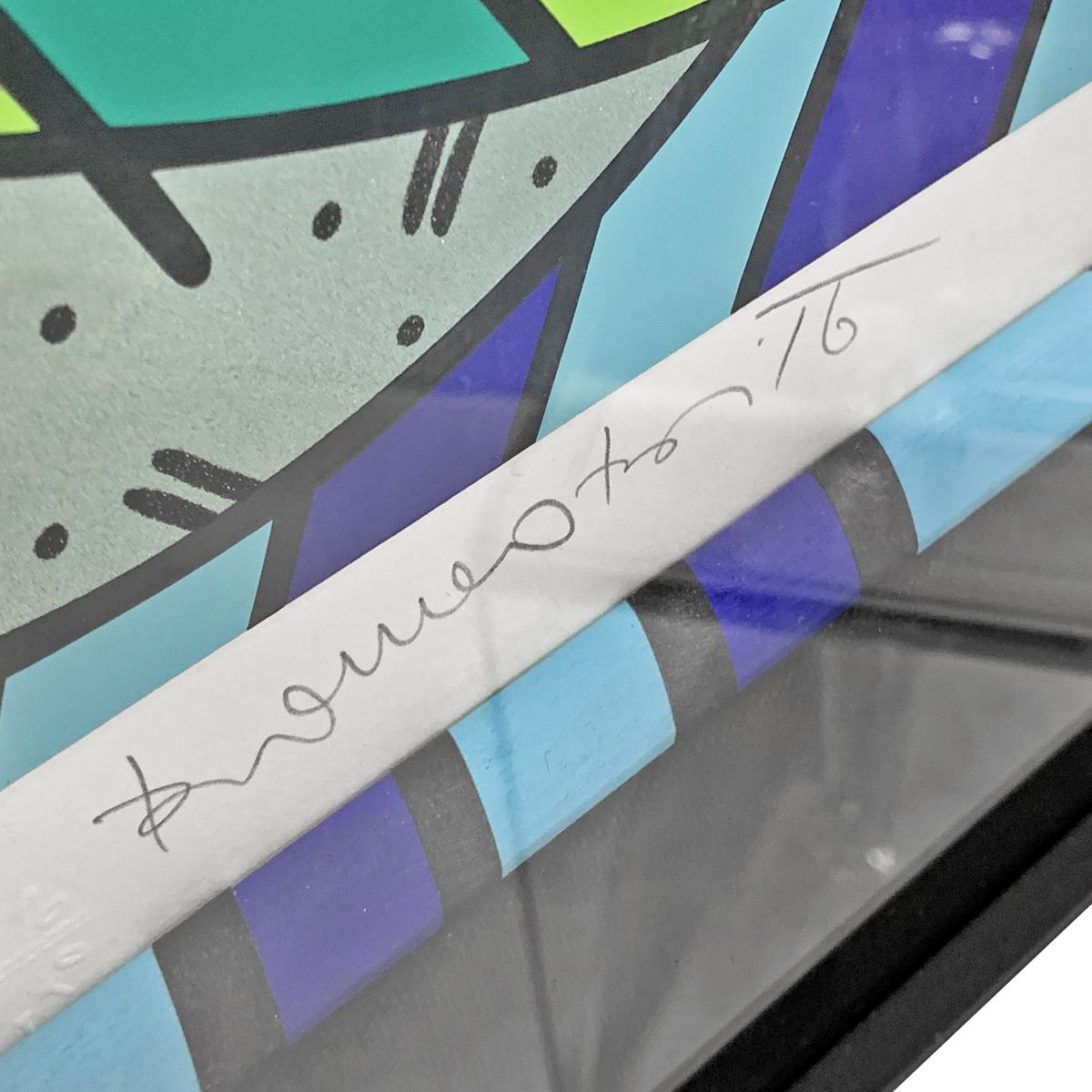 Romero Britto (Brazilian, b. 1963).Framed in black wood with black mat under plexiglass.Hangs with wire.Romero Britto combines elements of cubism, pop art and graffiti in his work, using vibrant colors and bold patterns.