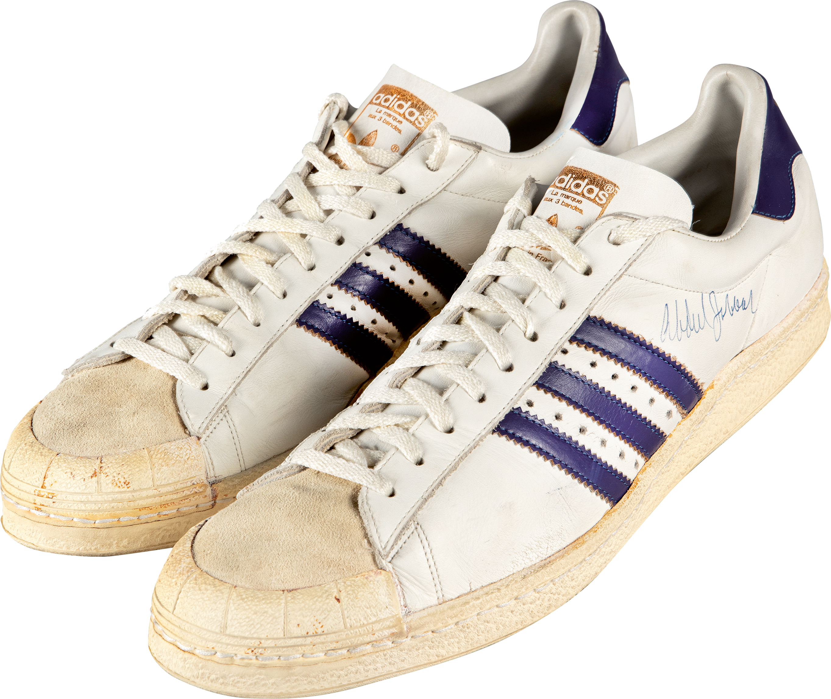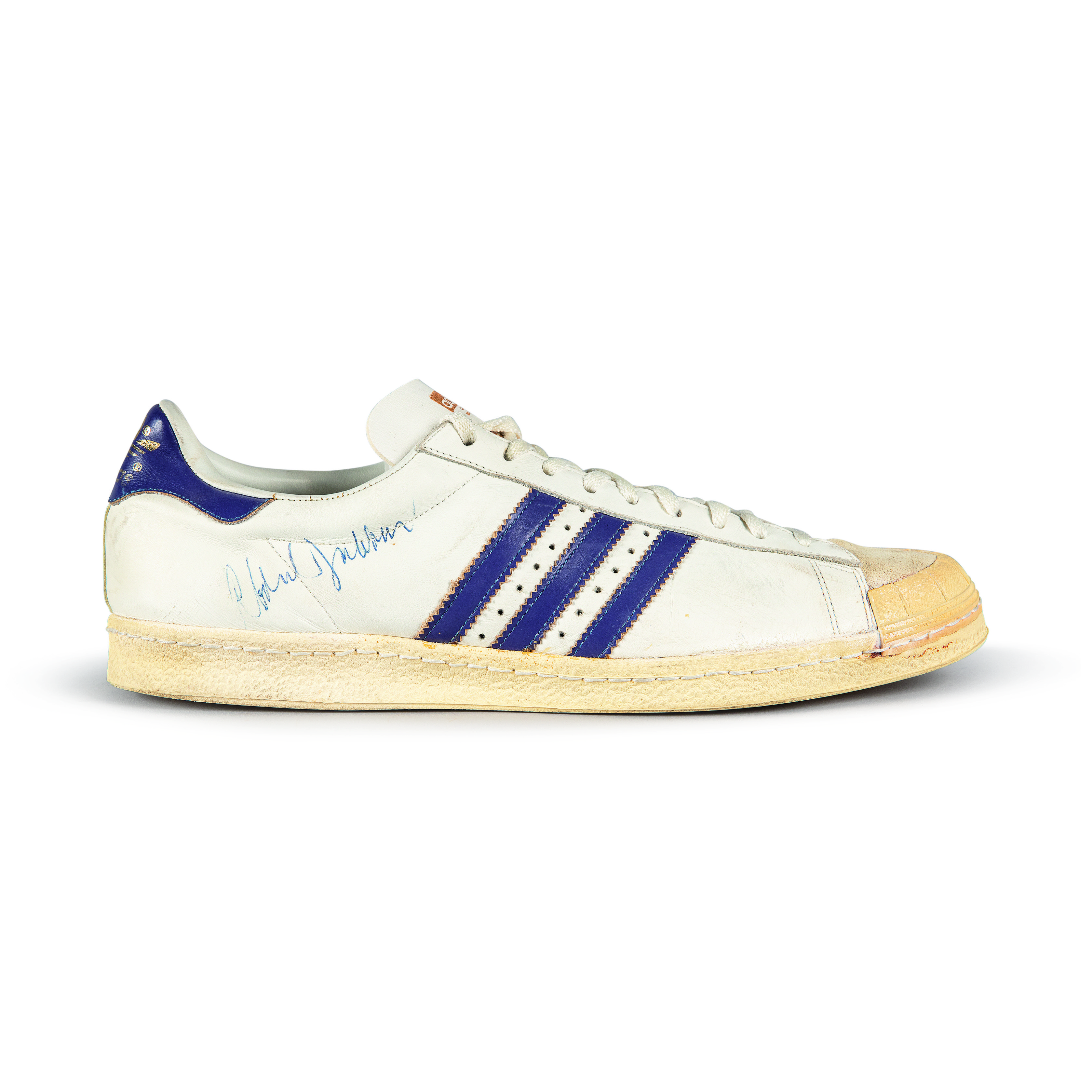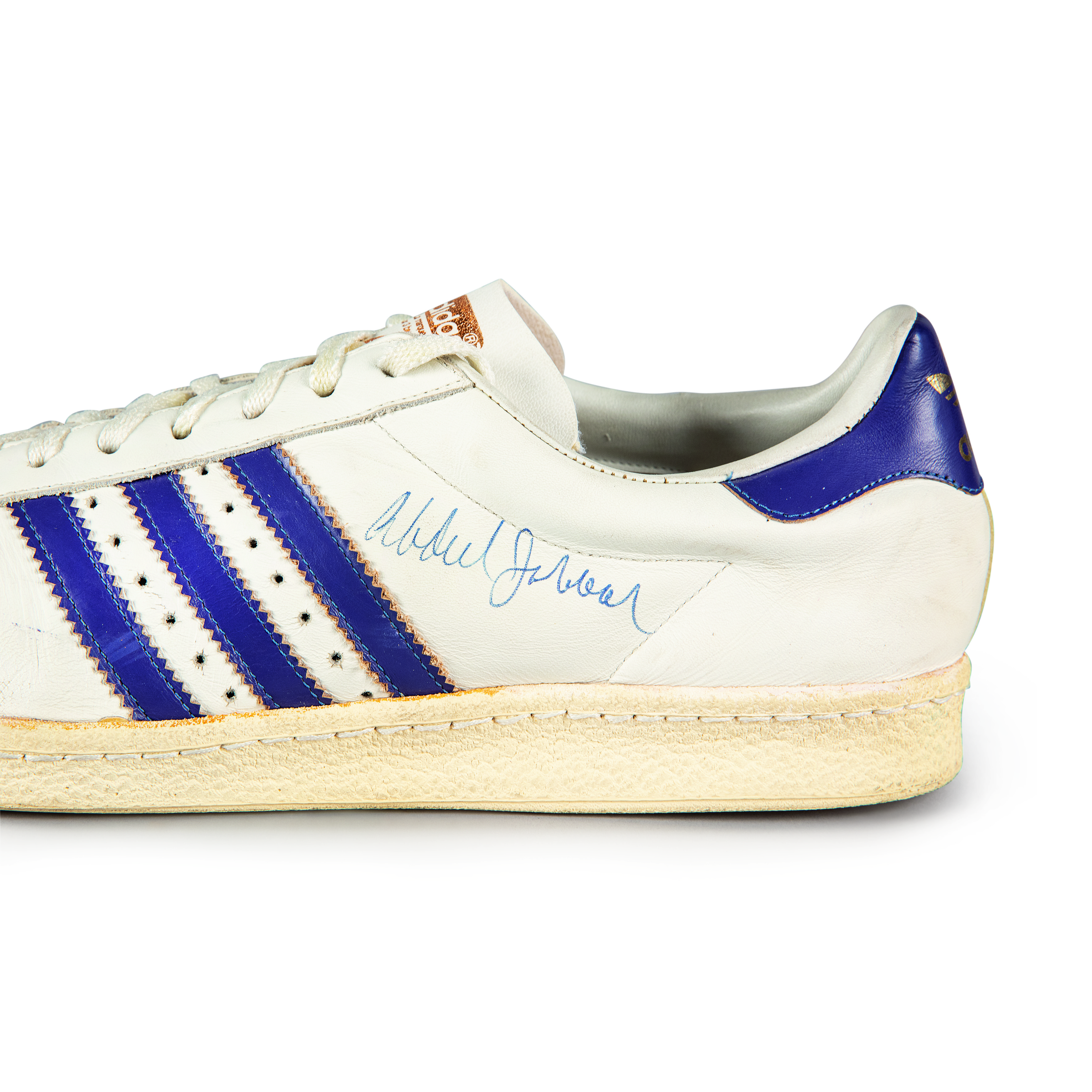 The legendary Kareem Abdul-Jabbar, also known as “The Captain”, has a combination of individual accolades and team successes that may never be matched in professional basketball. The seven foot two center ended his 20 year career in 1989 as NBA’s all-time leader in 9 statistical categories and still ranks first for the most points scored in NBA history. He began his NBA career as Rookie of the Year in 1969 and went on to win 6 championships, 2 Finals MVPs, and 6 Season MVPs. He is a 19 time NBA All-Star performer and member of the NBA’s 35th and 50th Anniversary All-Time teams.These specific game worn and dual signed adidas Superstars were worn by Abdul-Jabbar during his 1979-1980 season with the Los Angeles Lakers, which ended with the NBA title and Abdul-Jabbar’s sixth MVP win. The iconic Superstar designed by Chris Severn, is considered the first ever signature basketball shoe because of Abdul-Jabbar’s game use. He was the first basketball player contracted by adidas. Coined ‘Kareem’s Sky Hook Shoes’, for his trademark high-flying shot, Abdul-Jabbar preferred the lowcut silhouette to keep his ankles strong and minimize shock absorption to his knees. The style is also known as “Shell Toes” because of the rubber toe cap design.Player exclusive sample pair of Superstar shoes made for Kareem Abdul-Jabbar’s personal game use during the 1979-1980 season with the Los Angeles Lakers.Signed by Kareem Abdul-Jabbar in ball point pen at the lateral side of each shoe.Lakers inspired colorway in white leather uppers, suede toeboxes and rubber ‘Shell Toe’ caps with purple and gold accents.Purple and gold Three Stripes logo sewn with contrasting blue thread.Purple heel counters featuring adidas Trefoil branding in gold.Thin tongues labeled on interior side, “La Marque, Aux 3 Bandes” with adidas Trefoil branding and ‘Made in France’.Original laces.Game use authenticated by MEARS Authentication, LLC.Signatures authenticated by PSA/DNA.Certificate of Authenticity from Heritage Auctions.This pair is accompanied by a Letter of Provenance.This item is final sale and not eligible for return.