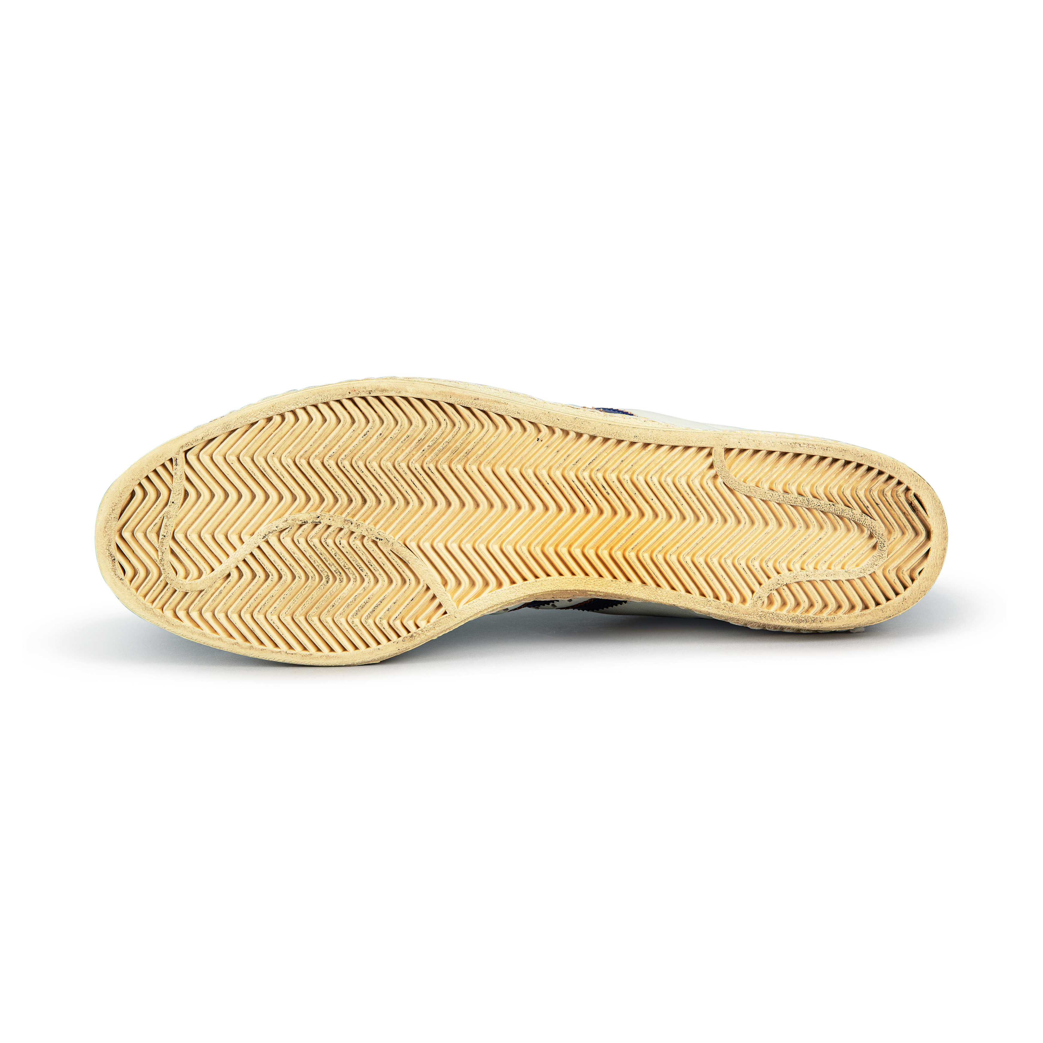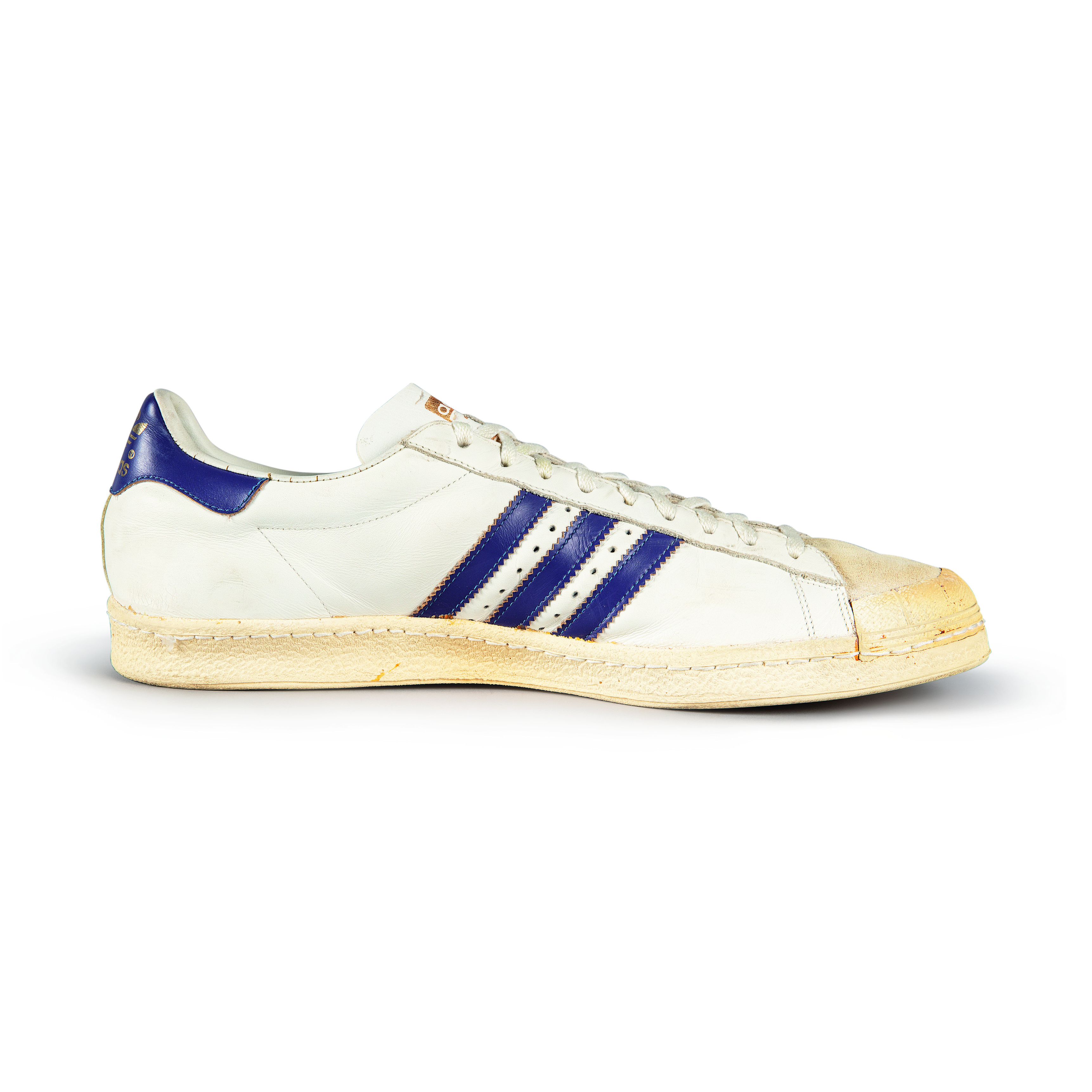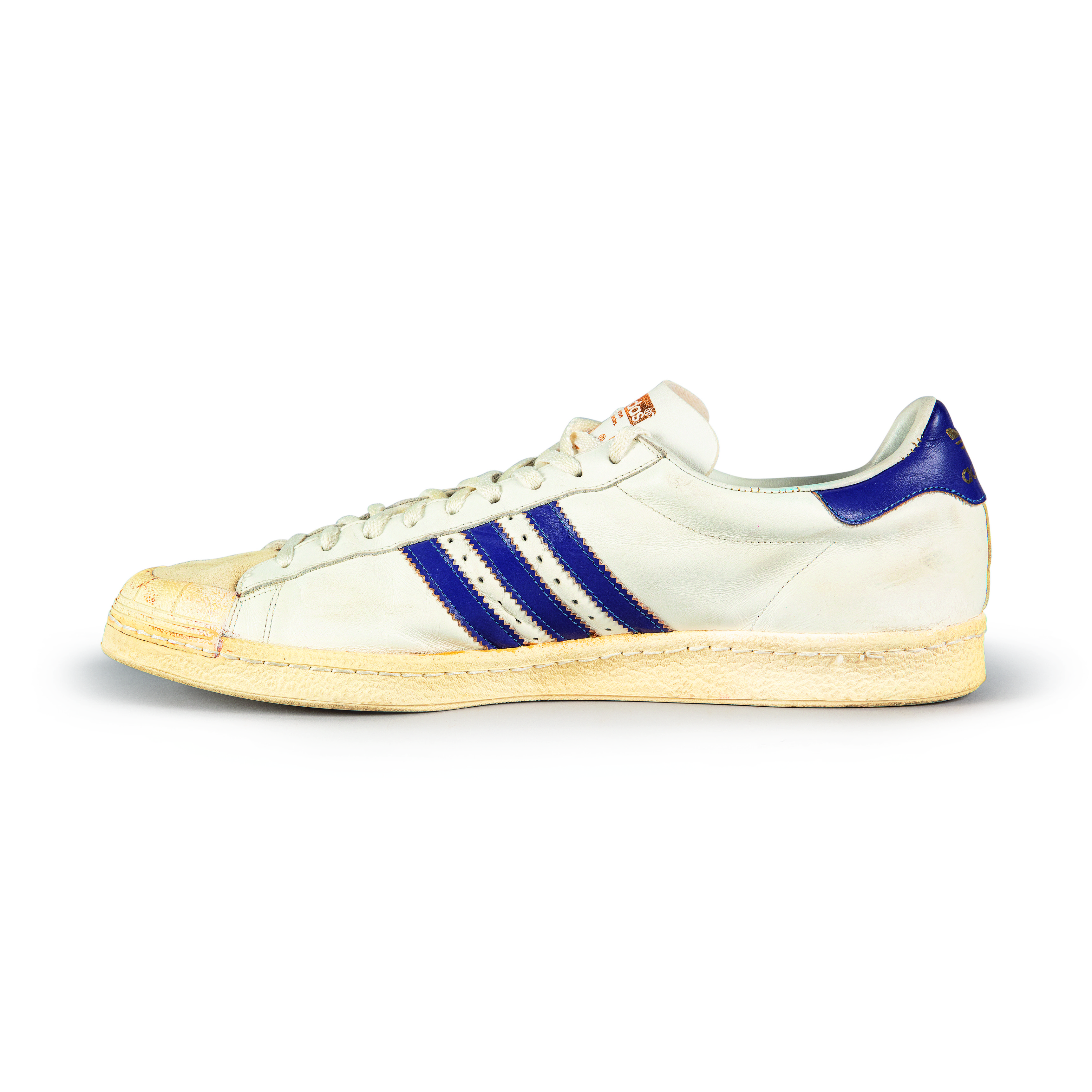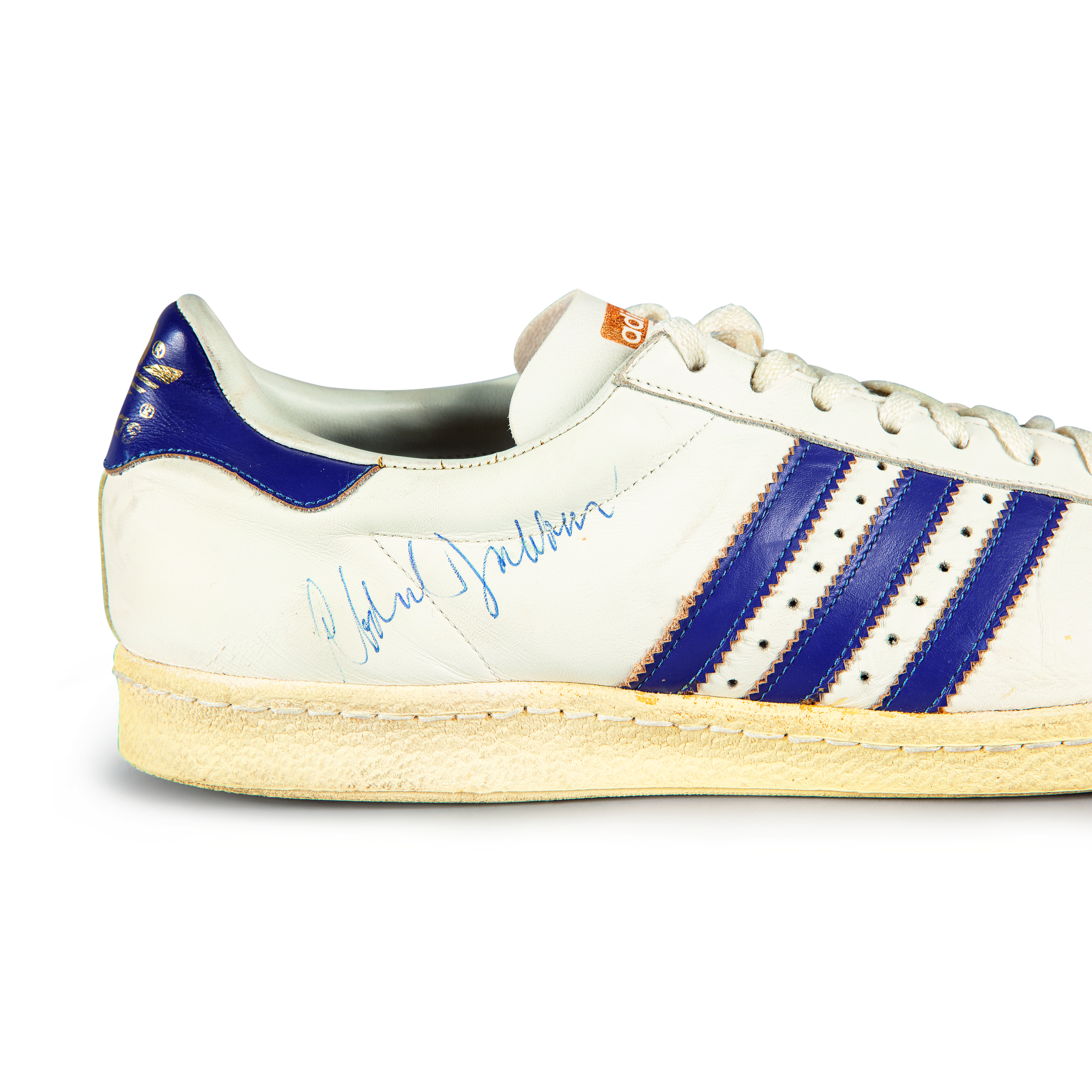 The legendary Kareem Abdul-Jabbar, also known as “The Captain”, has a combination of individual accolades and team successes that may never be matched in professional basketball. The seven foot two center ended his 20 year career in 1989 as NBA’s all-time leader in 9 statistical categories and still ranks first for the most points scored in NBA history. He began his NBA career as Rookie of the Year in 1969 and went on to win 6 championships, 2 Finals MVPs, and 6 Season MVPs. He is a 19 time NBA All-Star performer and member of the NBA’s 35th and 50th Anniversary All-Time teams.These specific game worn and dual signed adidas Superstars were worn by Abdul-Jabbar during his 1979-1980 season with the Los Angeles Lakers, which ended with the NBA title and Abdul-Jabbar’s sixth MVP win. The iconic Superstar designed by Chris Severn, is considered the first ever signature basketball shoe because of Abdul-Jabbar’s game use. He was the first basketball player contracted by adidas. Coined ‘Kareem’s Sky Hook Shoes’, for his trademark high-flying shot, Abdul-Jabbar preferred the lowcut silhouette to keep his ankles strong and minimize shock absorption to his knees. The style is also known as “Shell Toes” because of the rubber toe cap design.Player exclusive sample pair of Superstar shoes made for Kareem Abdul-Jabbar’s personal game use during the 1979-1980 season with the Los Angeles Lakers.Signed by Kareem Abdul-Jabbar in ball point pen at the lateral side of each shoe.Lakers inspired colorway in white leather uppers, suede toeboxes and rubber ‘Shell Toe’ caps with purple and gold accents.Purple and gold Three Stripes logo sewn with contrasting blue thread.Purple heel counters featuring adidas Trefoil branding in gold.Thin tongues labeled on interior side, “La Marque, Aux 3 Bandes” with adidas Trefoil branding and ‘Made in France’.Original laces.Game use authenticated by MEARS Authentication, LLC.Signatures authenticated by PSA/DNA.Certificate of Authenticity from Heritage Auctions.This pair is accompanied by a Letter of Provenance.This item is final sale and not eligible for return.