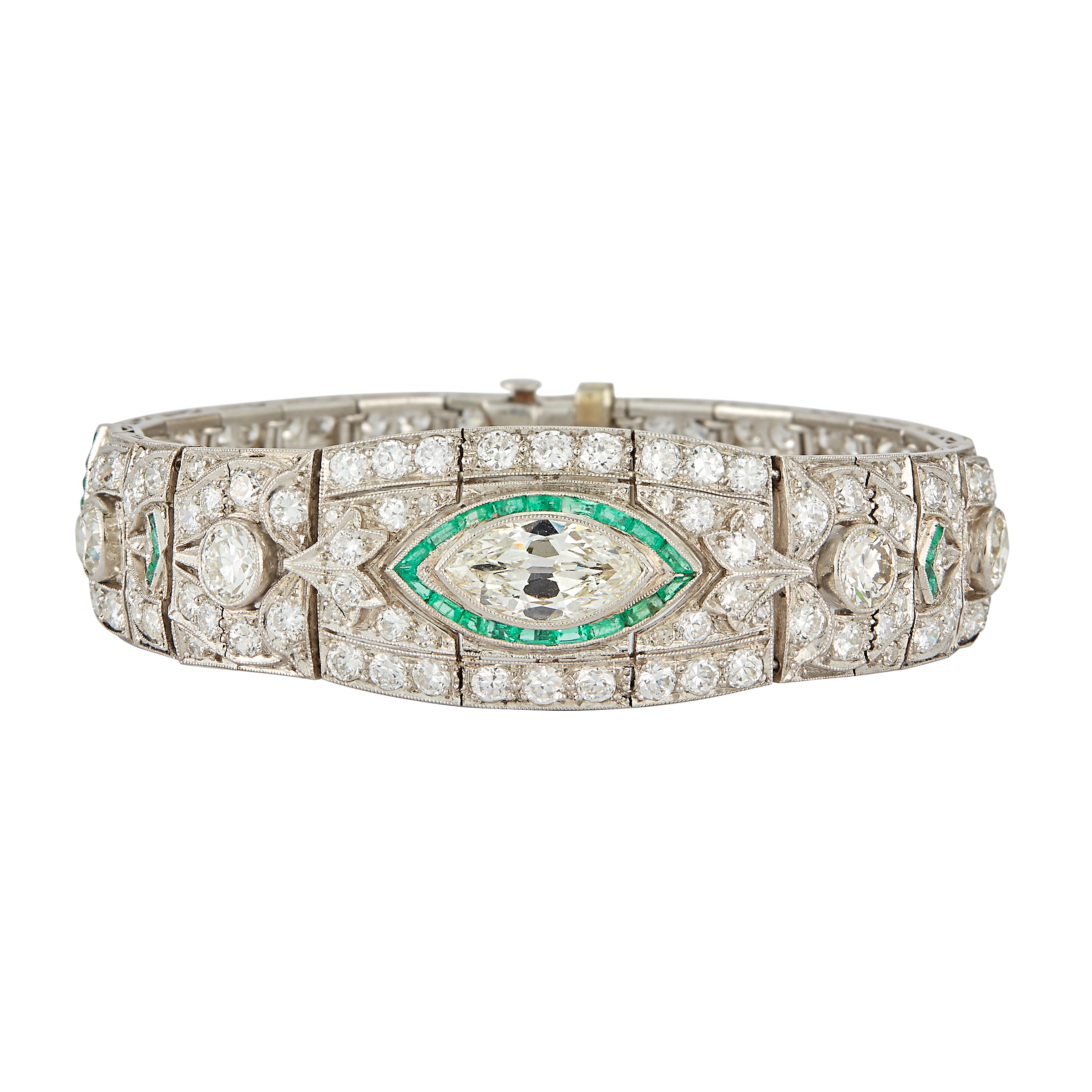 The strap-style bracelet centers a marquise-shaped diamond, accented with old European and single-cut diamonds and calibre-cut emeralds.Marquise-shaped diamond weighing approximately 1.50 caratsLength 6 3/4 inchesPlatinumCirca 1930