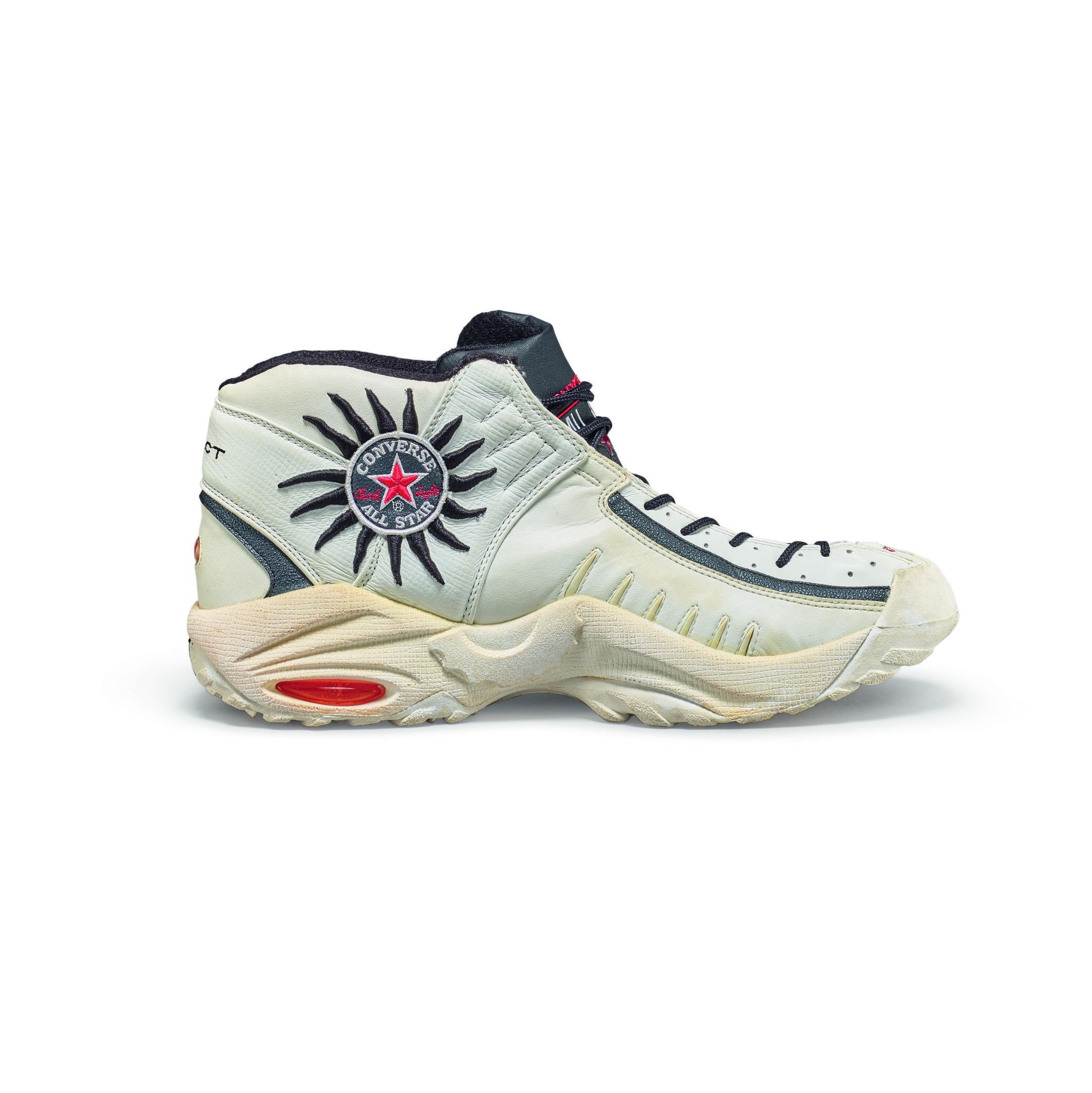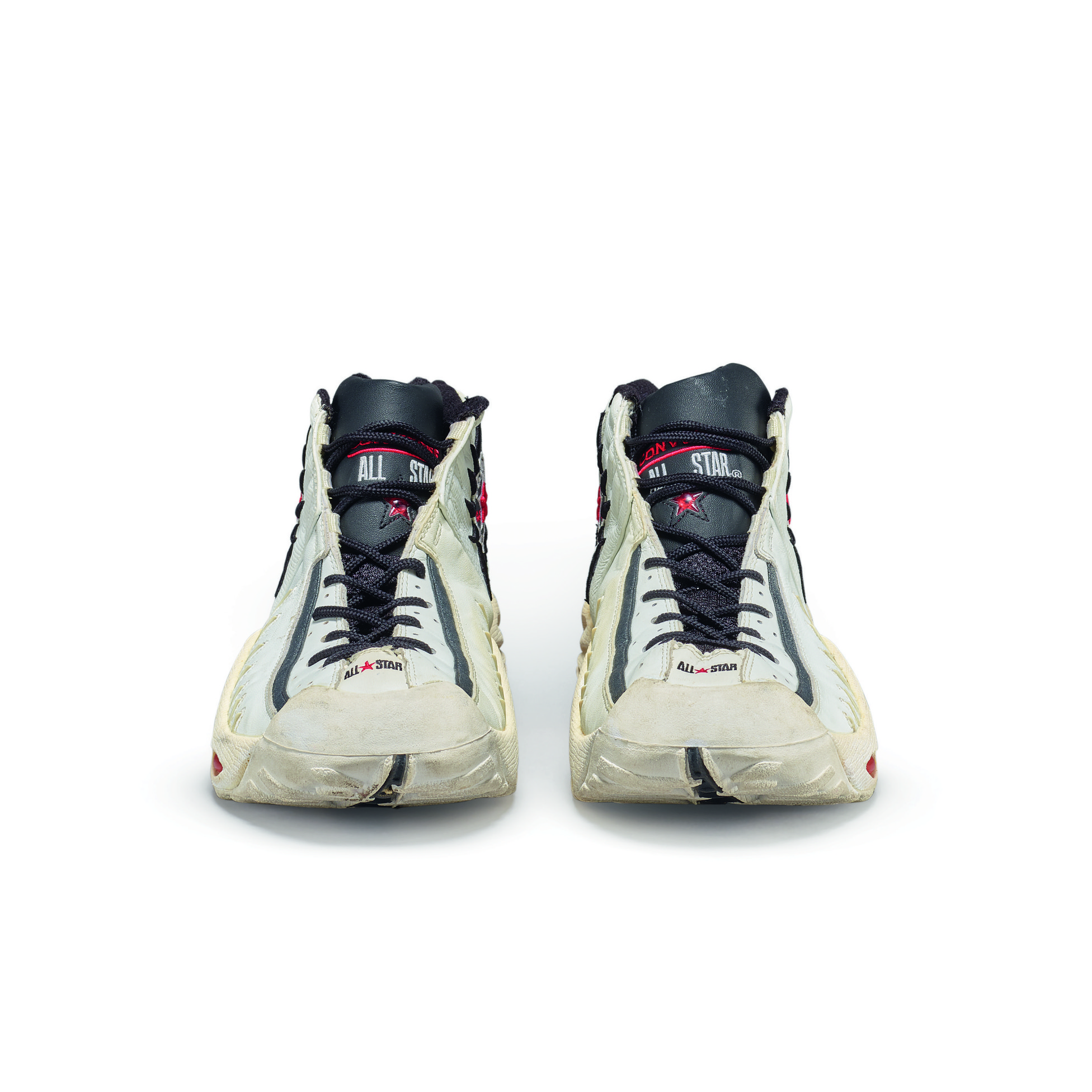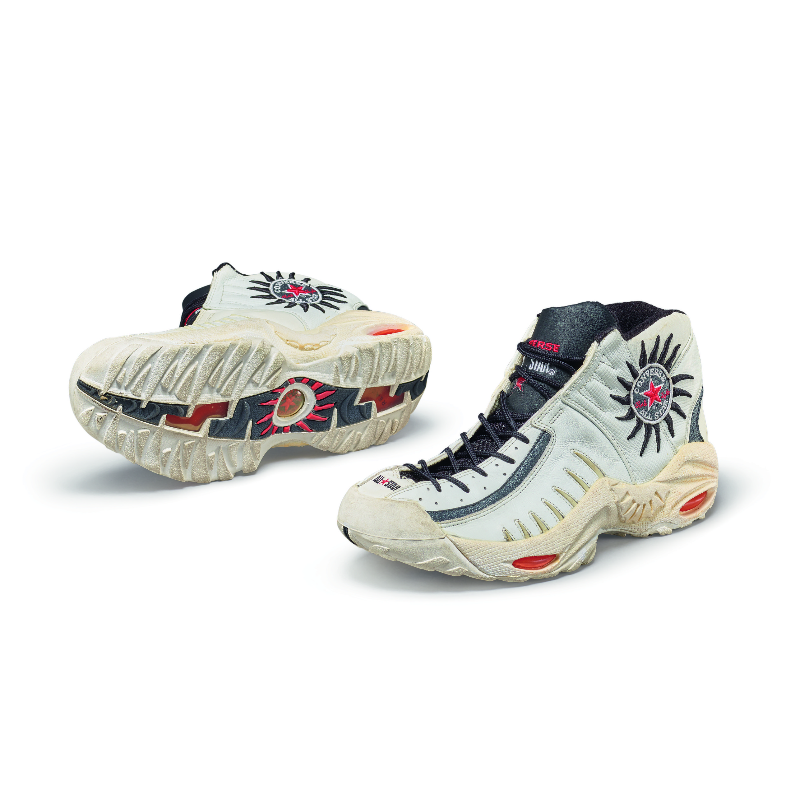This player sample sneaker was worn by Dennis Rodman during the 1997-1998 NBA season and postseason with the Chicago Bulls. The season would prove to be epic for the Bulls, winning their third consecutive NBA title with an 87-86 victory over the Utah Jazz in Game 6. During his three seasons in Chicago, Rodman won three titles and played a major role as part of the trio, along with Scottie Pippen and Michael Jordan, that created the 90s dynasty of NBA Championships in Chicago.Rodman began his final season with the Bulls wearing the All Star Rodman, his second signature model with Converse, and the first with his name. This design was inspired by Rodman’s signature body art and his intensity on the court. He is widely considered one of the best rebounders of all time. The seven lines at the forefoot represent his seven rebounding titles and the Converse logos at the heel and outsole mimic his sun tattoo.Converse All Star AS Rodmans player samples made exclusively for Dennis Rodman’s personal game use and worn during the 1997-1998 season.Chicago Bulls colorway with white uppers, black overlay, and red accents.Converse logos at the heel and outsole mimic Dennis Rodman's sun tattoo.Game use authenticated by MEARS Authentication, LLC.This item is final sale and not eligible for return.