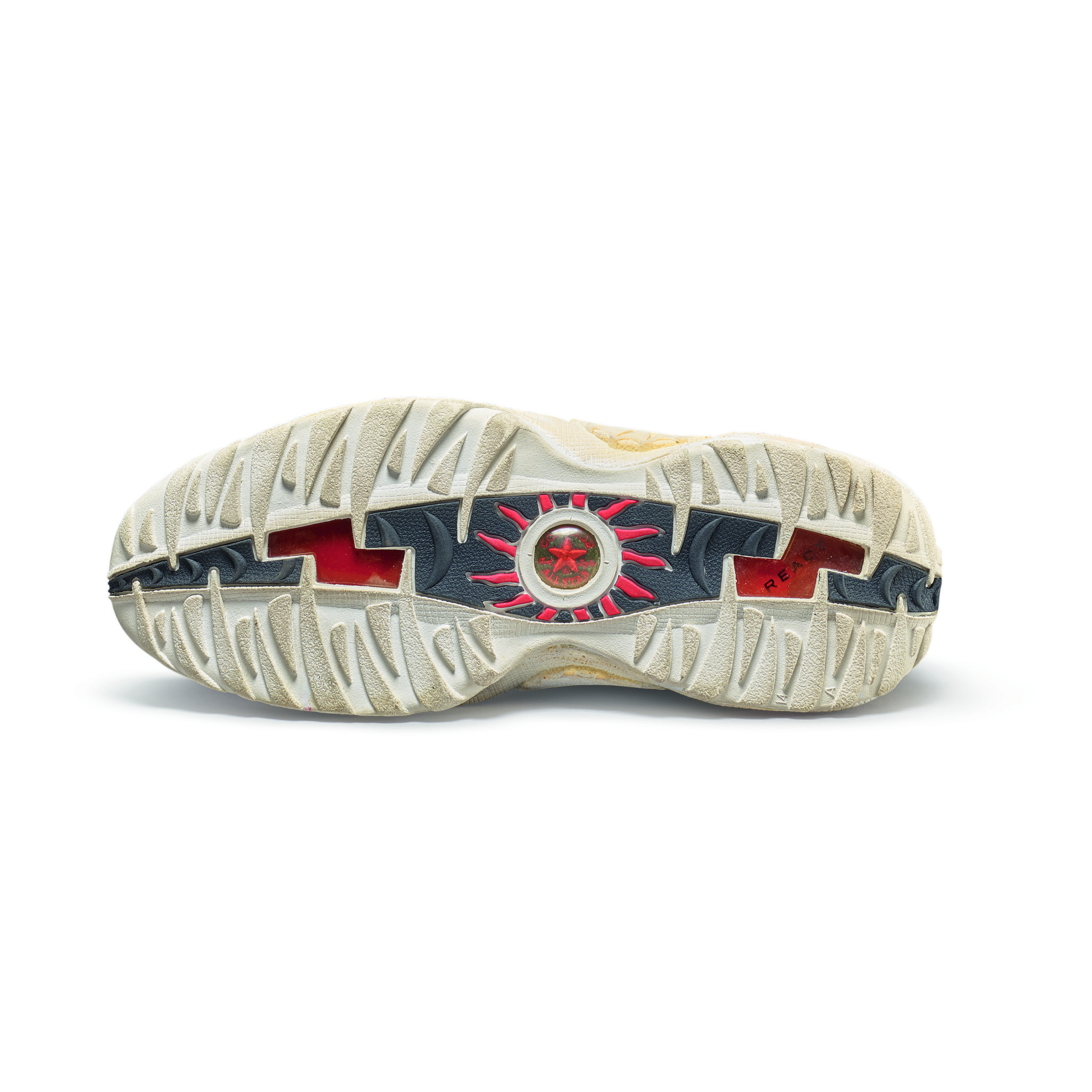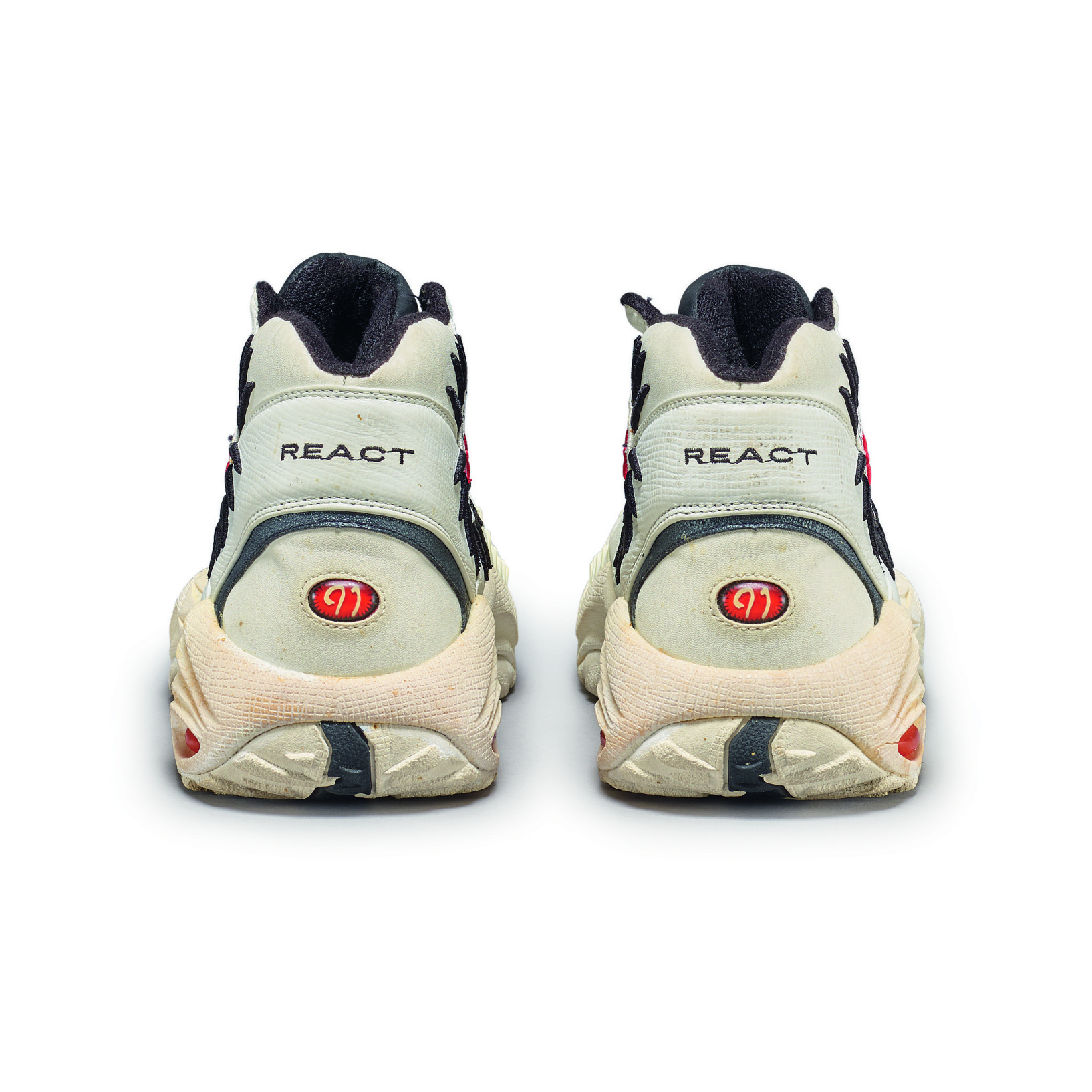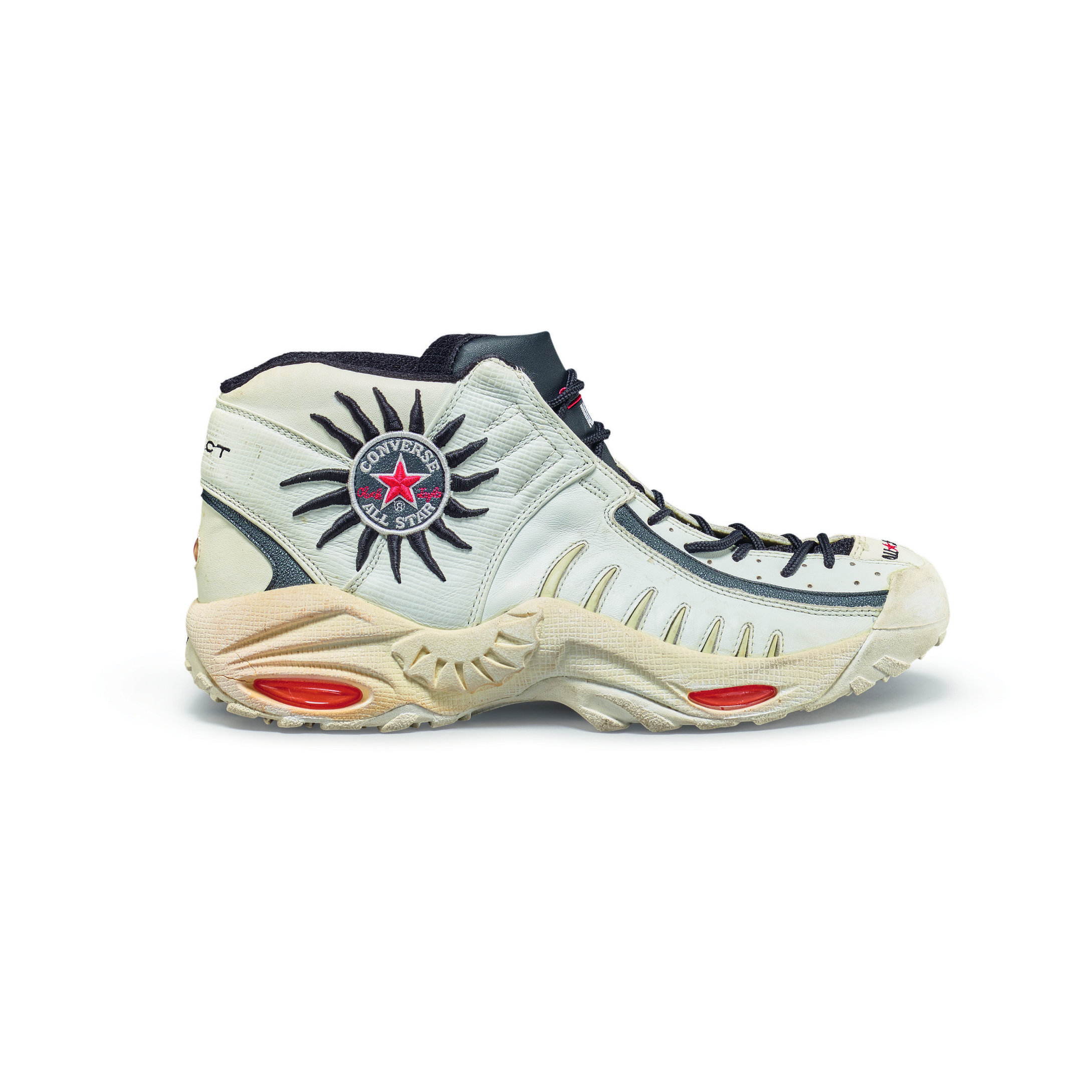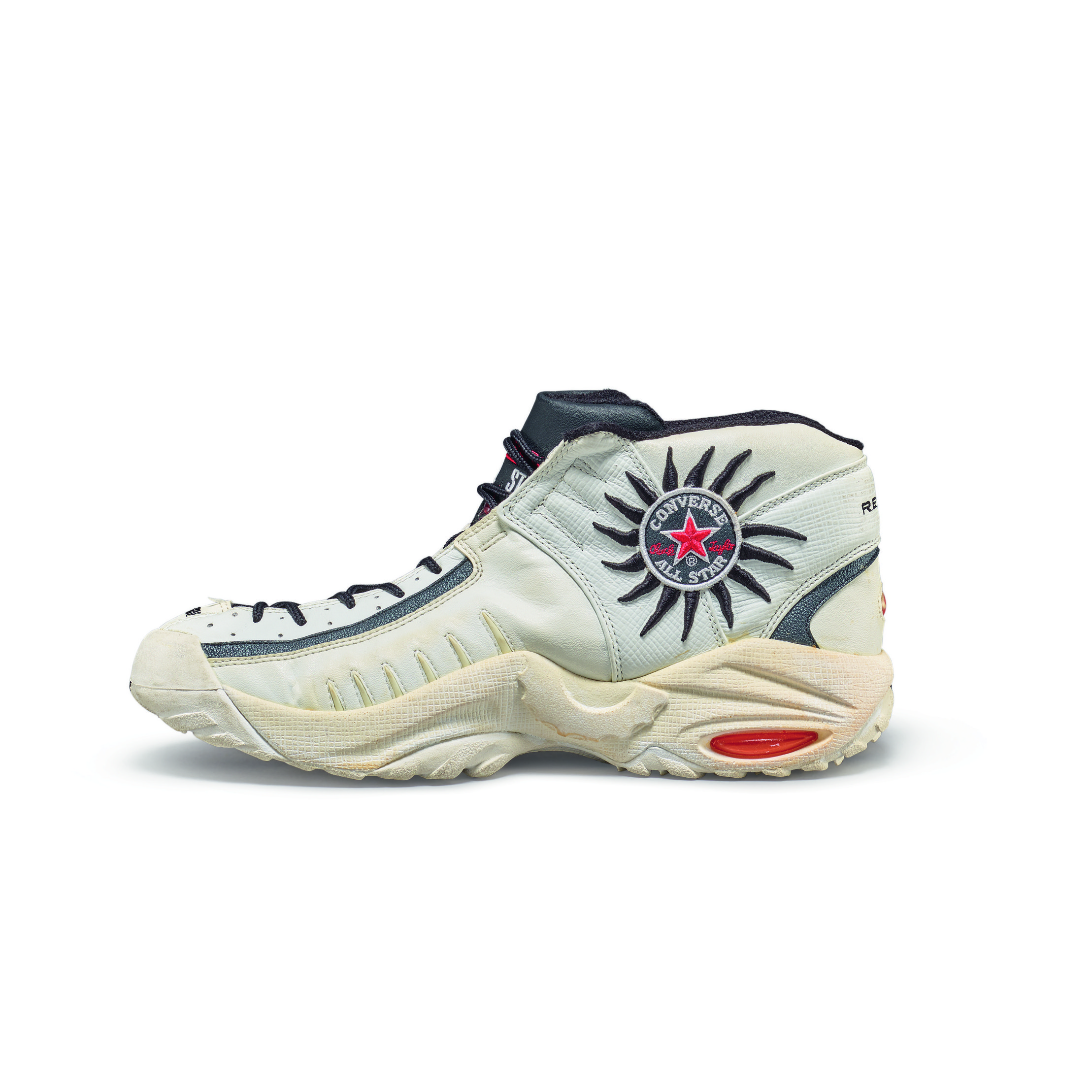 This player sample sneaker was worn by Dennis Rodman during the 1997-1998 NBA season and postseason with the Chicago Bulls. The season would prove to be epic for the Bulls, winning their third consecutive NBA title with an 87-86 victory over the Utah Jazz in Game 6. During his three seasons in Chicago, Rodman won three titles and played a major role as part of the trio, along with Scottie Pippen and Michael Jordan, that created the 90s dynasty of NBA Championships in Chicago.Rodman began his final season with the Bulls wearing the All Star Rodman, his second signature model with Converse, and the first with his name. This design was inspired by Rodman’s signature body art and his intensity on the court. He is widely considered one of the best rebounders of all time. The seven lines at the forefoot represent his seven rebounding titles and the Converse logos at the heel and outsole mimic his sun tattoo.Converse All Star AS Rodmans player samples made exclusively for Dennis Rodman’s personal game use and worn during the 1997-1998 season.Chicago Bulls colorway with white uppers, black overlay, and red accents.Converse logos at the heel and outsole mimic Dennis Rodman's sun tattoo.Game use authenticated by MEARS Authentication, LLC.This item is final sale and not eligible for return.