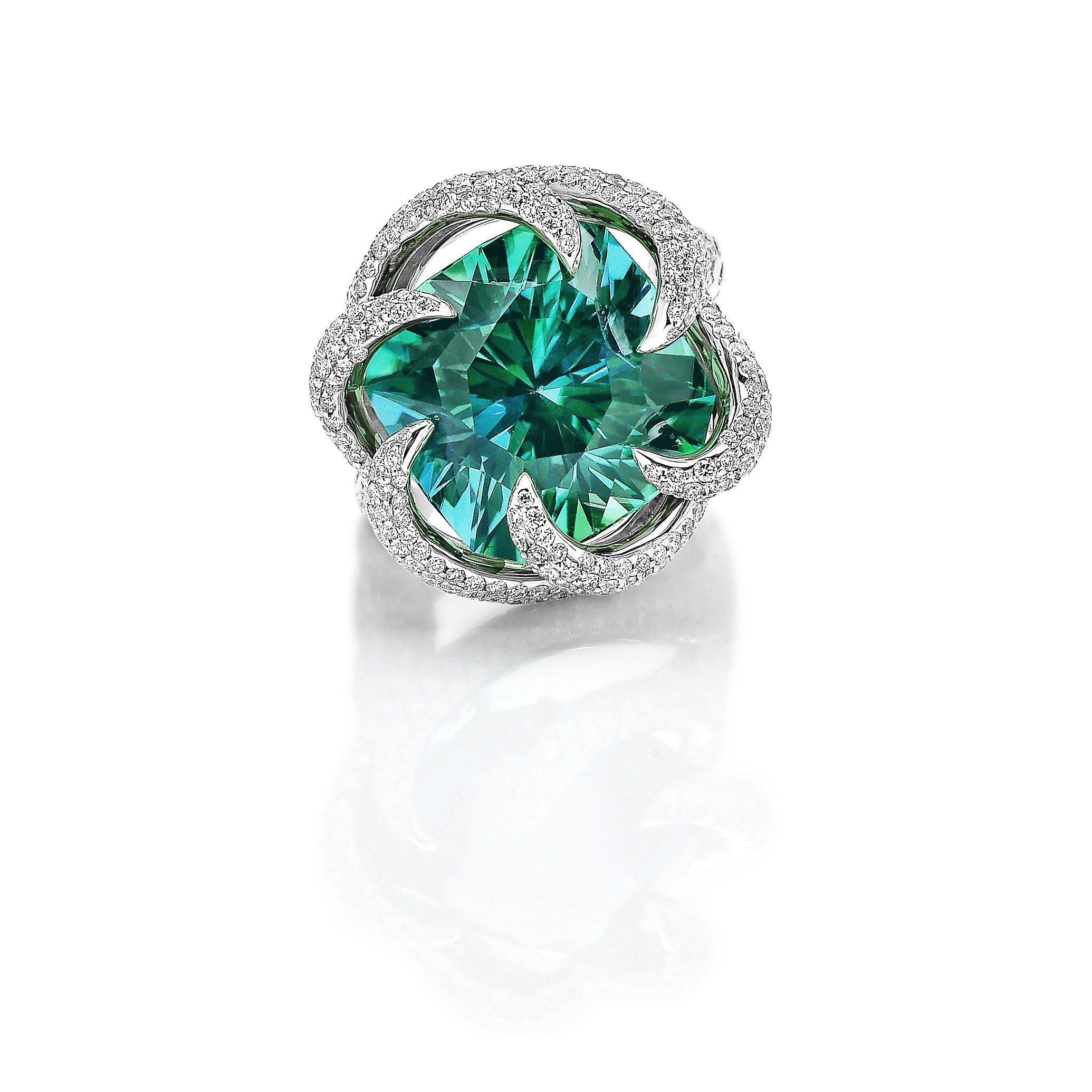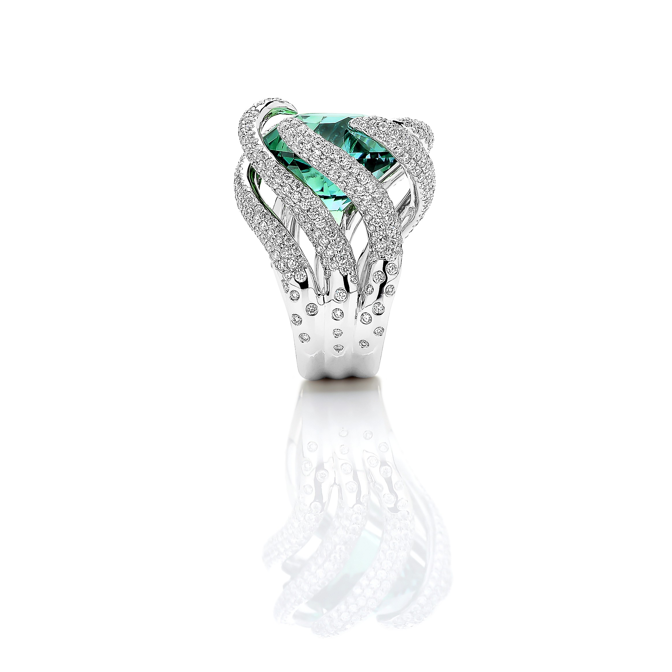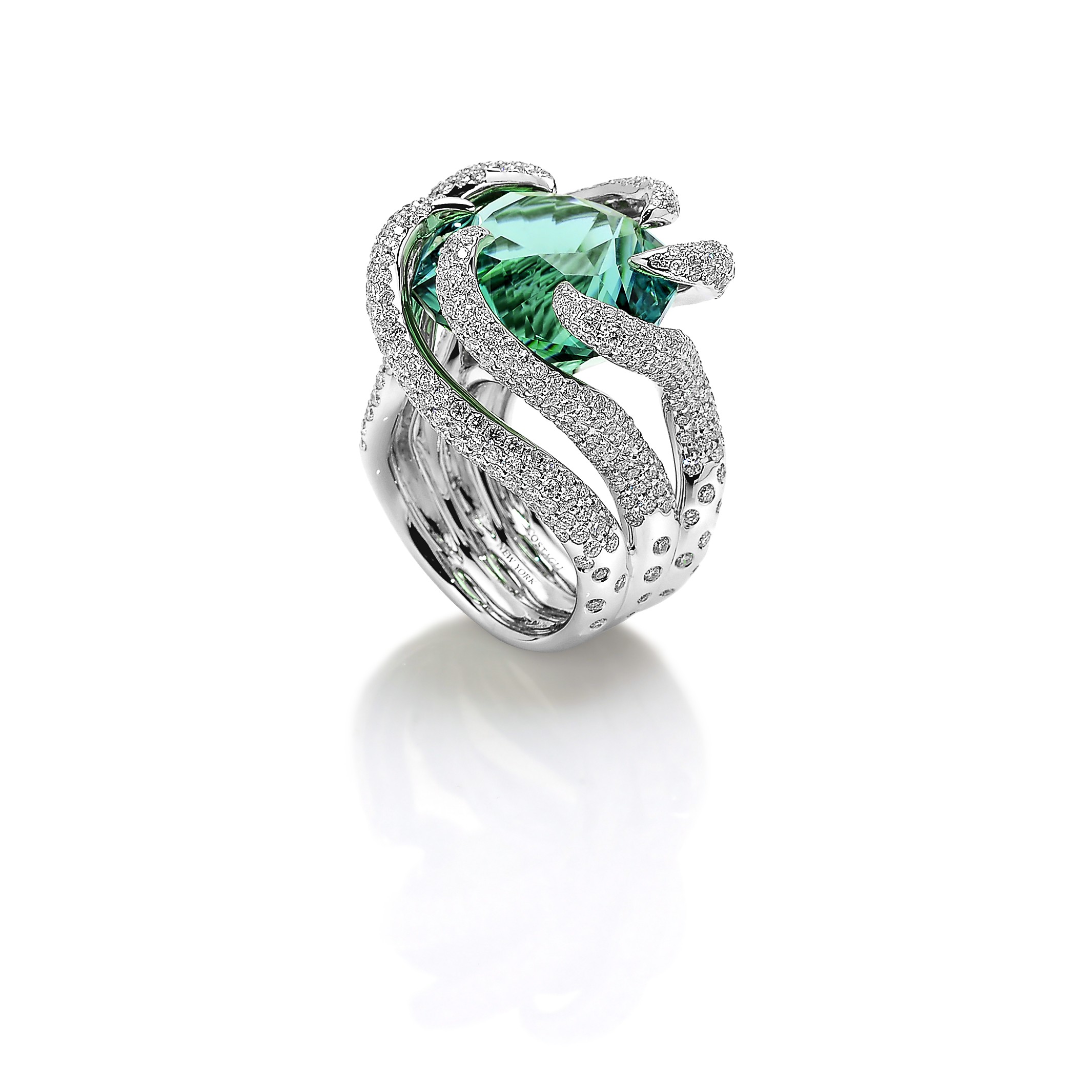 Centering a cushion-shaped bluish green tourmaline, within a swirled mounting decorated with round diamonds.Tourmaline weighing approximately 23.00 caratsDiamonds weighing a total of approximately 4.00 caratsSize 6½Signed Costagli, New York18 karat white gold