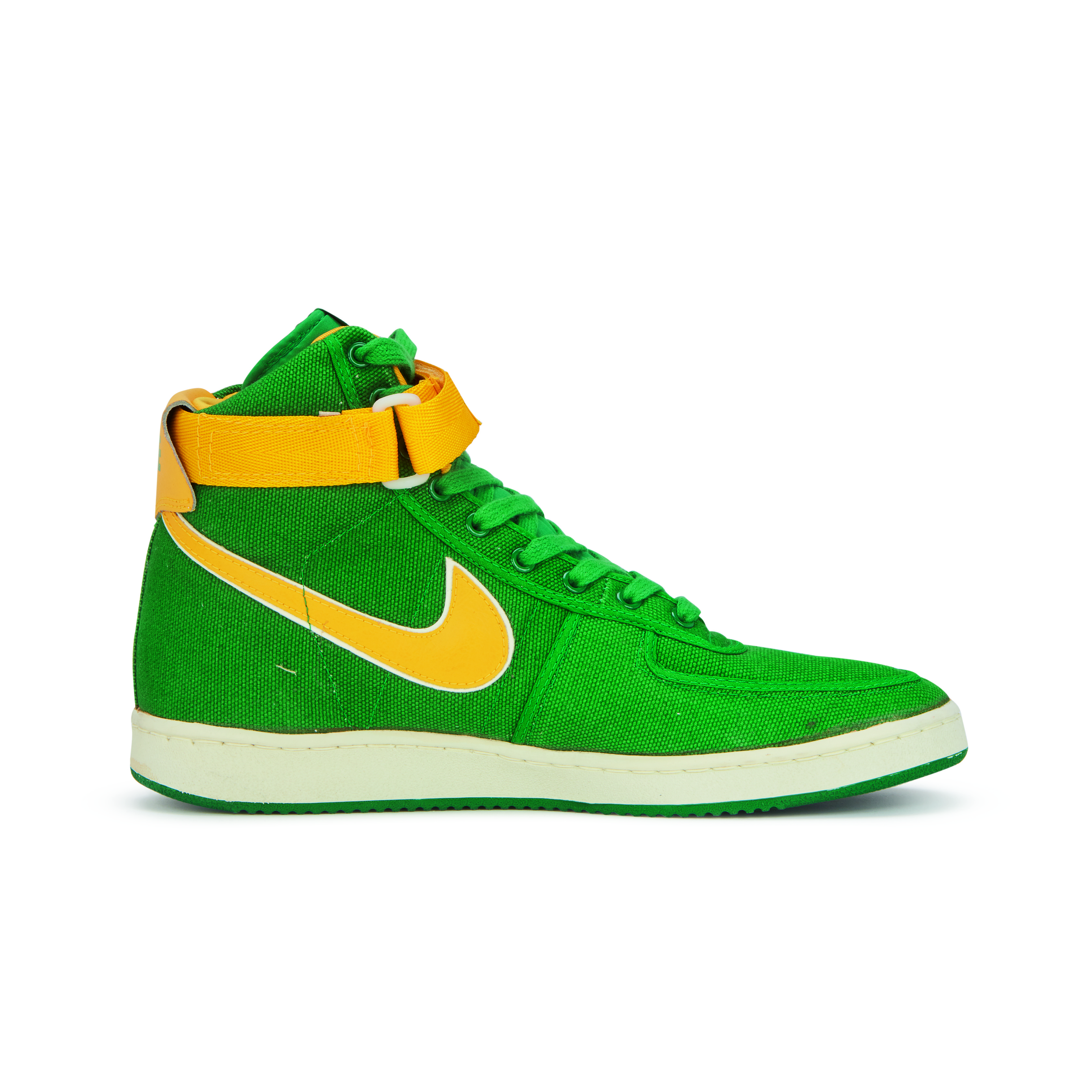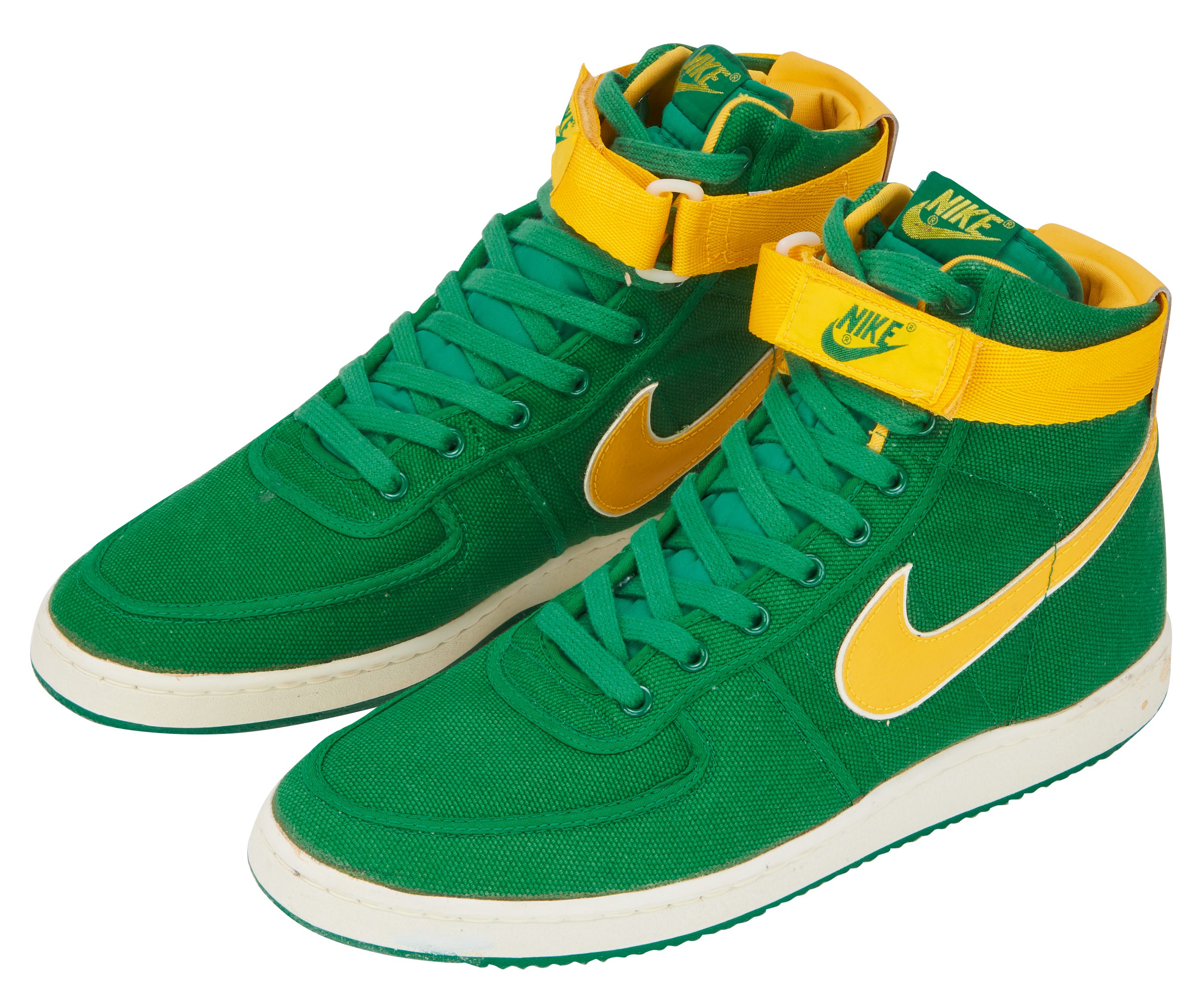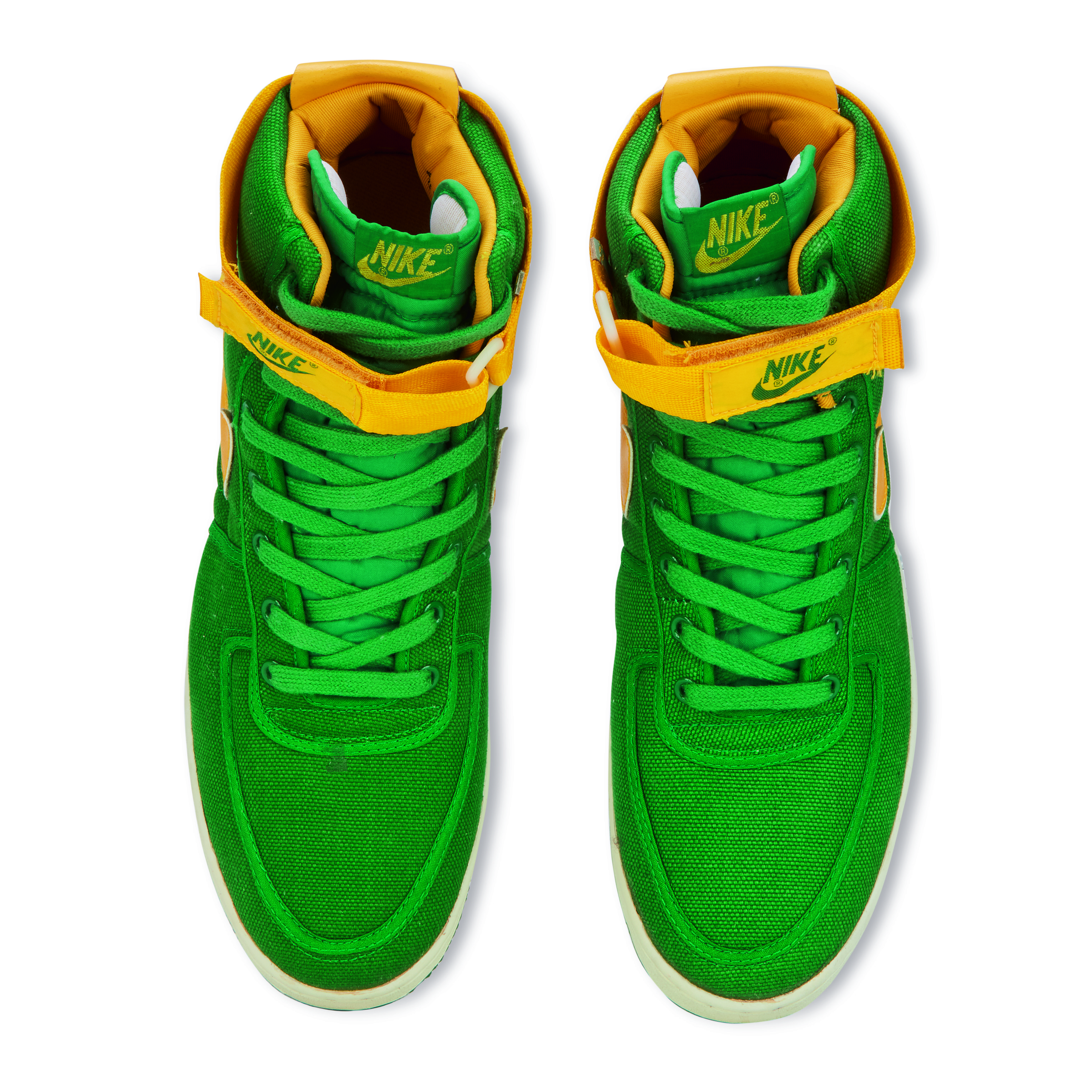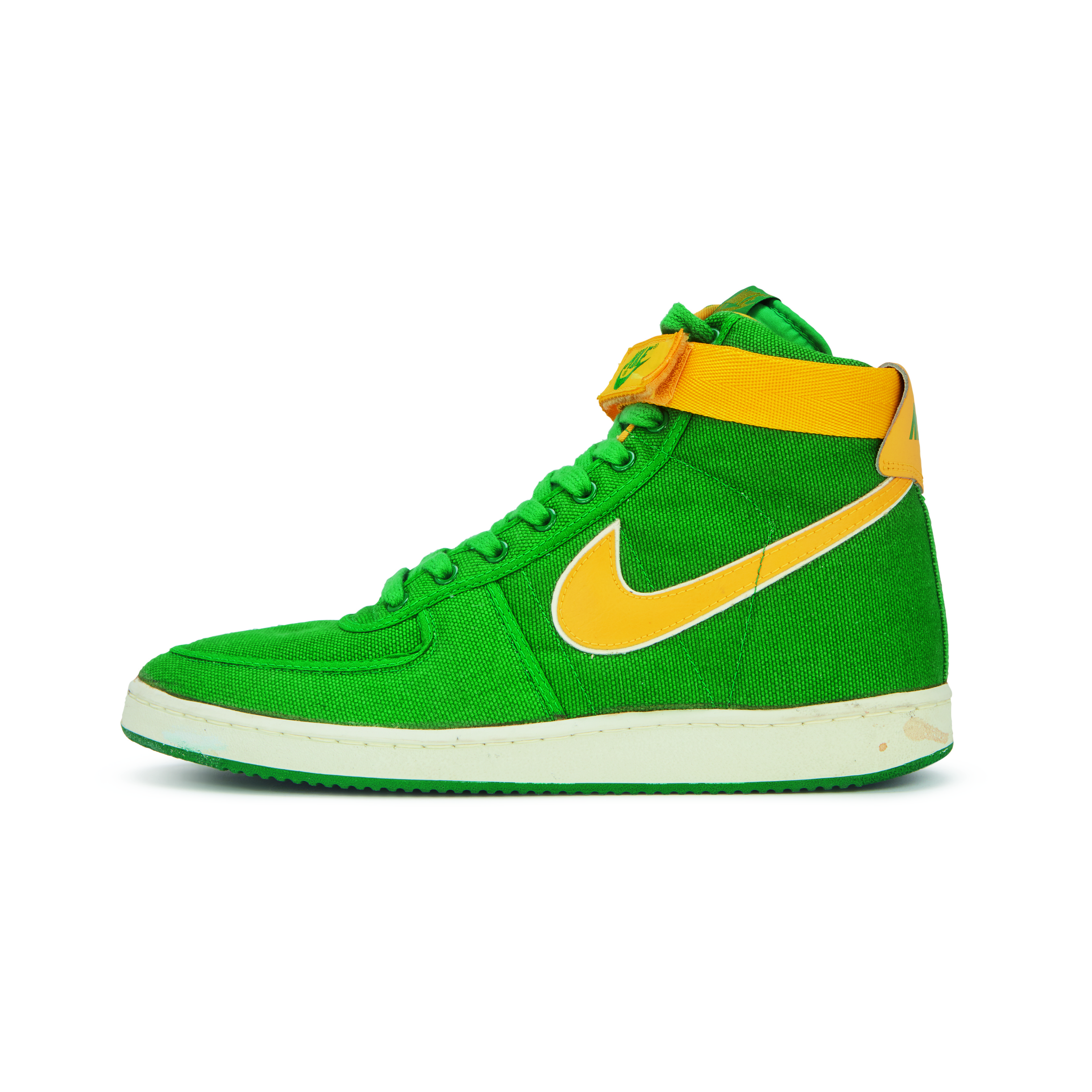 Featured on Kyle Reese in the Terminator and on Doc Brown in Back to the Future, the Vandal was originally released in 1984 for basketball but have become an iconic lifestyle shoe. They are known for the Velcro ankle ‘stability straps’ and pivot-point outsole, the same soles featured on the canvas Air Jordan K.O. or 'AJKOs' from 1986.An original pair of Vandals from the release year 1984. Oregon Ducks inspired colorway with green canvas uppers, yellow leather Swoosh and yellow Velcro ankle straps.White midsoles and green pivot-point outsoles.Nike branding on tongue tab, Velcro strap, and heel tab.This item is final sale and not eligible for return.