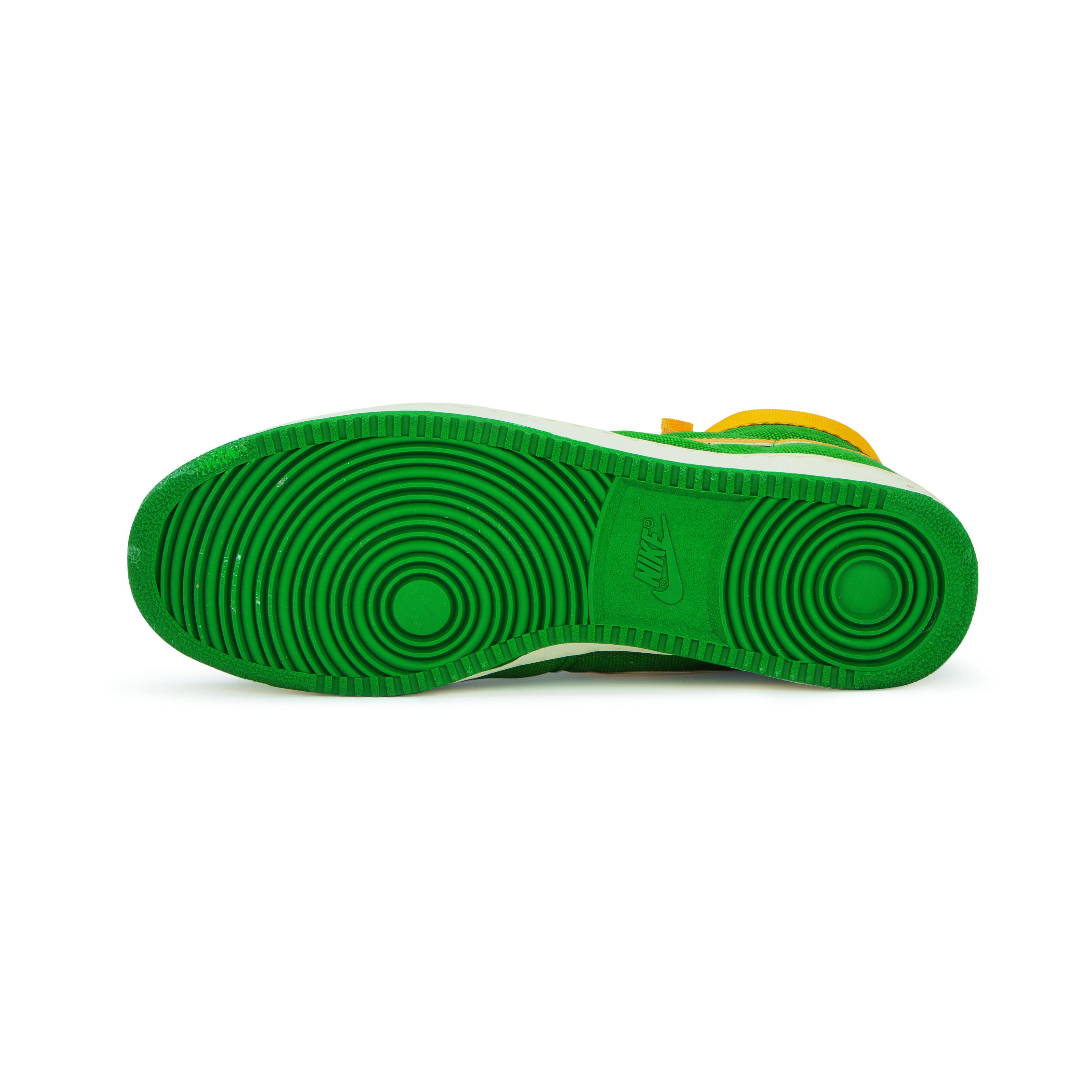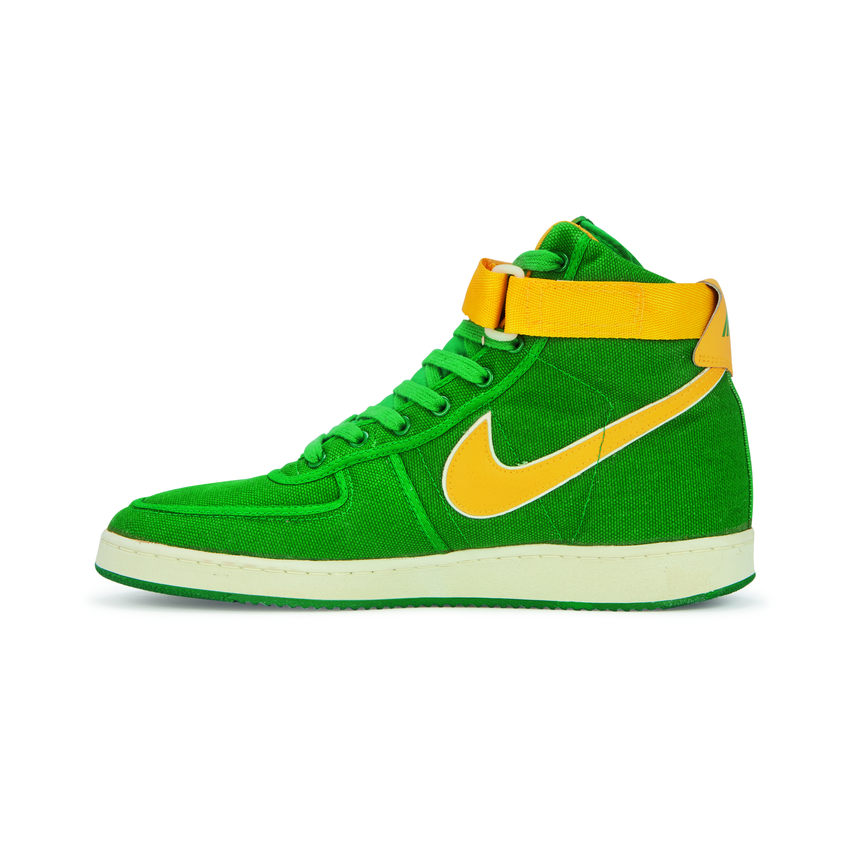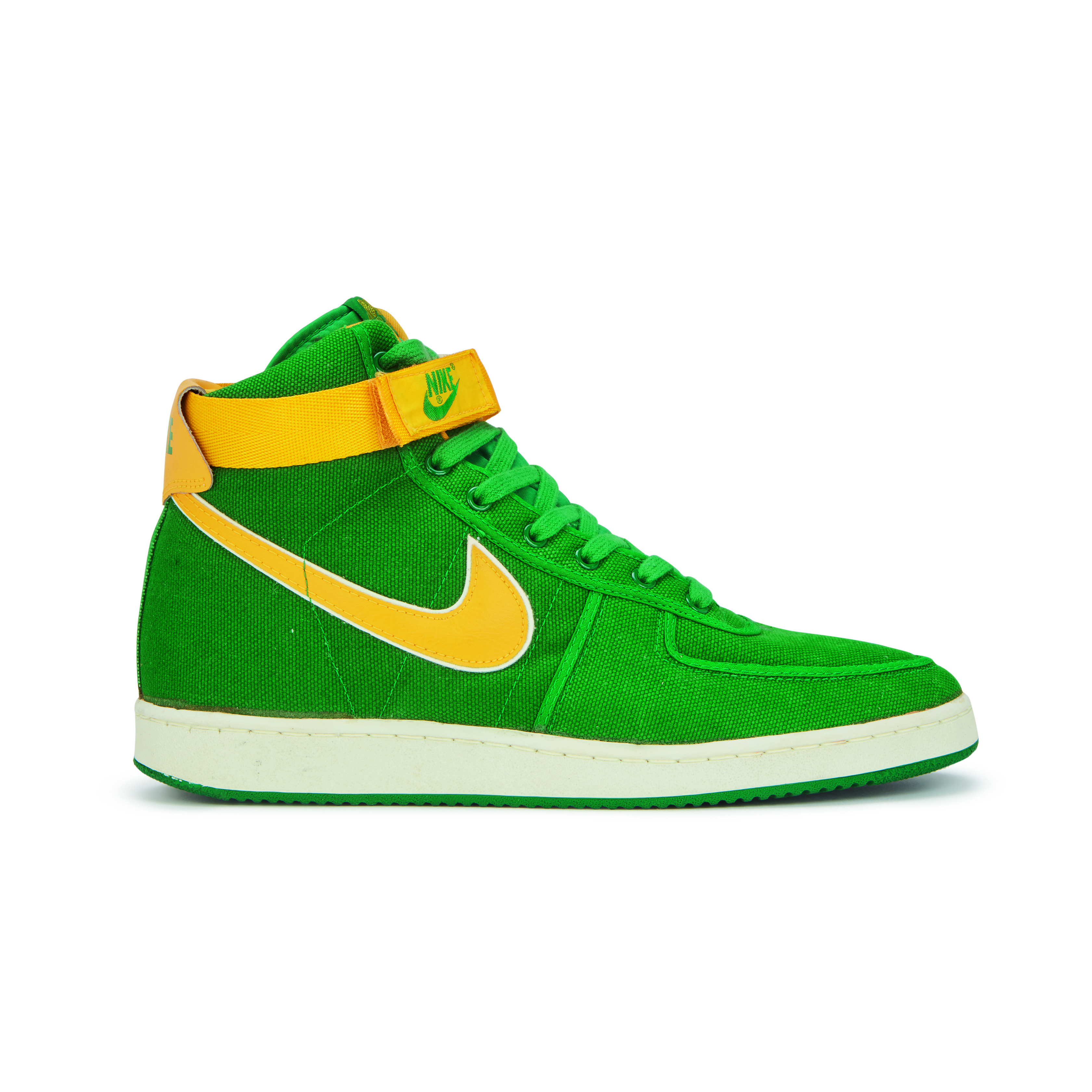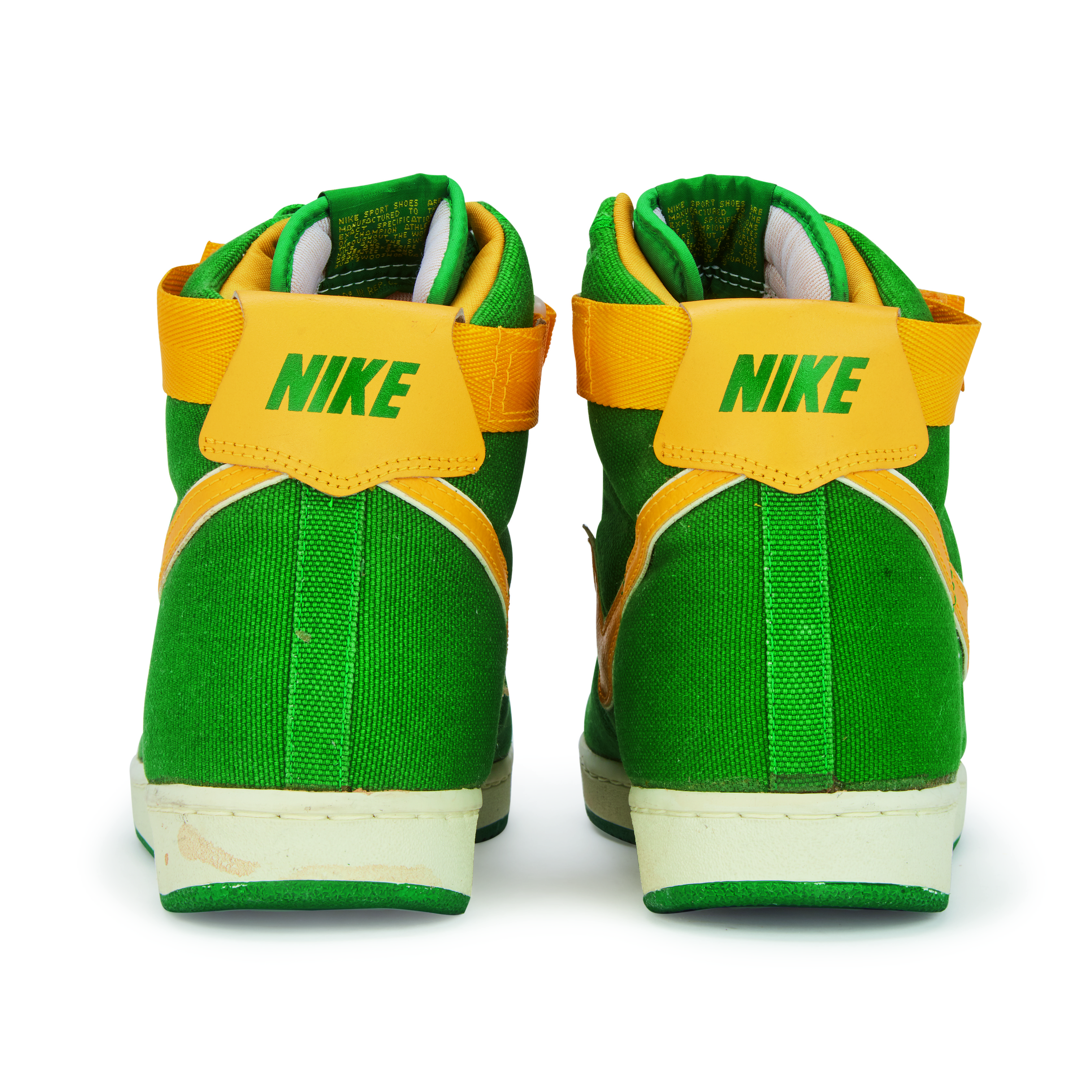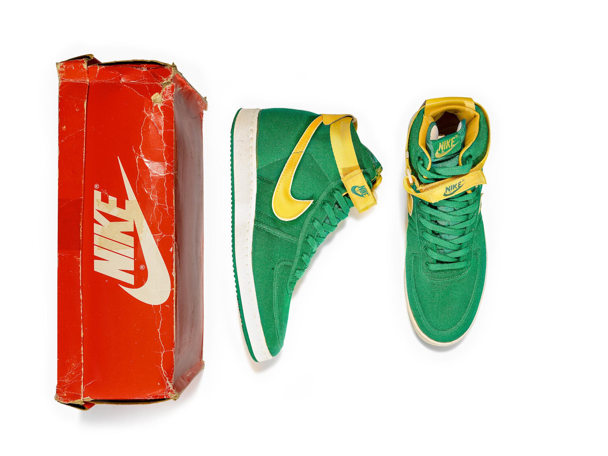 Featured on Kyle Reese in the Terminator and on Doc Brown in Back to the Future, the Vandal was originally released in 1984 for basketball but have become an iconic lifestyle shoe. They are known for the Velcro ankle ‘stability straps’ and pivot-point outsole, the same soles featured on the canvas Air Jordan K.O. or 'AJKOs' from 1986.An original pair of Vandals from the release year 1984. Oregon Ducks inspired colorway with green canvas uppers, yellow leather Swoosh and yellow Velcro ankle straps.White midsoles and green pivot-point outsoles.Nike branding on tongue tab, Velcro strap, and heel tab.This item is final sale and not eligible for return.