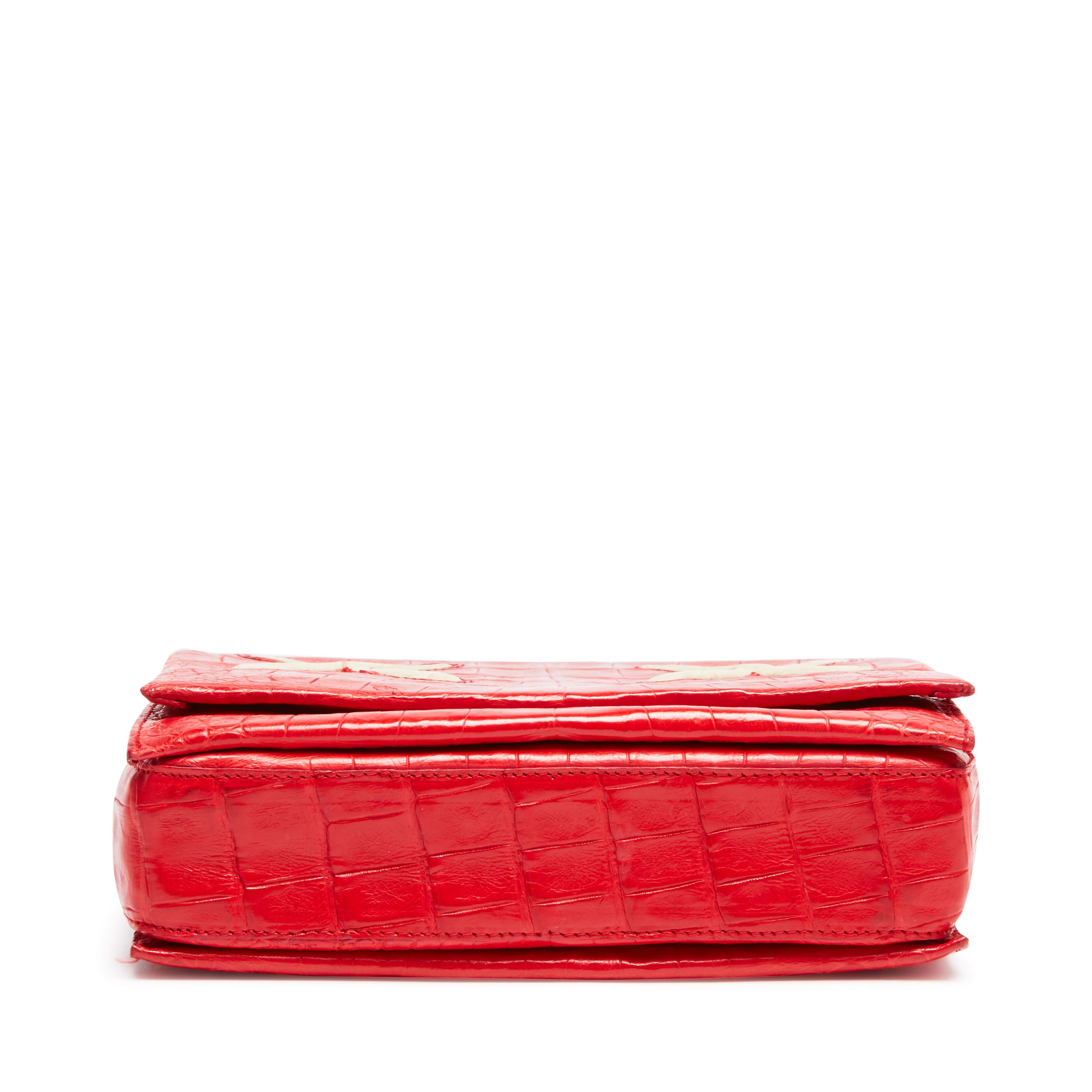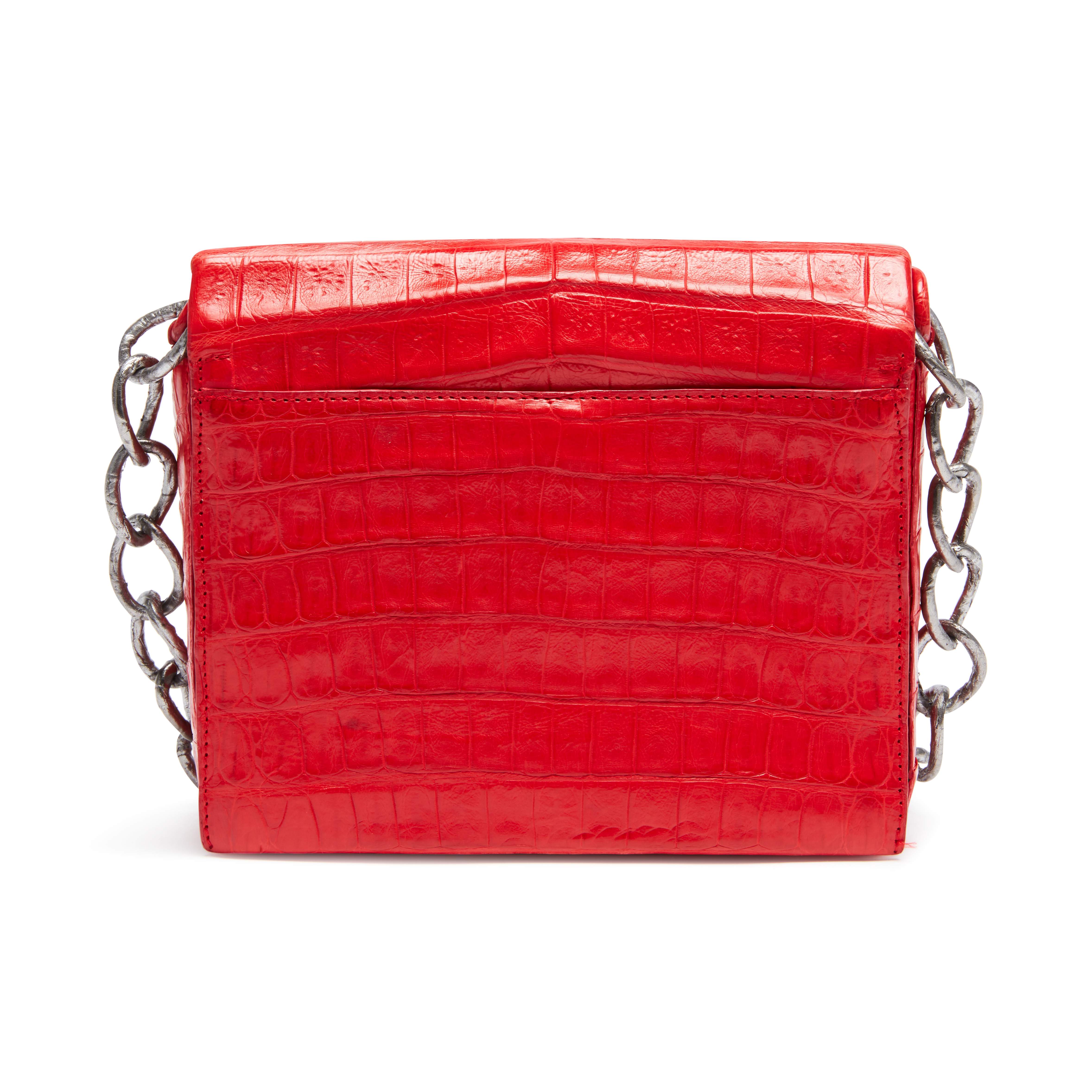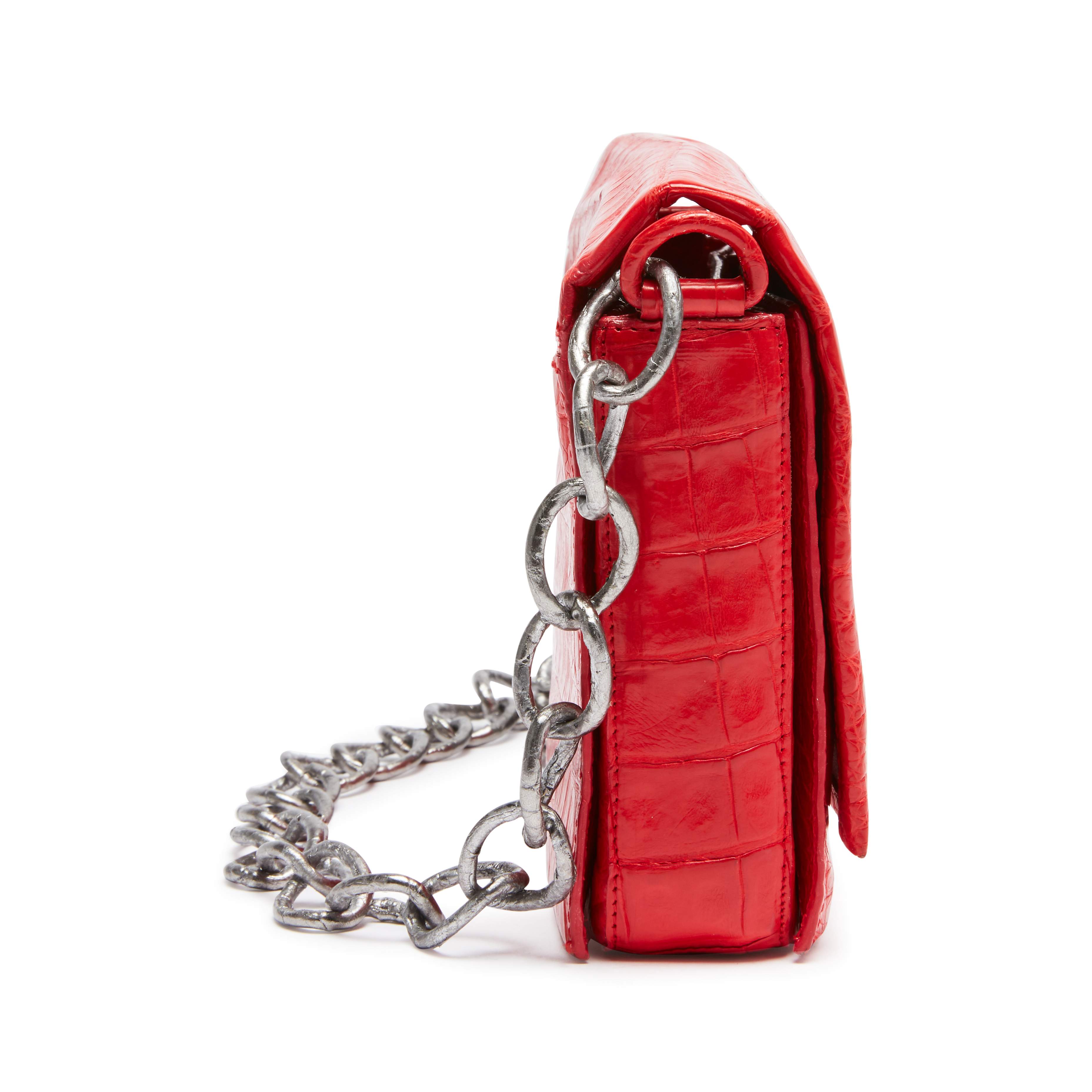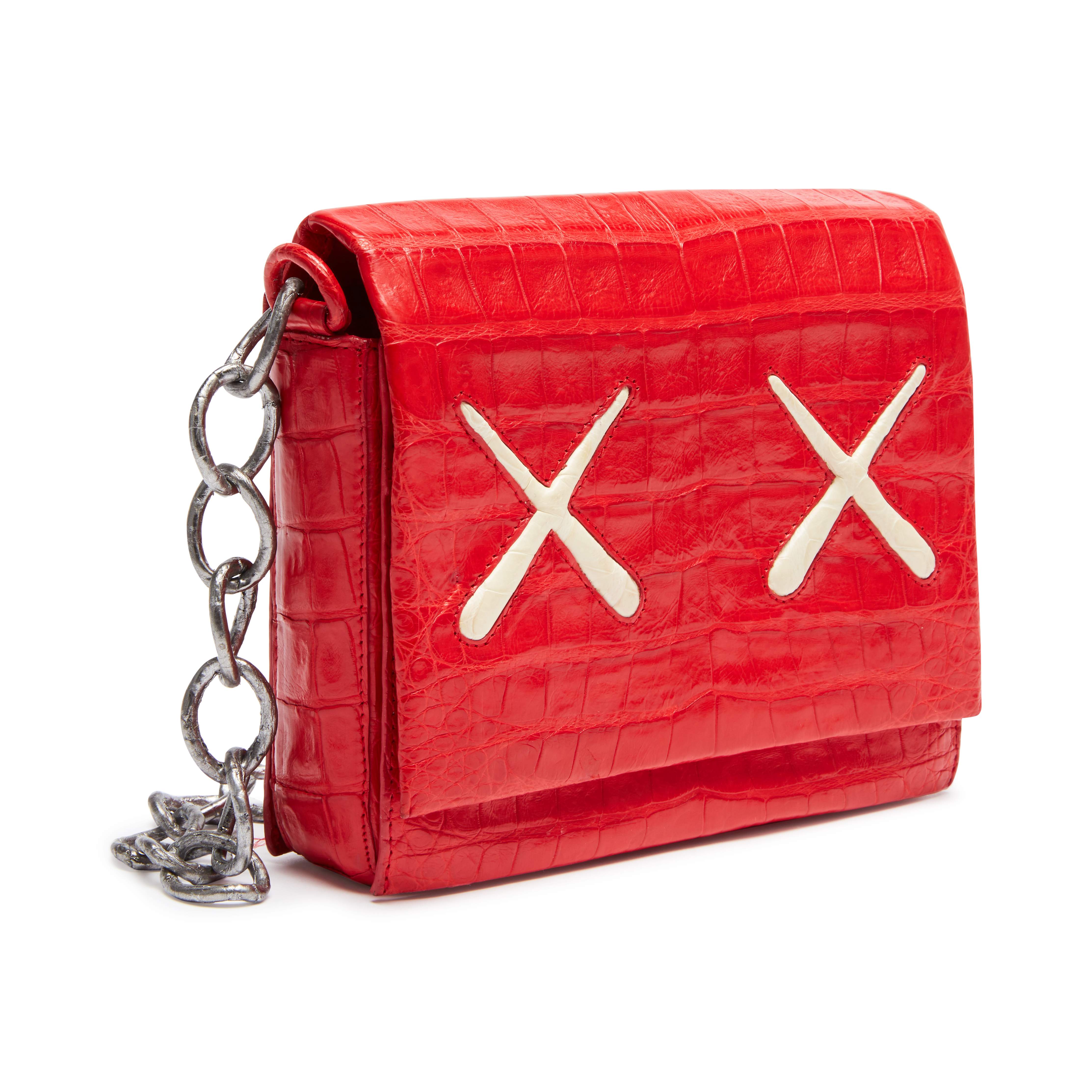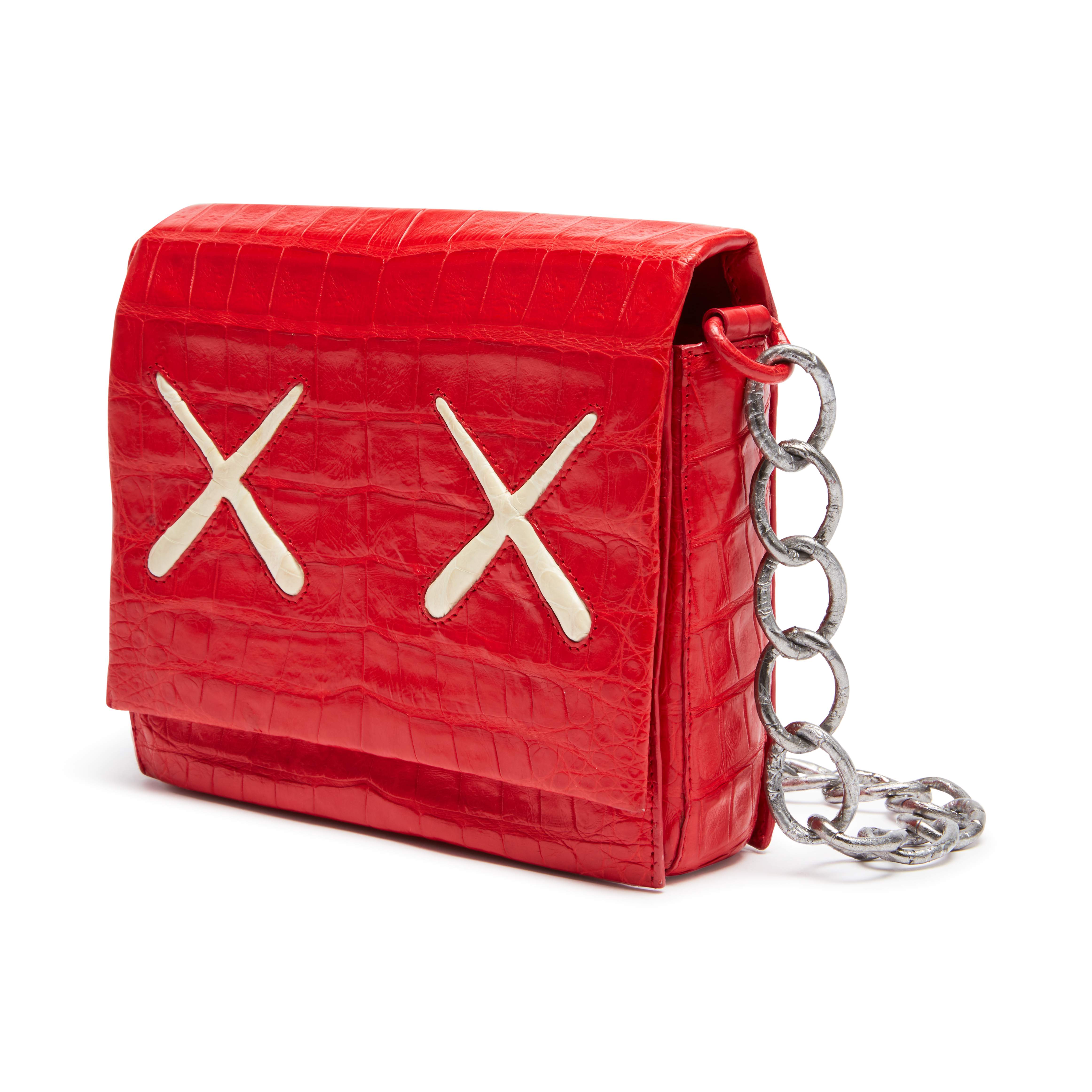 Nancy Gonzalez X KAWS Red with White XX Gio Crossbody Bag in Crocodile Leather with Silver Tone Hardware, 2016Signature Caiman crocodile crossbody with X details.Flap top with hidden magnetic closure.Exterior back slip pocket.Interior with suede lining, triple-gusset and two card slots.Self-covered chain crossbody strap.Limited Edition.Includes dustbag and box.