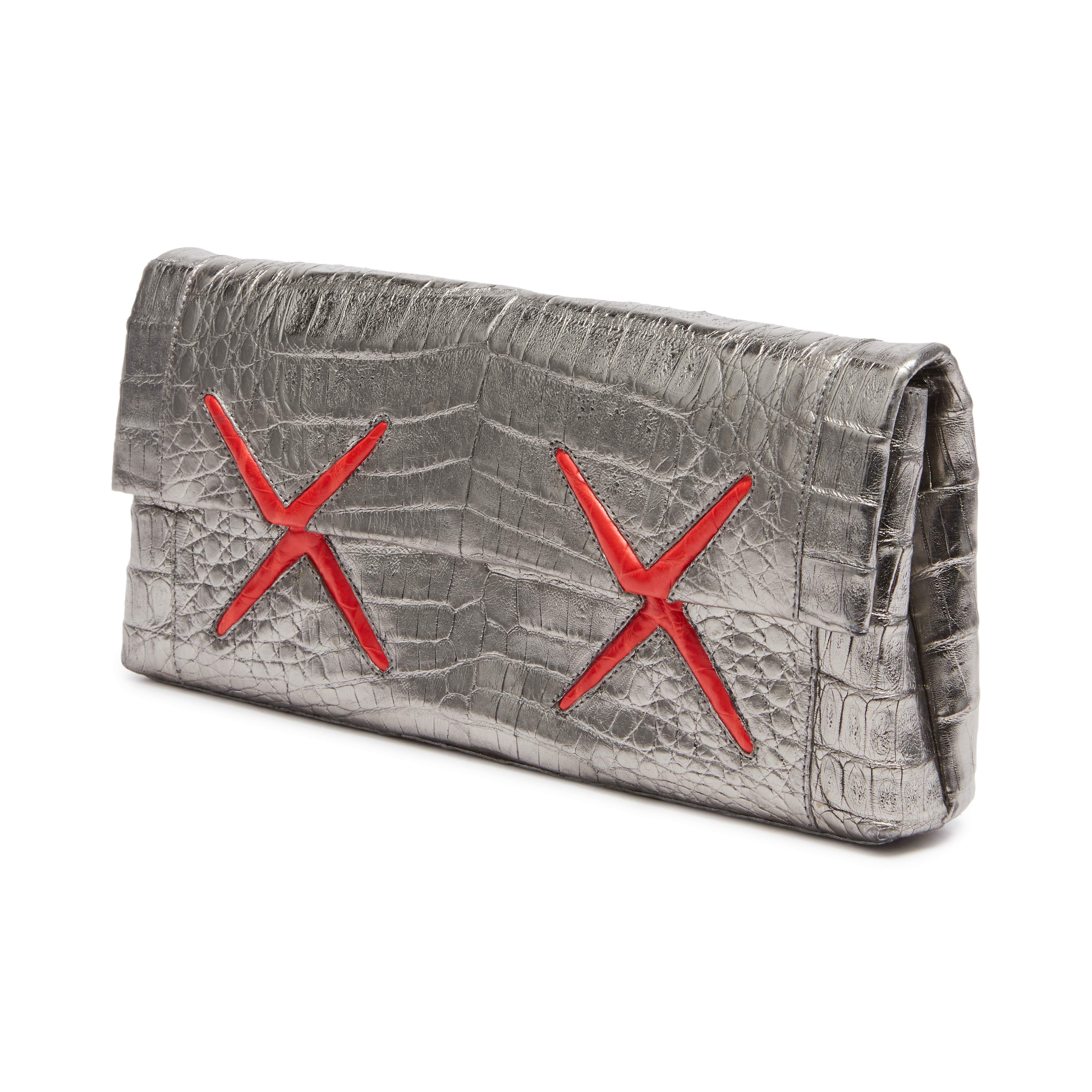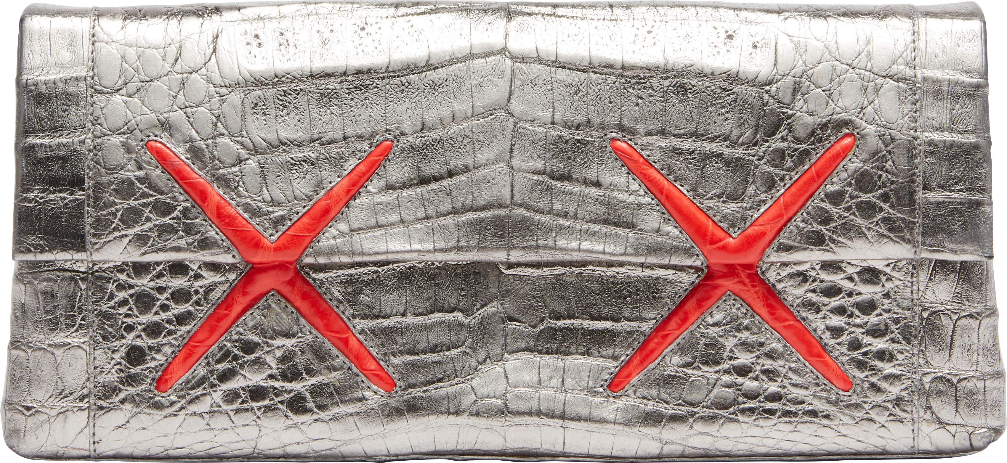 Nancy Gonzalez X KAWS Silver with Red XX Gotham Clutch in Crocodile Leather, 2016Signature Caiman crocodile clutch with X details.Flap top with hidden magnetic closure.Interior with suede lining, zip and open pockets.Limited Edition.Includes dustbag and box.