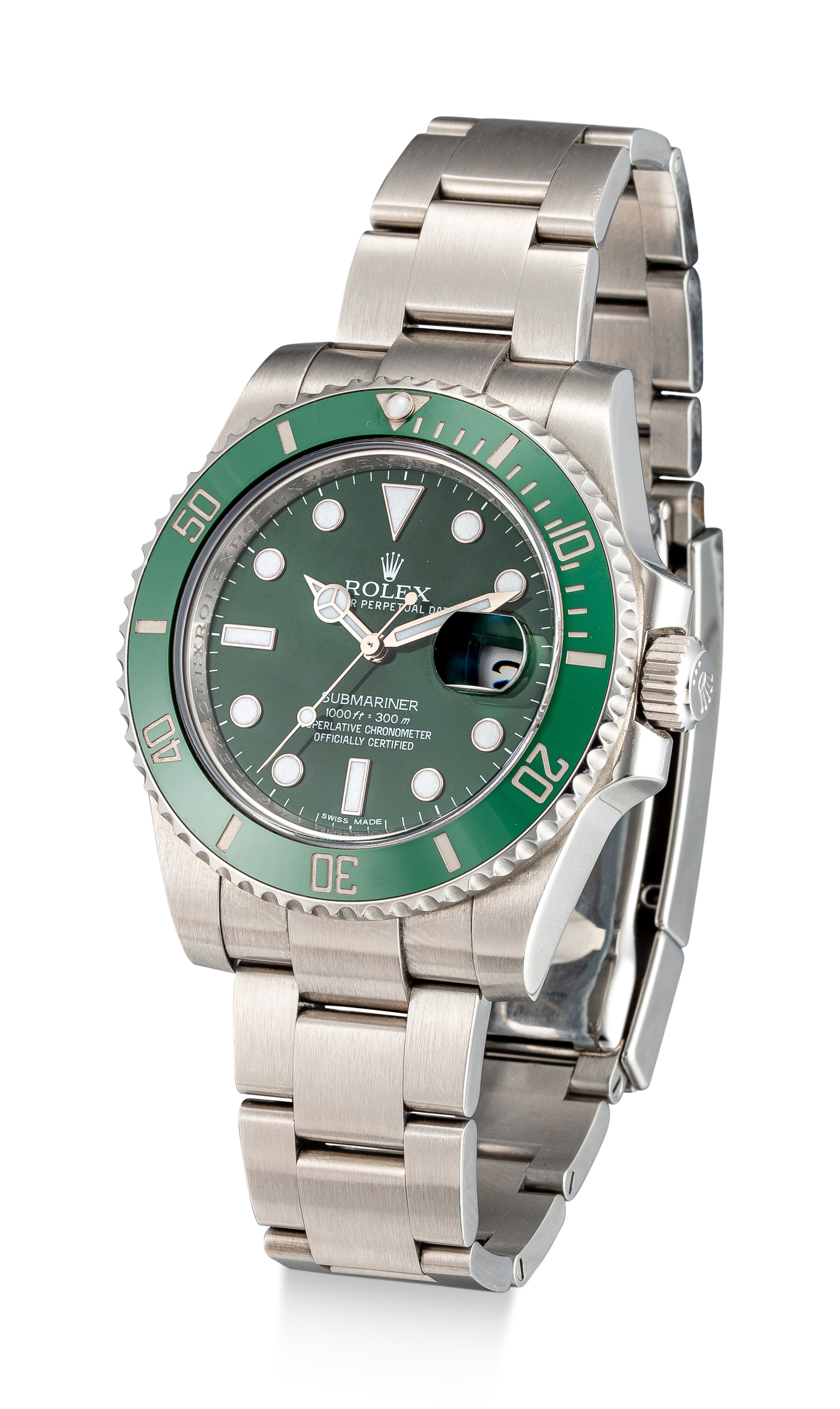 Reference 116610LV Submariner "Hulk"A stainless steel wristwatch with date and bracelet, Circa 2015Dial: greenCaliber: cal. 3135 automatic, 31 jewelsCase: stainless steel, screw down case backCase number: 460408F9Closure: stainless steel Rolex Oyster bracelet and folding clasp Size: 40 mm diameter, bracelet circumference approximately 185 mmSigned: case, dial and movementAccessories: Rolex Guarantee Card