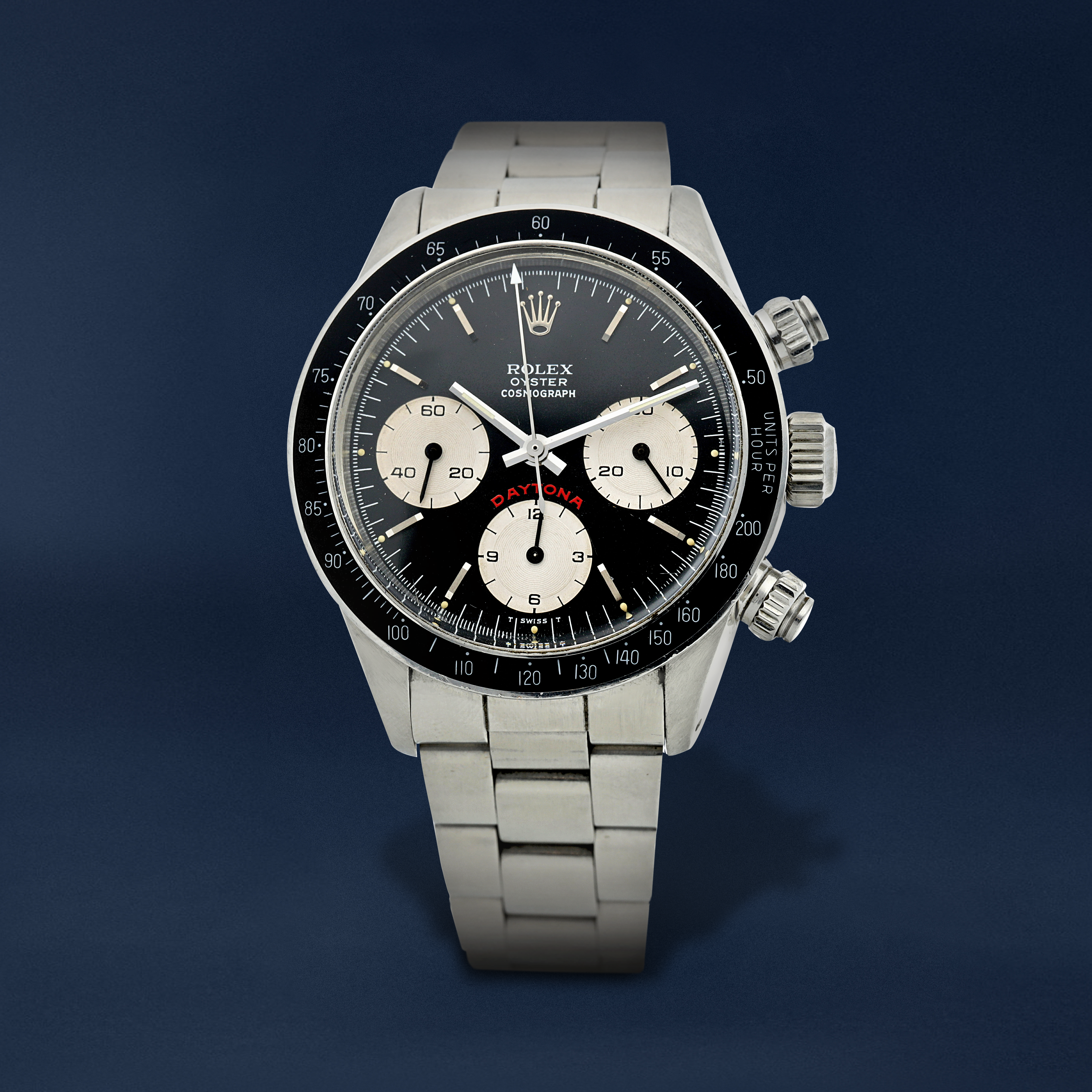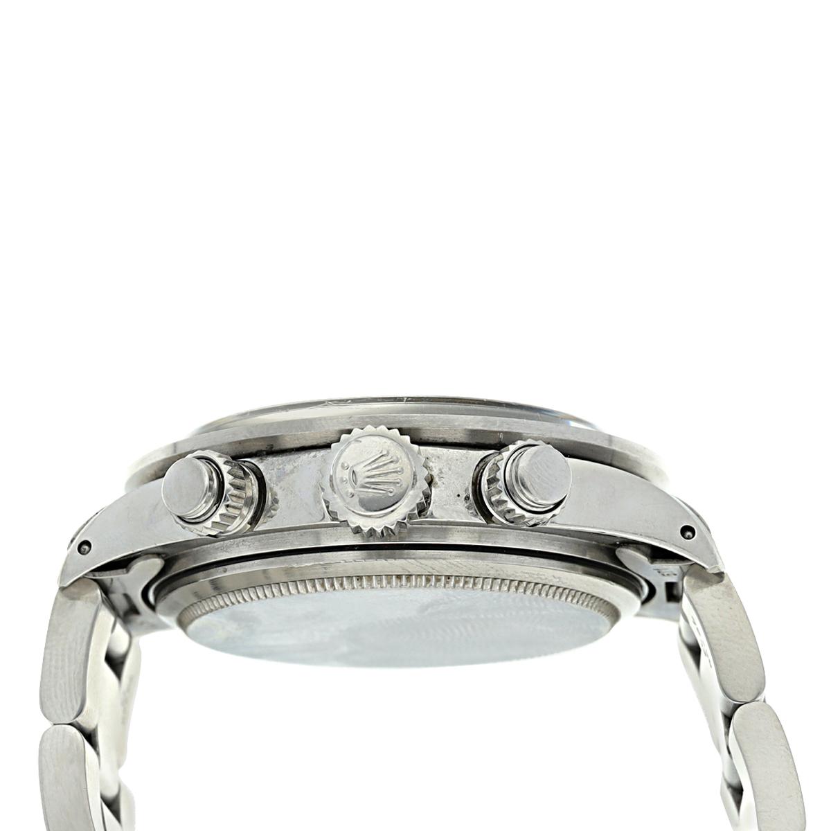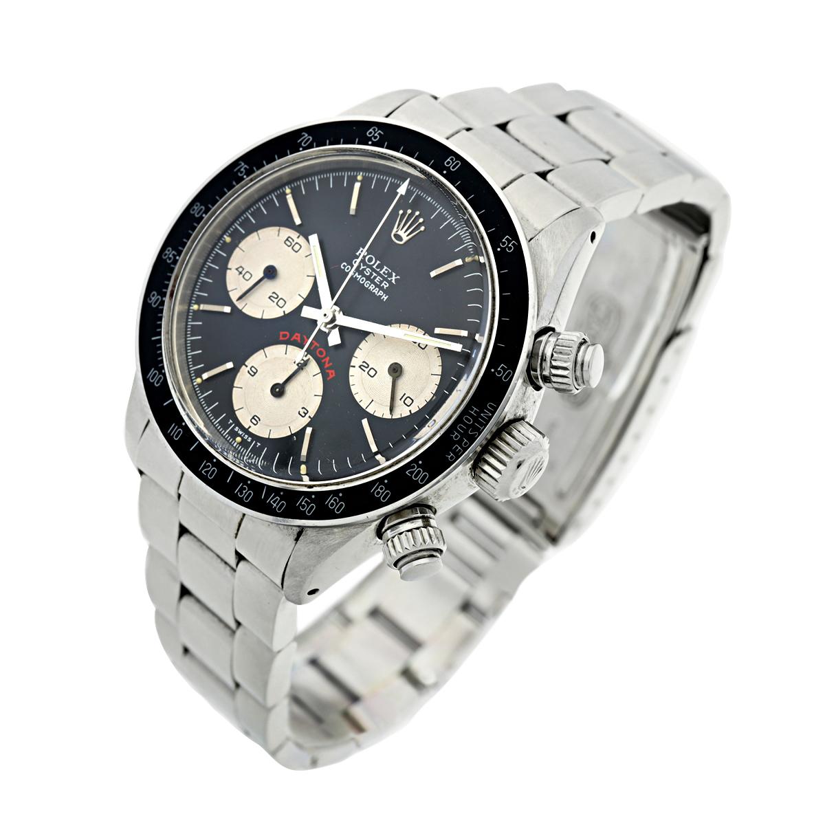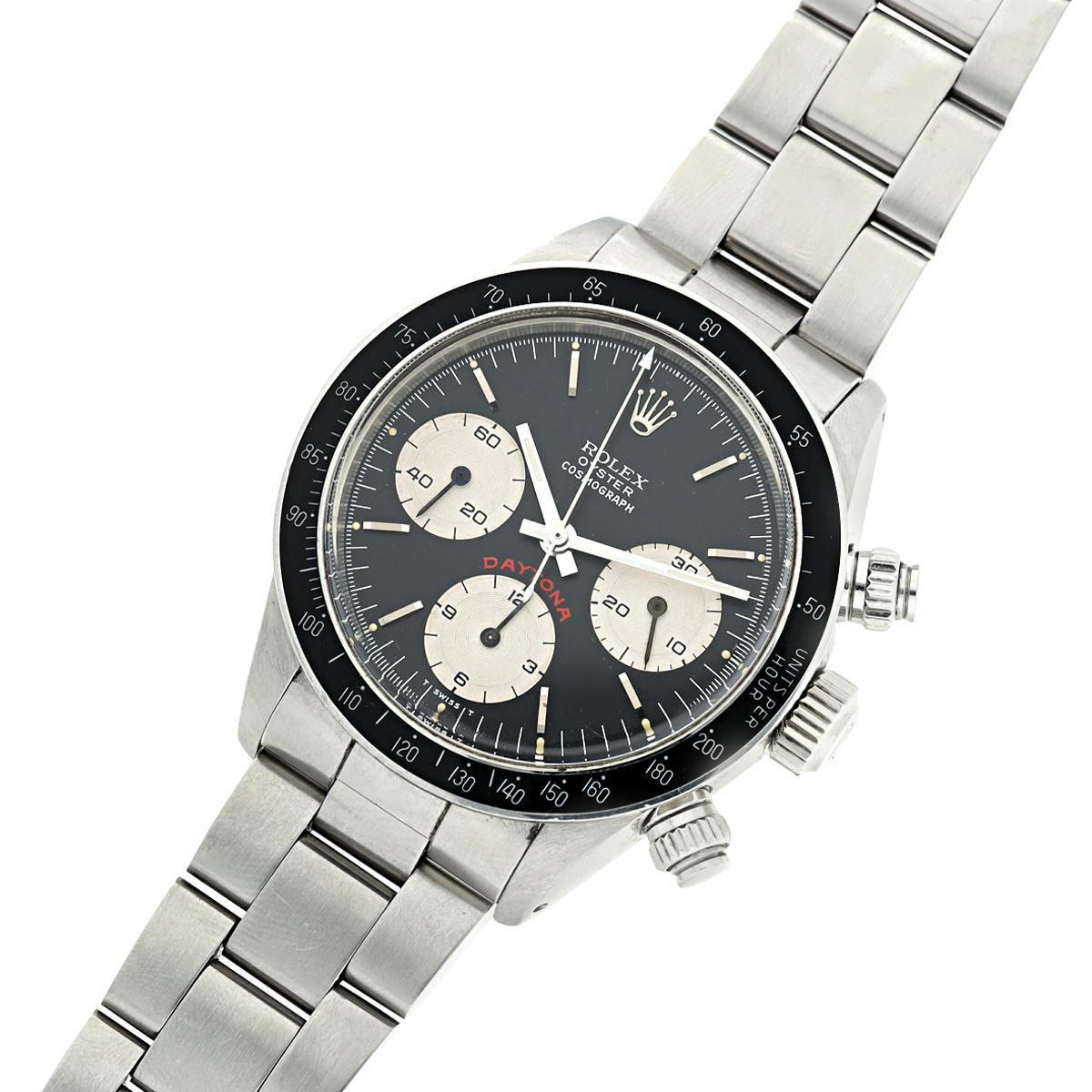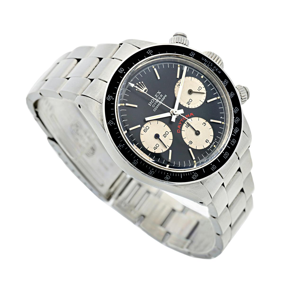 Reference 6263 Daytona 'Big Red'A stainless steel chronograph wristwatch with bracelet, Circa 1985Dial: blackCaliber: cal. 727 mechanical, 17 jewelsCase: stainless steel, screw down case backCase number: 8'782'370Closure: stainless steel Rolex Oyster bracelet end links stamped 571, 78350Size: 38 mm diameter, bracelet circumference approximately 185 mmSigned: case, dial and movementBox: noPapers: yesAccessories: Rolex warranty paper (undated) and product literature