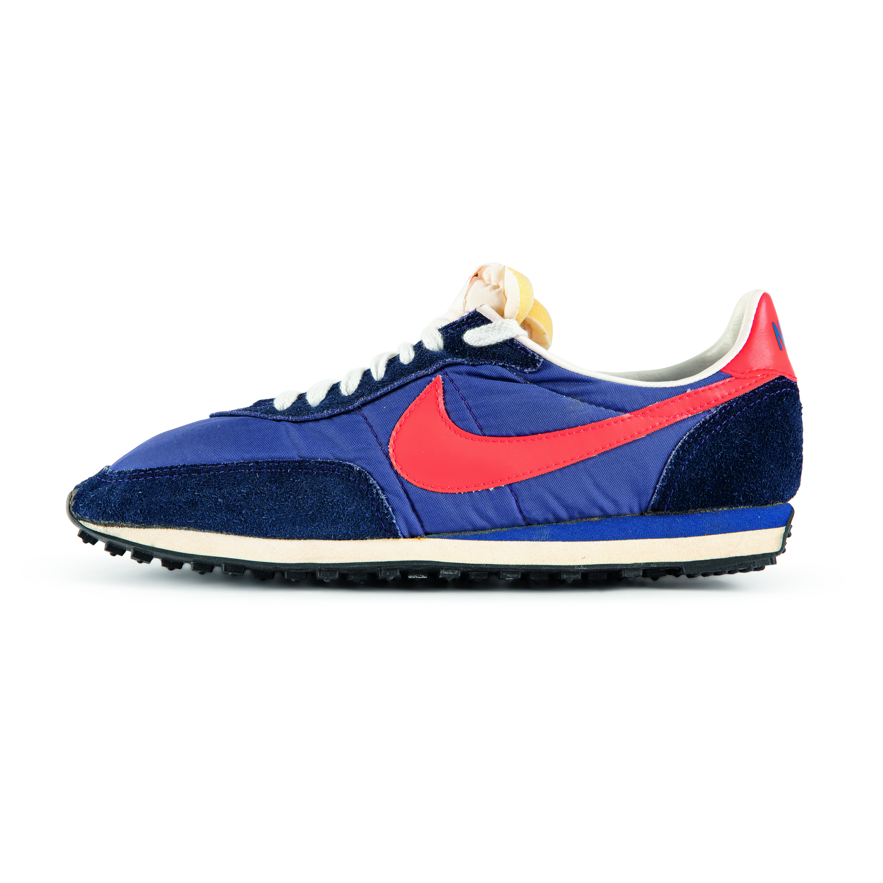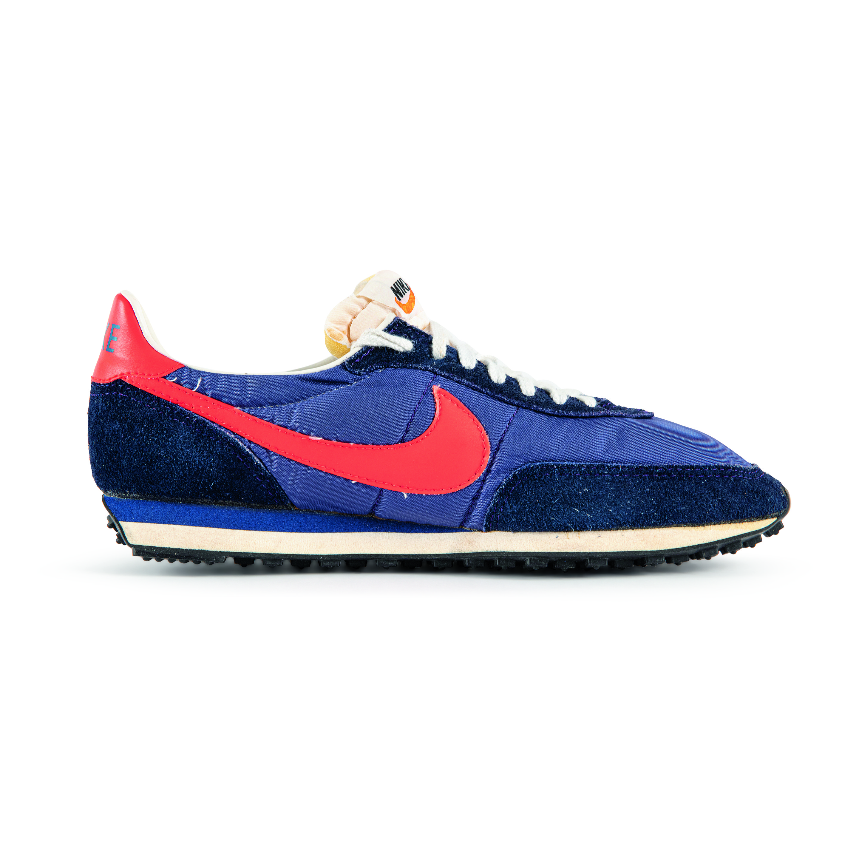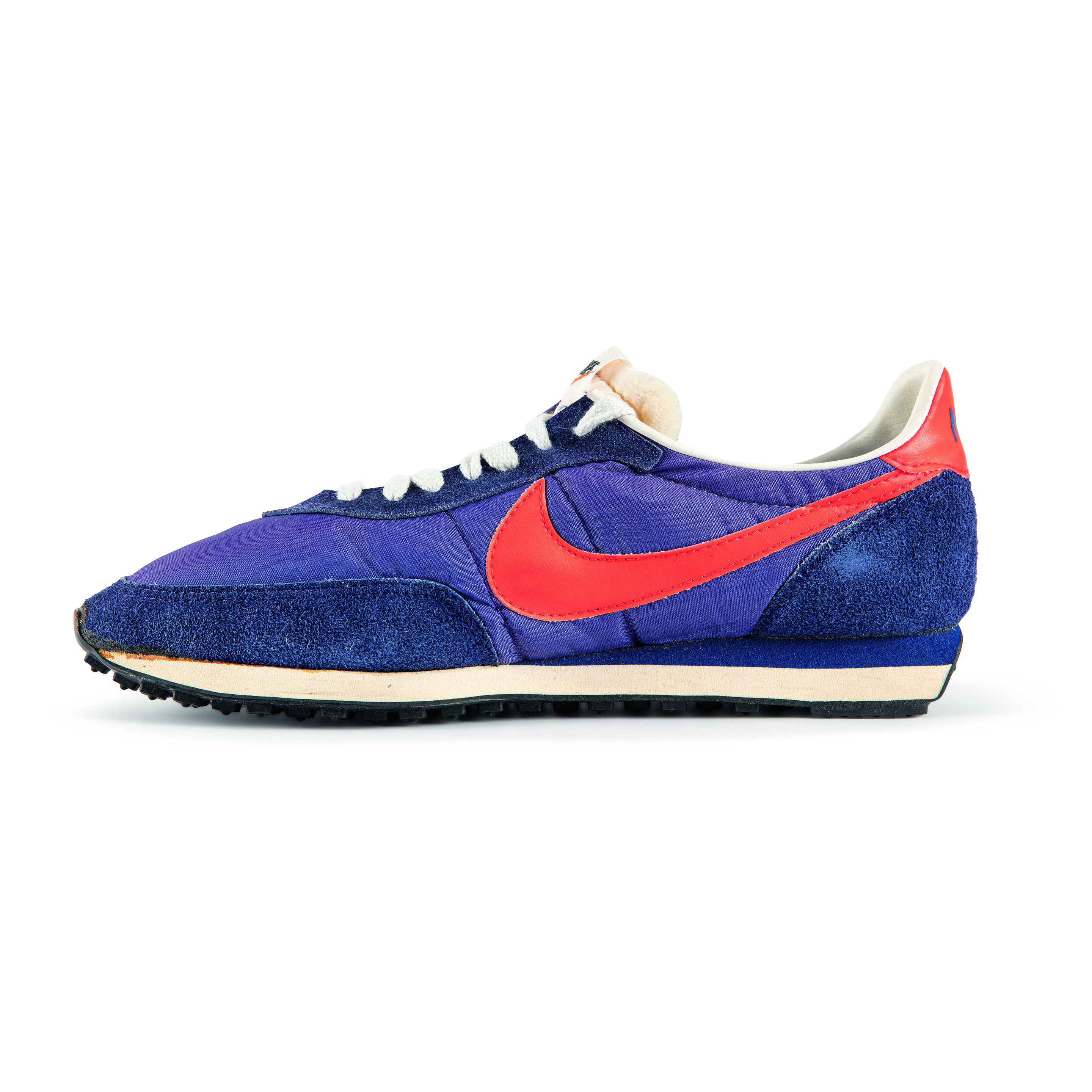 The Waffle II is an updated version of the first Waffle Trainer with a wider heel flare and padded Achilles protectors. The iconic waffle was named for the patented waffle iron-like pattern of the rubber outsole which Nike co-founder Bill Bowerman developed after being inspired by his wife’s waffle iron. The raised grid of polygon nubs increased stabilization with gripping edges that improved traction on multiple surfaces, without the need for metal spikes. Nylon used for the upper created light-weight durability.An original Waffle II from 1979.Dark blue nylon upper and suede heel counter, orange Swoosh and heel tab with bold Nike lettering.Insoles feature vibrant blue Spenco sockliners.Nike black and orange logo tongue tags.Waffle soles labeled with two US patents 3793750 for the waffle nubs on the outsoles and 4098011 for the pattern at the back of the soles under the heel. Style Number: 2243This item is final sale and not eligible for return.