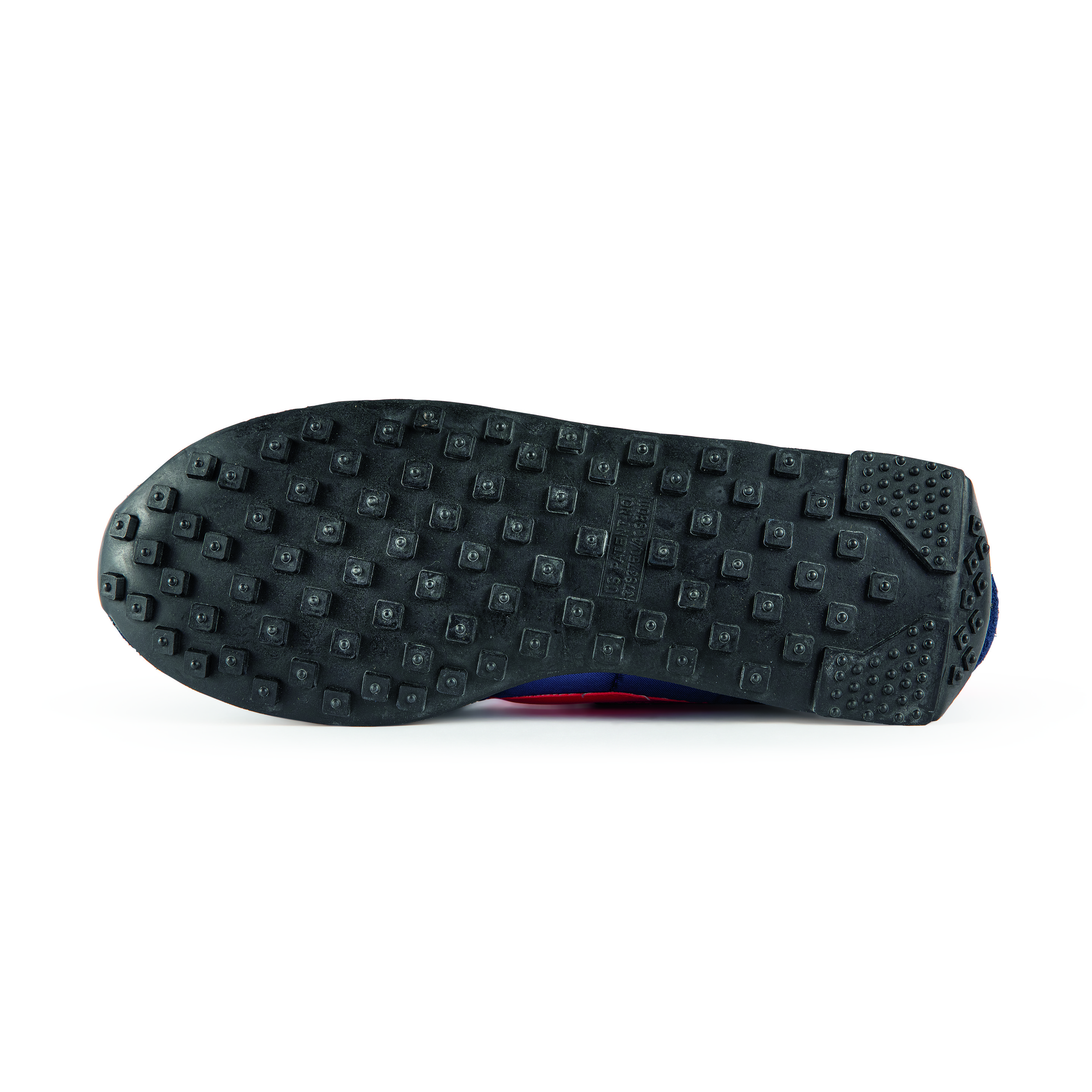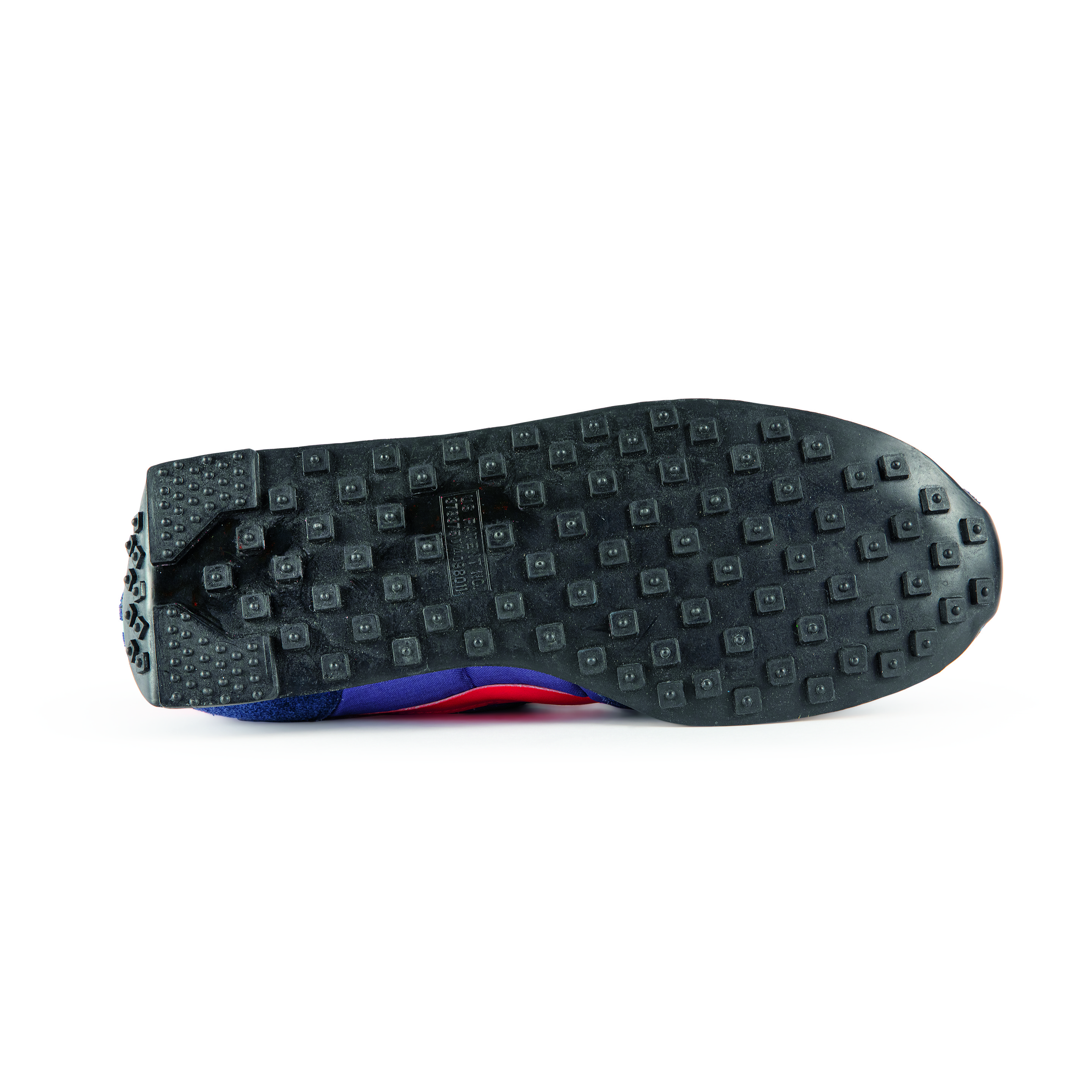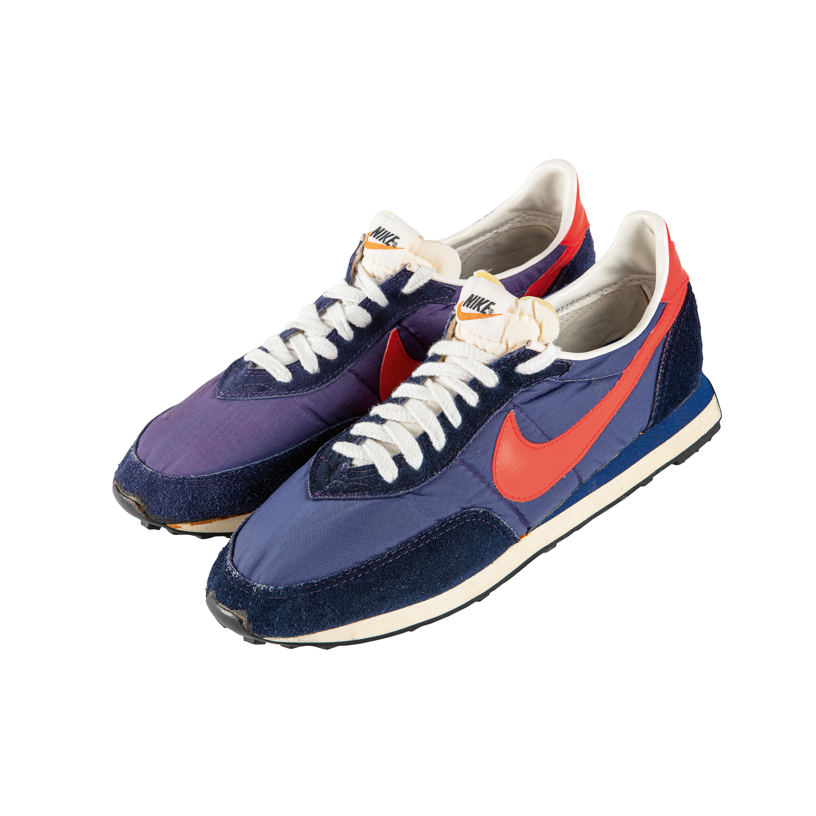 The Waffle II is an updated version of the first Waffle Trainer with a wider heel flare and padded Achilles protectors. The iconic waffle was named for the patented waffle iron-like pattern of the rubber outsole which Nike co-founder Bill Bowerman developed after being inspired by his wife’s waffle iron. The raised grid of polygon nubs increased stabilization with gripping edges that improved traction on multiple surfaces, without the need for metal spikes. Nylon used for the upper created light-weight durability.An original Waffle II from 1979.Dark blue nylon upper and suede heel counter, orange Swoosh and heel tab with bold Nike lettering.Insoles feature vibrant blue Spenco sockliners.Nike black and orange logo tongue tags.Waffle soles labeled with two US patents 3793750 for the waffle nubs on the outsoles and 4098011 for the pattern at the back of the soles under the heel. Style Number: 2243This item is final sale and not eligible for return.