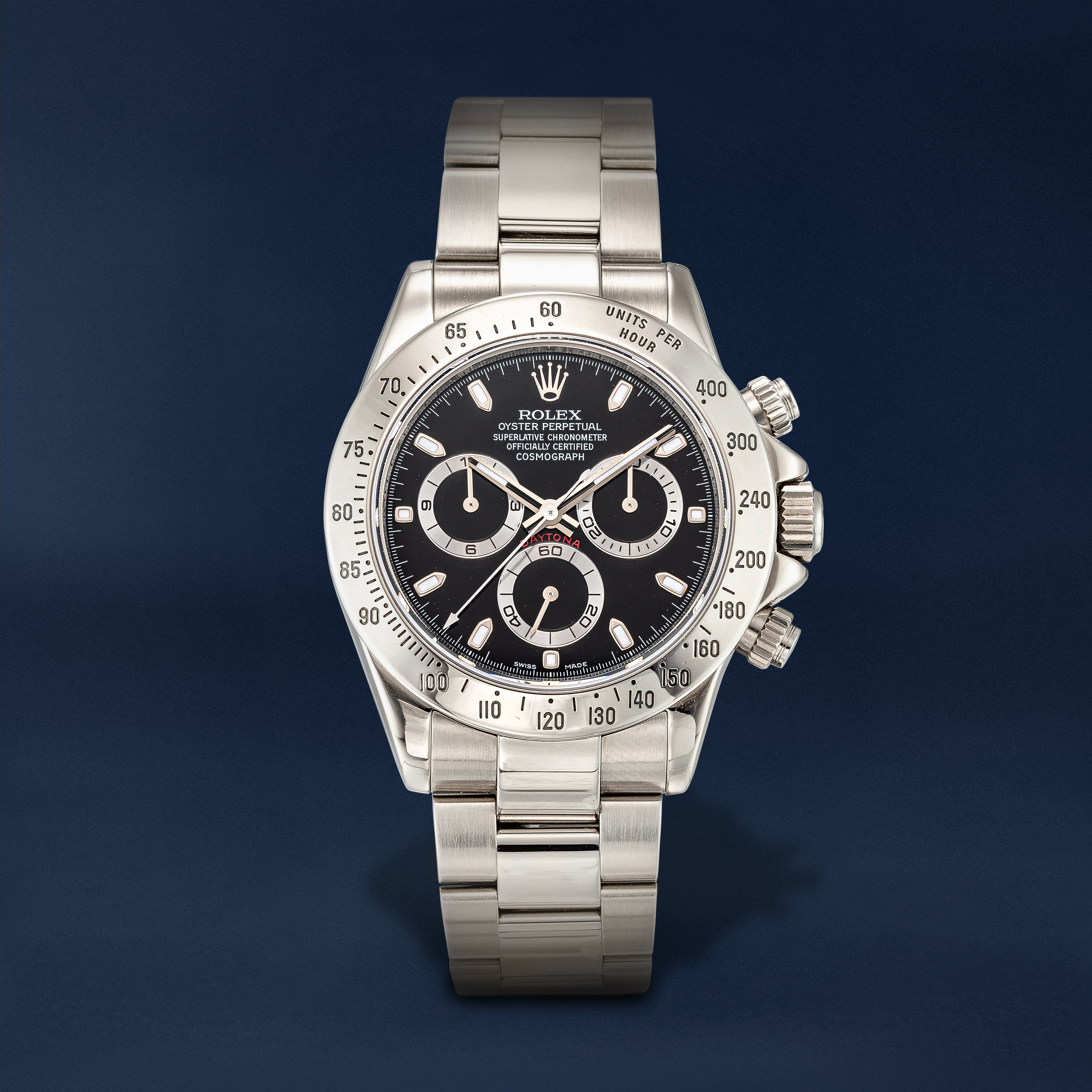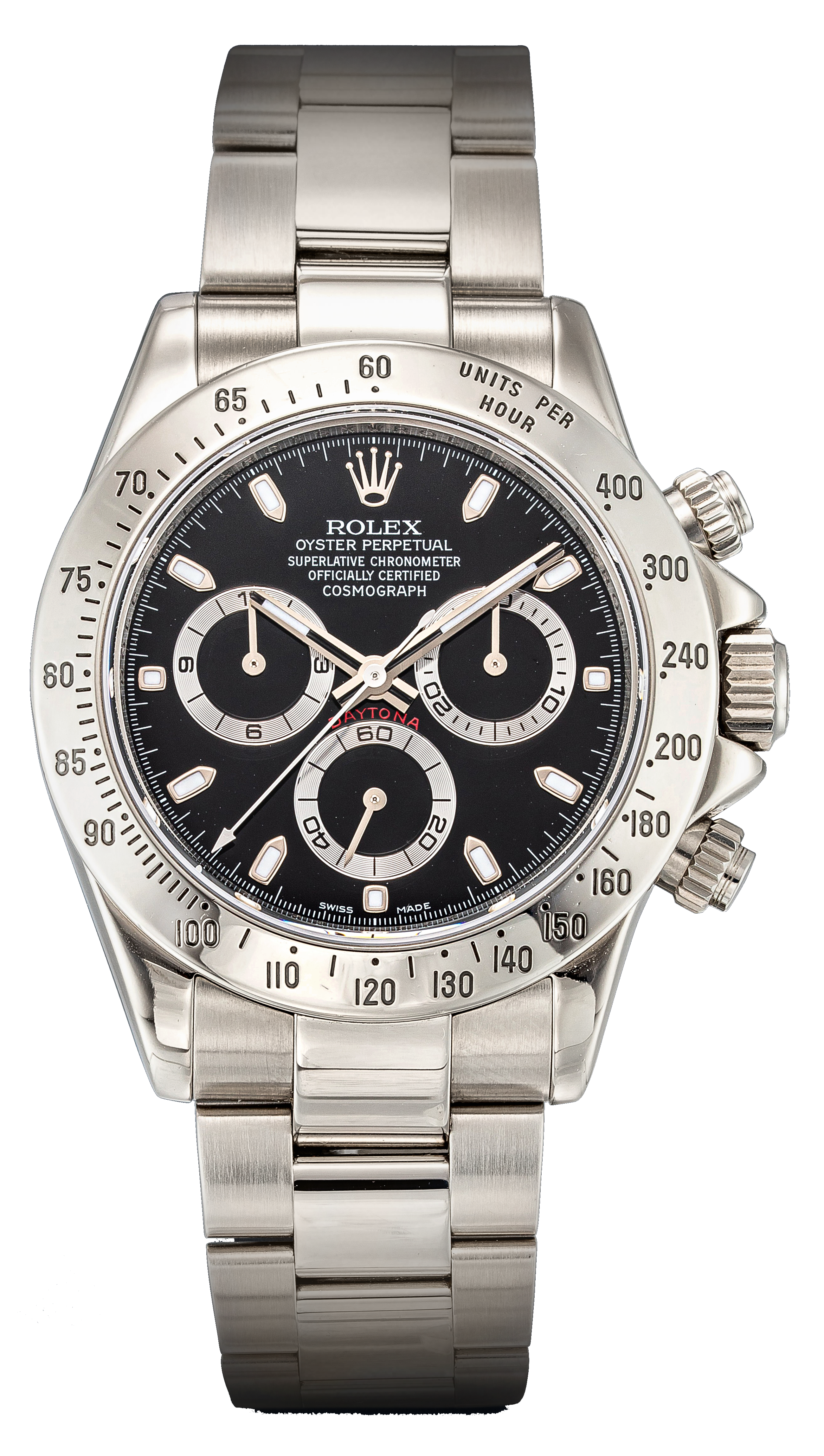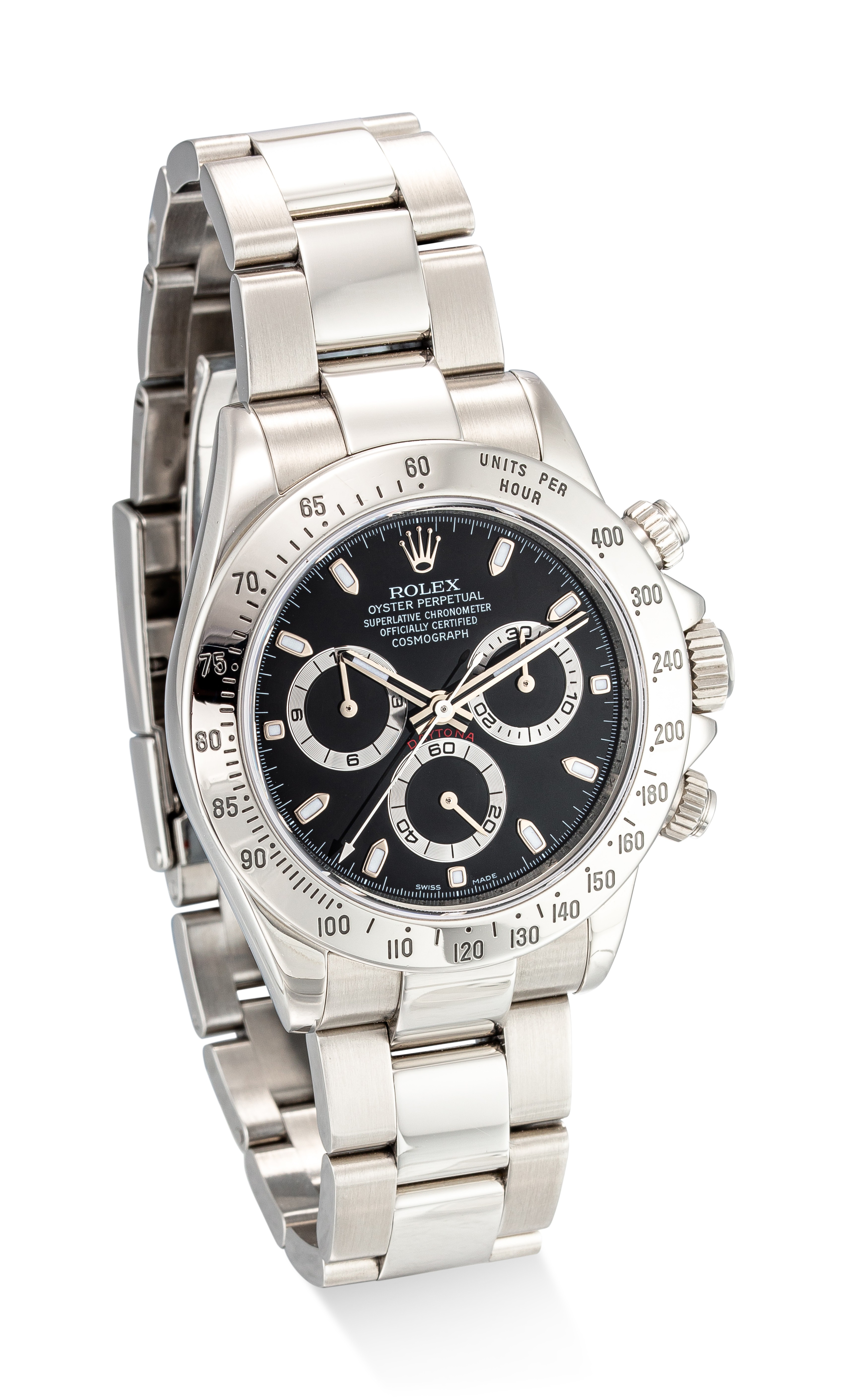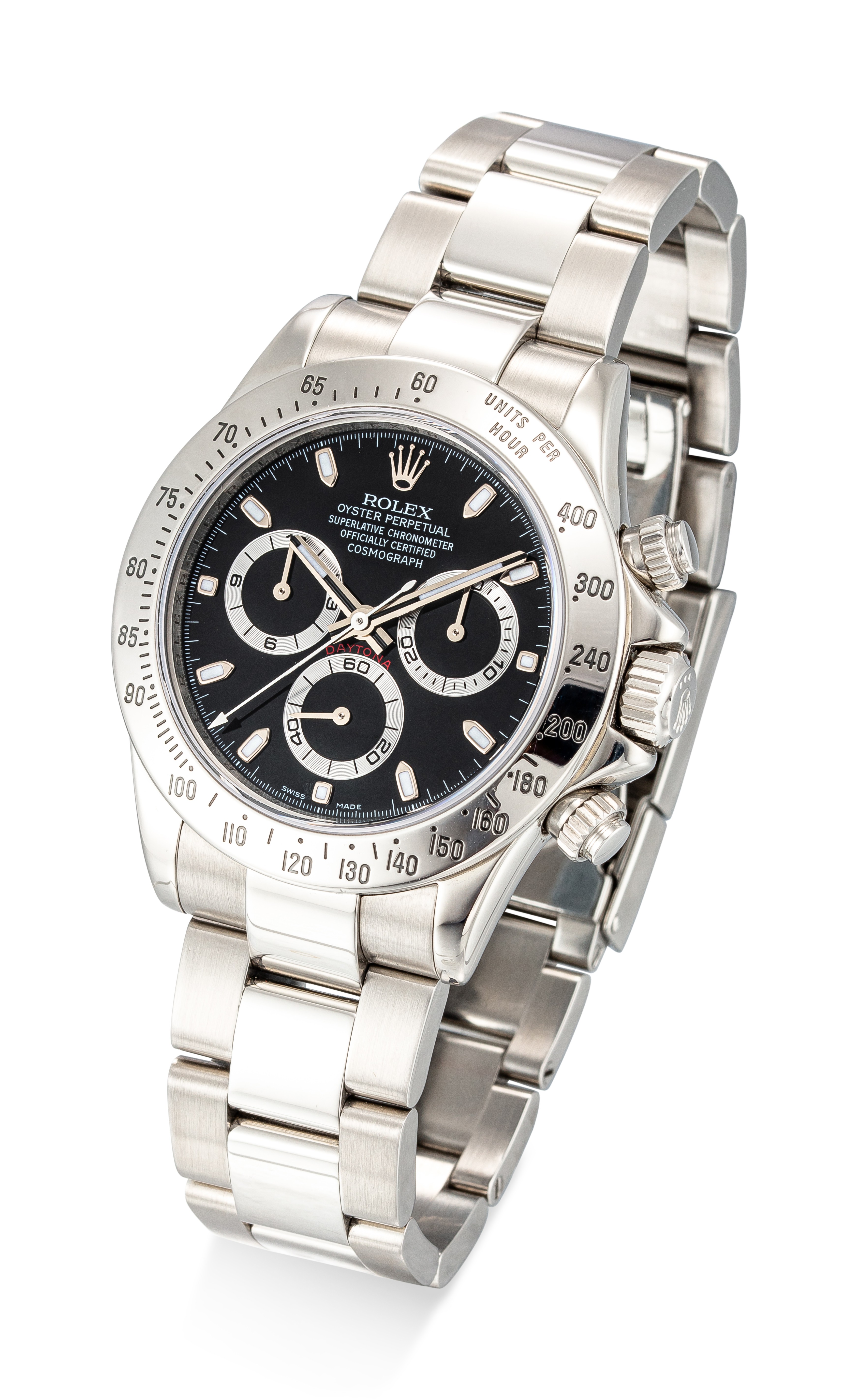Daytona, Reference 116520A Stainless Steel Automatic Chronograph Wristwatch with Bracelet, circa 2006Dial: blackCaliber: cal. 4130 automatic, 44 jewelsCase: stainless steel, screw down case backCase number: Z'697'469Closure: stainless steel Rolex Oyster bracelet with folding claspSize: diameter 40 mm, bracelet circumference approximately 205 mmSigned: case, dial and movementAccessories: Rolex presentation box, product literature, service paperwork